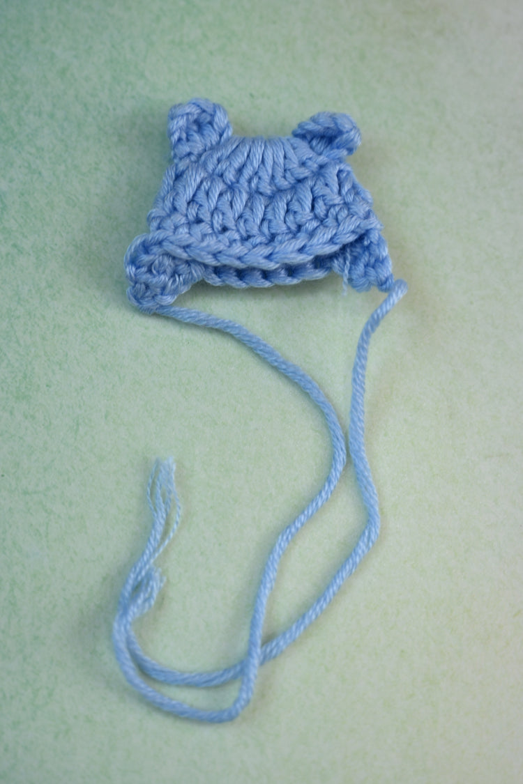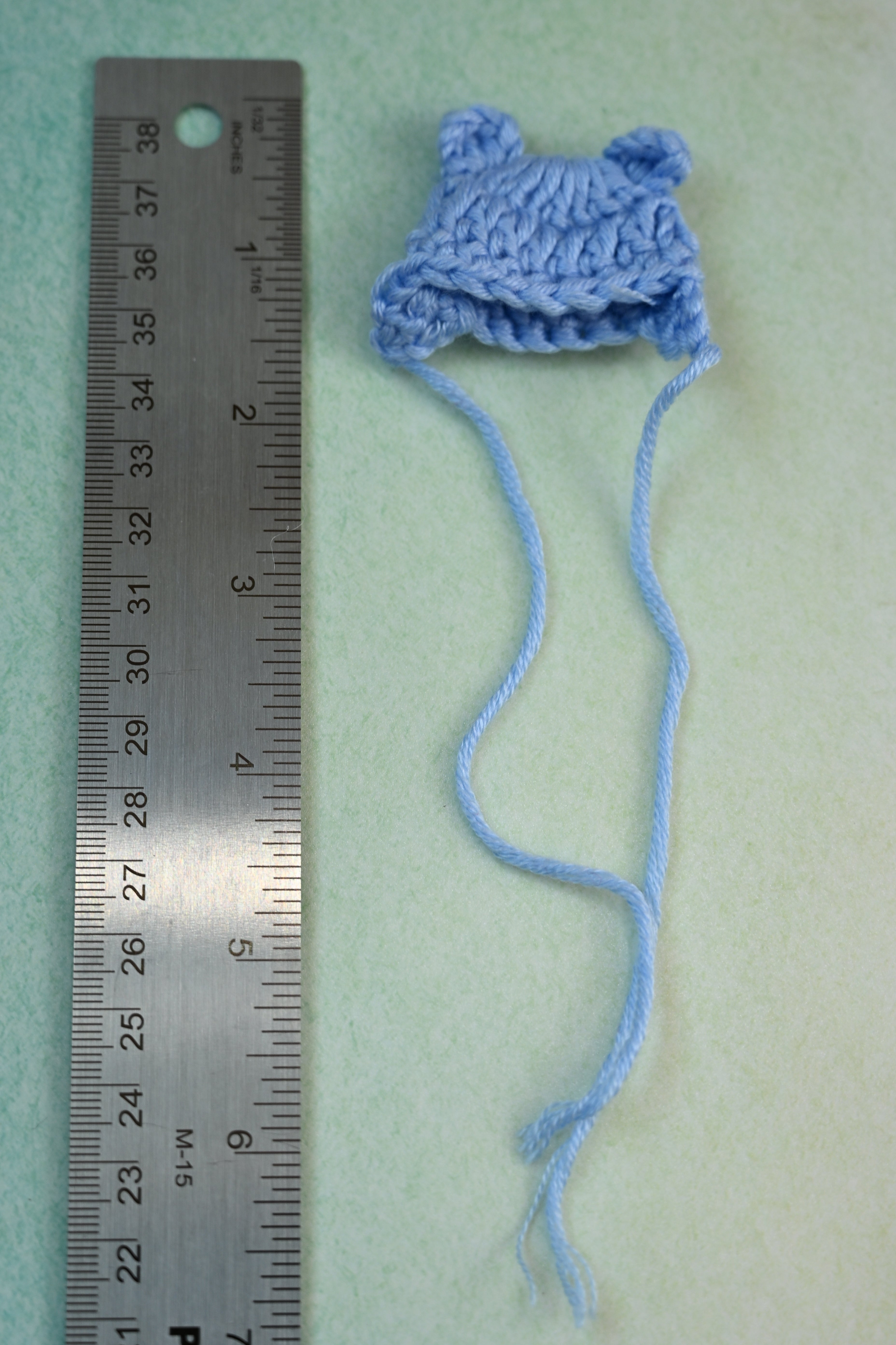 This adorable knitted blue hat with bear ears is perfect to keep your little one warm. This hat is sized for 3" dolls.