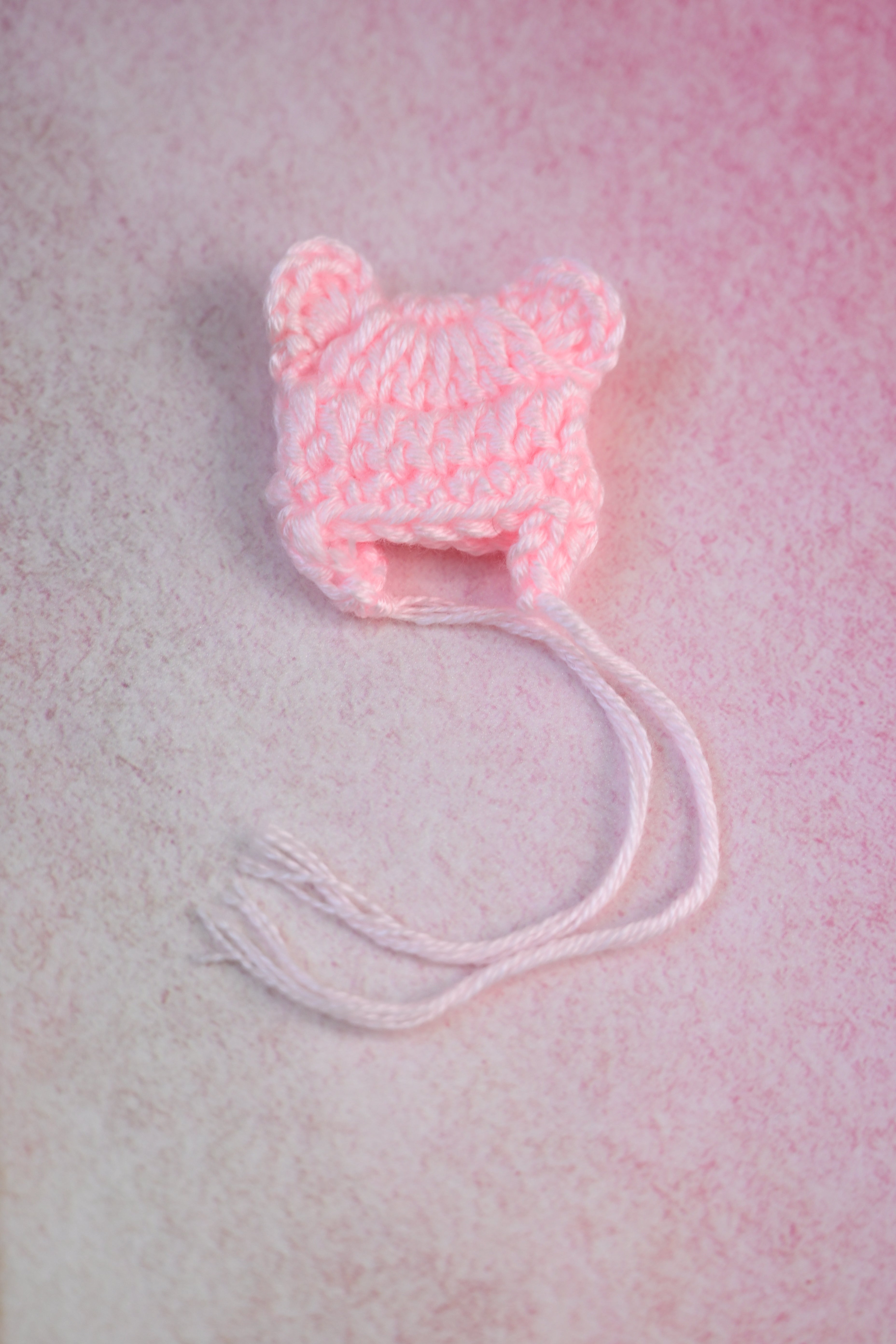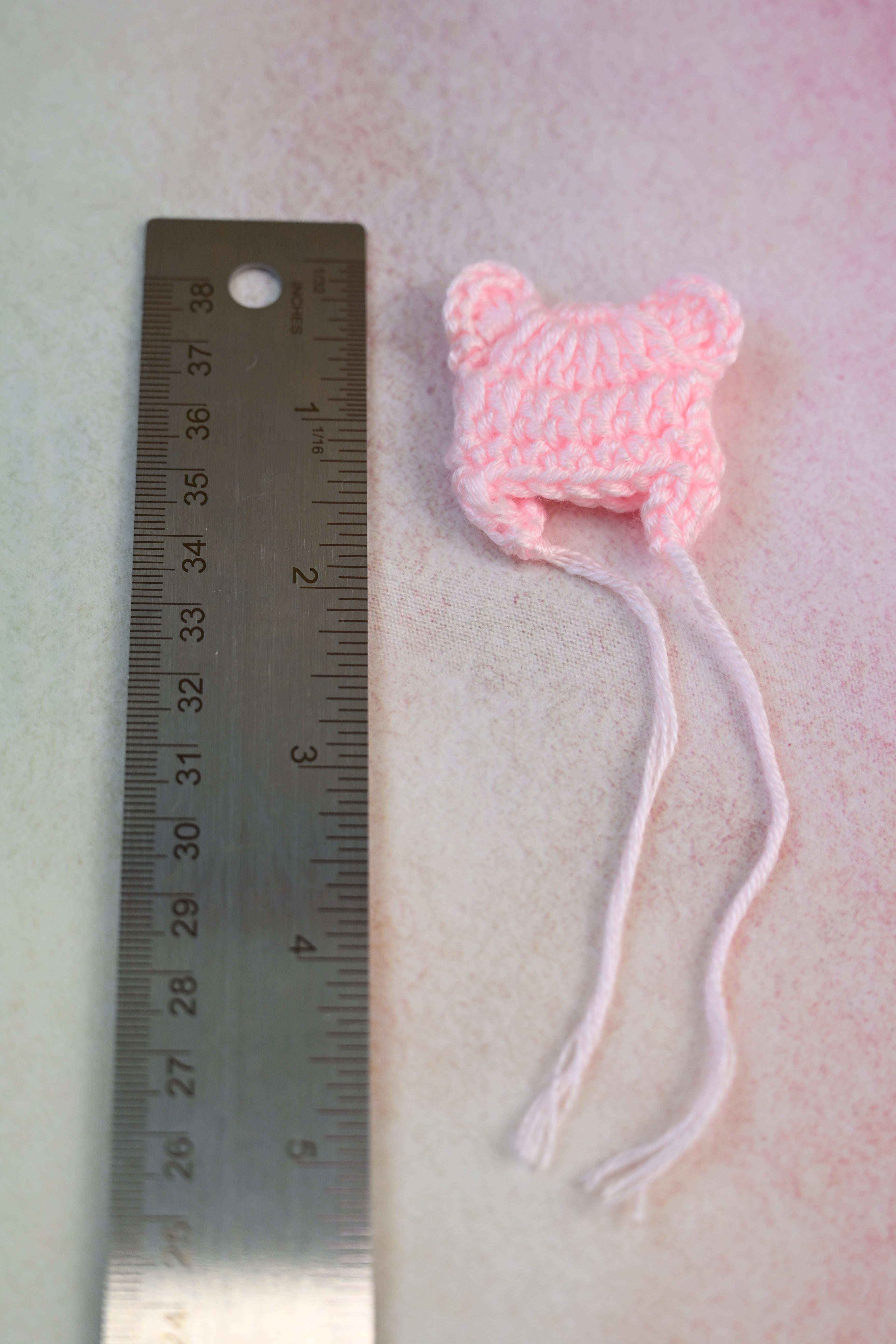 This adorable knitted light pink hat with bear ears is perfect to keep your little one warm! This hat is sized for 3" dolls.