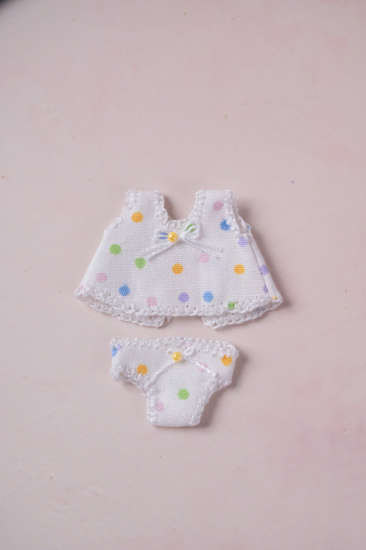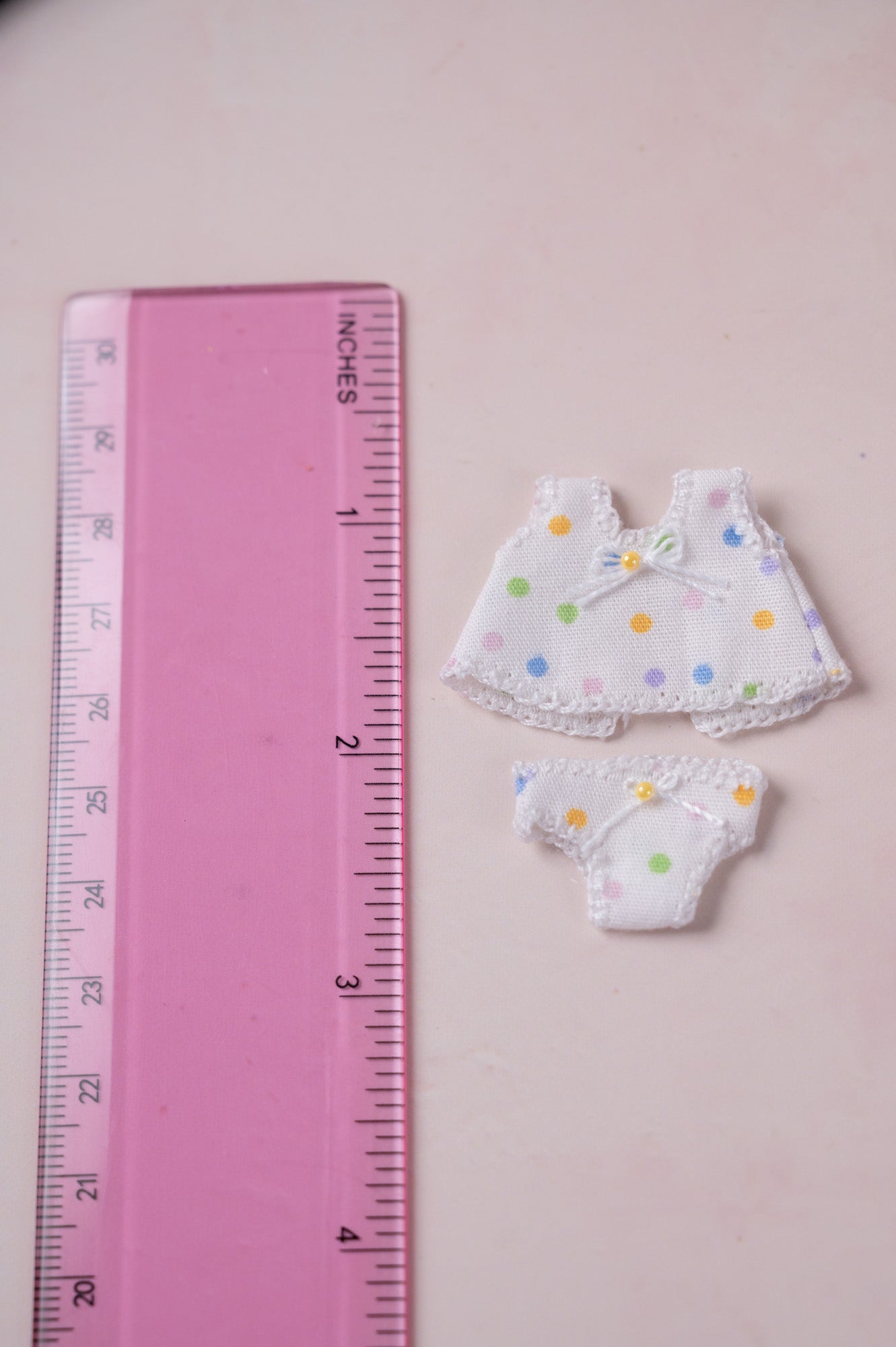 This adorable polka dot dress set comes with a matching diaper cover and is adorned with cute bows. This outfit is sized for 2 inch dolls.