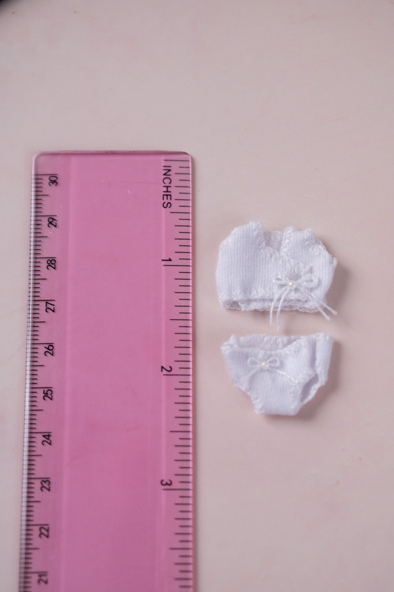 This adorable white set comes with a fold over shirt and matching diaper cover, both adorned with cute bows. It's sized for 2 inch dolls.