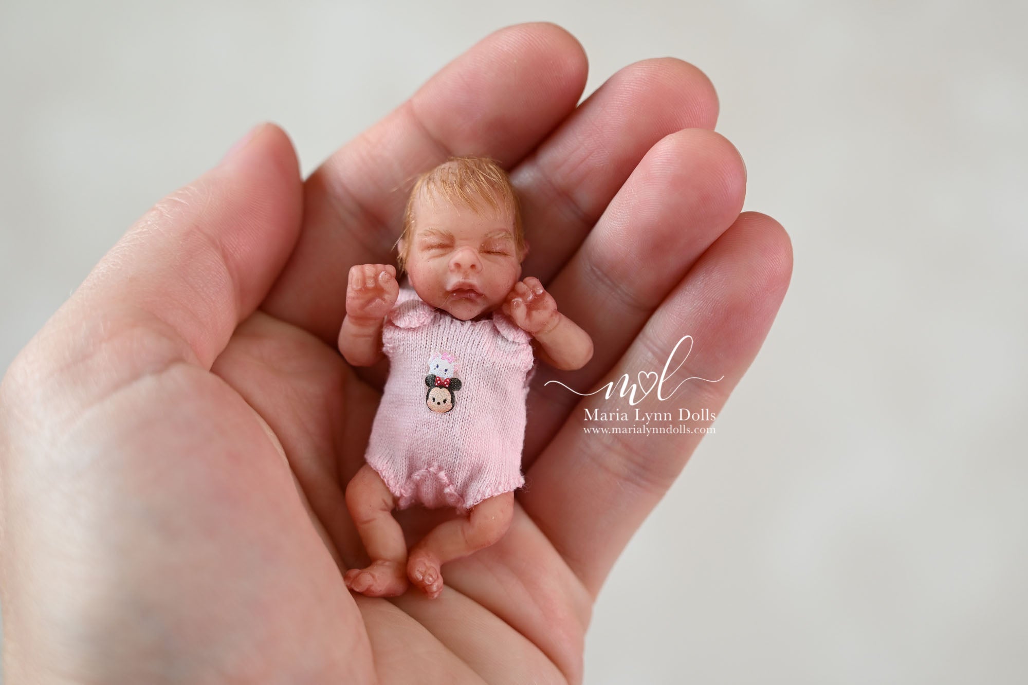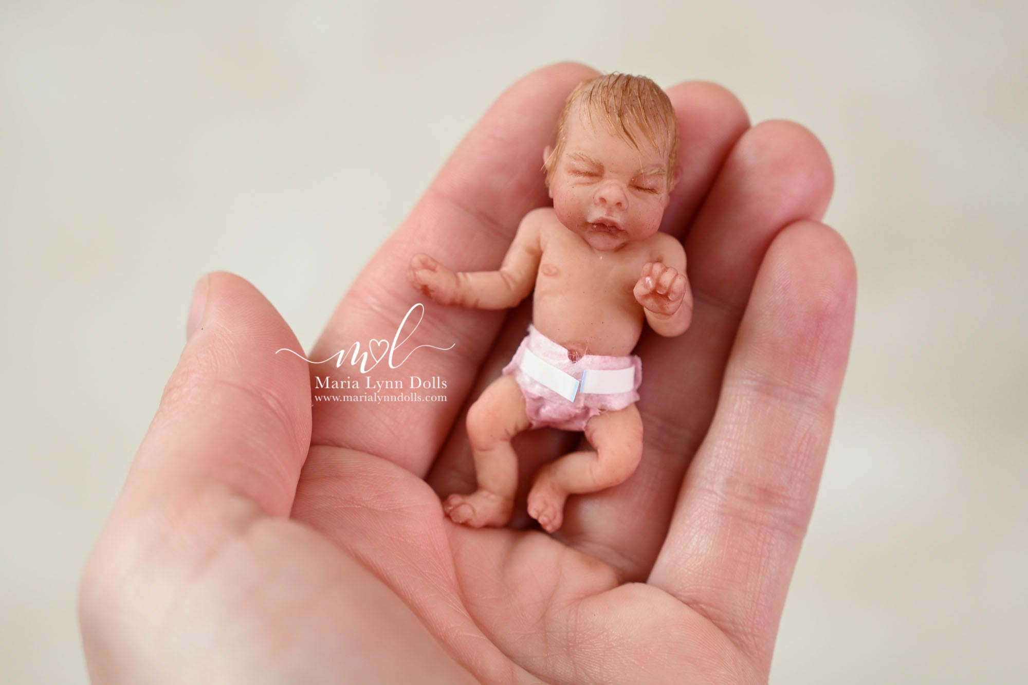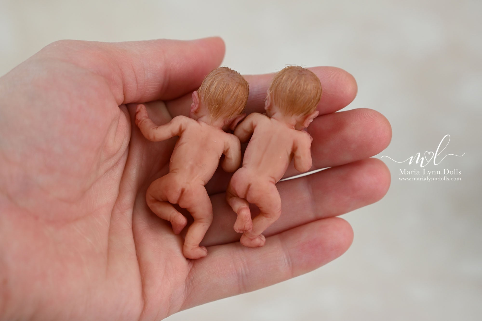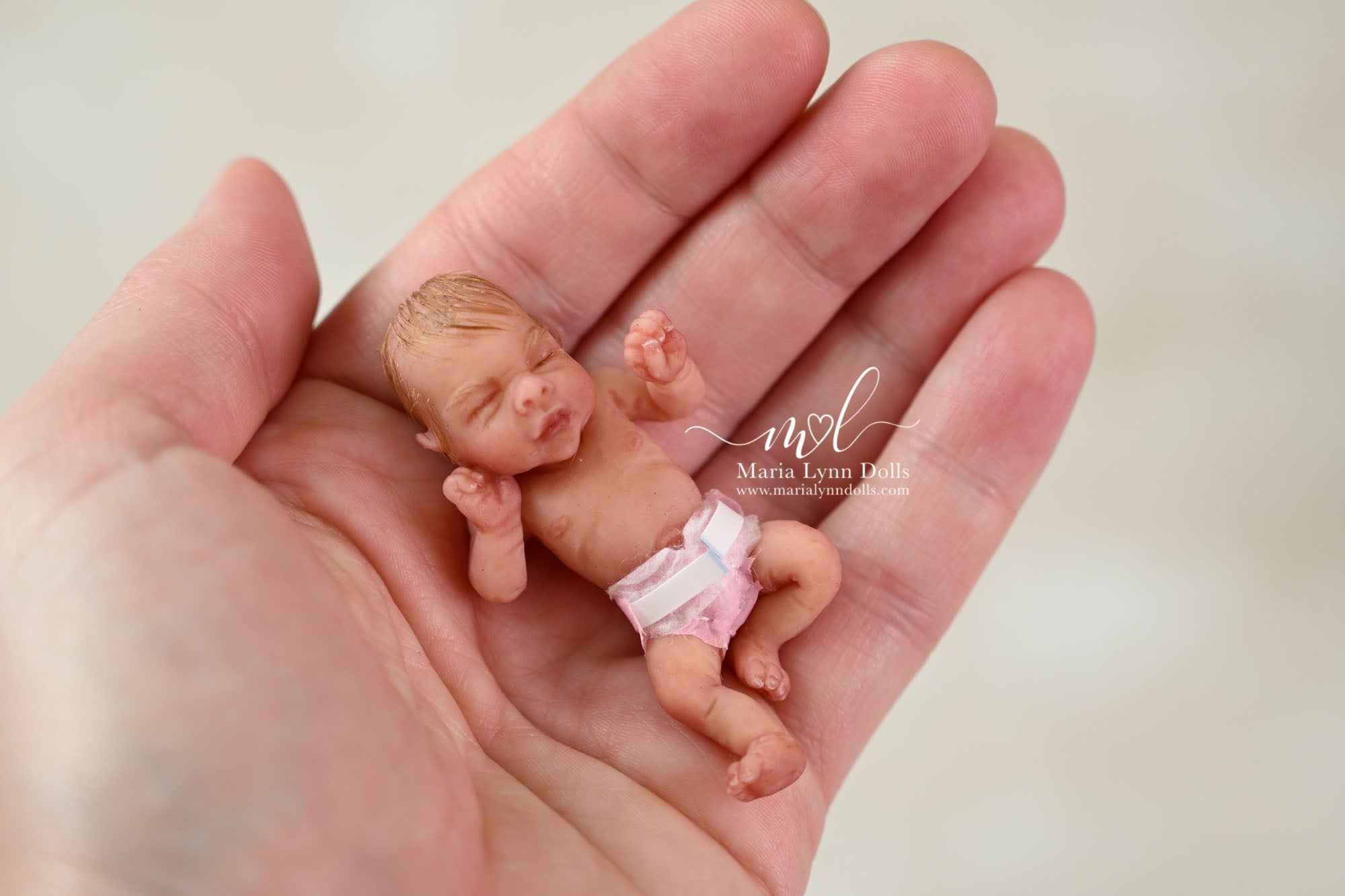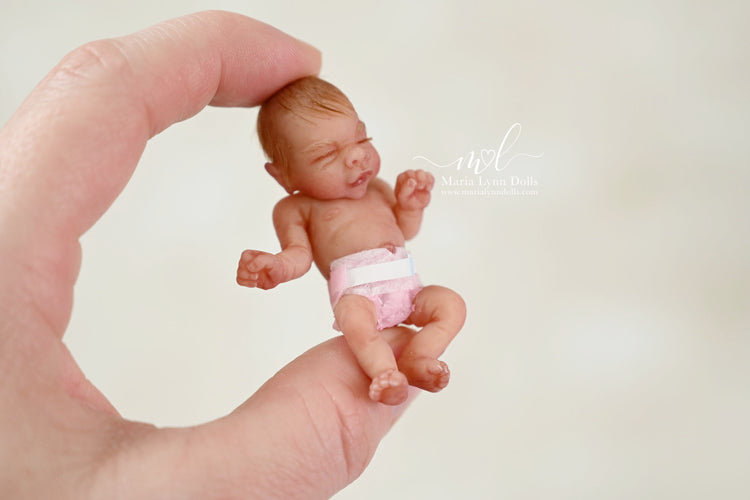 This teeny tiny Gretal (girl) sculpted by Shy Mrofka, has been painted by Maria Lynn. She has a tiny head of strawberry blond rooted hair and dainty rooted eyelashes. Gretal is about 2 inches long (barely 2.25" if stretched out straight) and is poured in a soft, squishable soft blend silicone. She has armatures in her arms and legs for extra ability to pose as well.