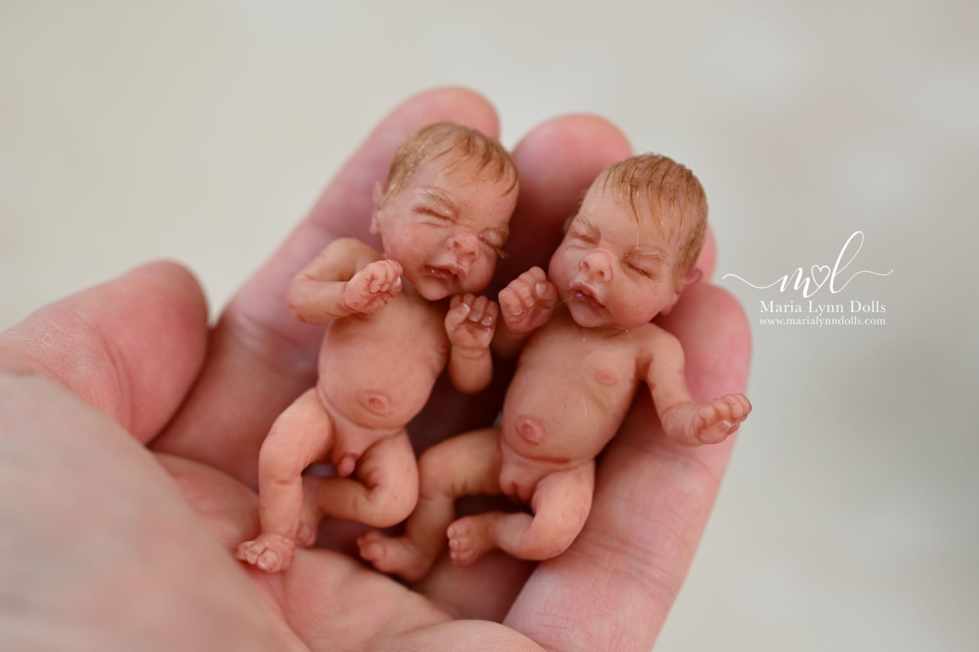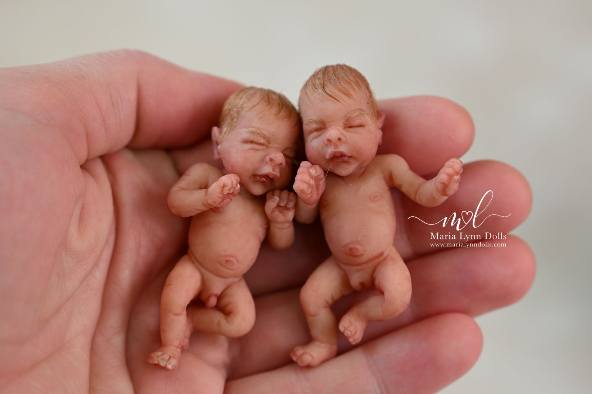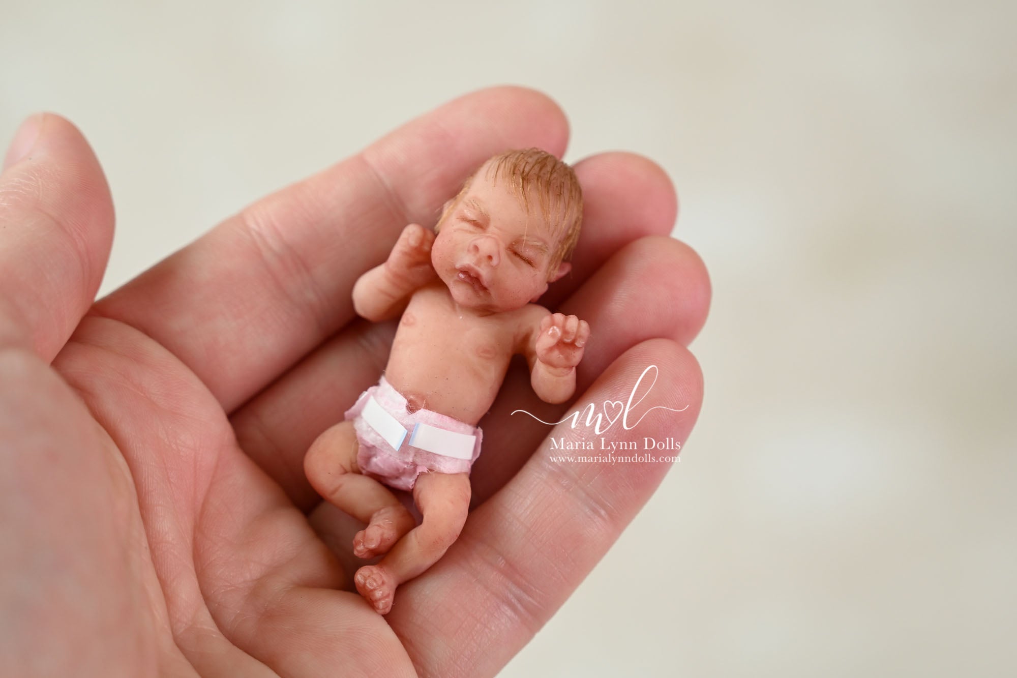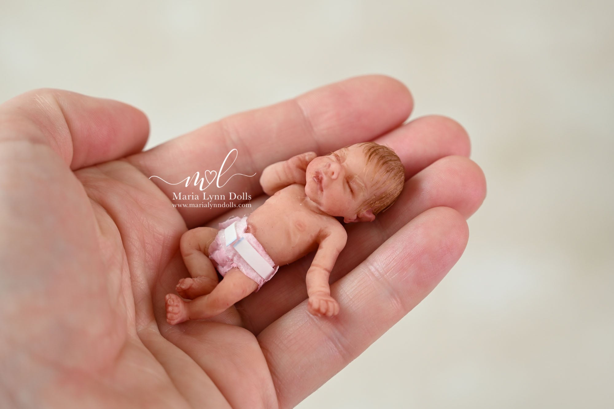 This teeny tiny Gretal (girl) sculpted by Shy Mrofka, has been painted by Maria Lynn. She has a tiny head of strawberry blond rooted hair and dainty rooted eyelashes. Gretal is about 2 inches long (barely 2.25" if stretched out straight) and is poured in a soft, squishable soft blend silicone. She has armatures in her arms and legs for extra ability to pose as well.