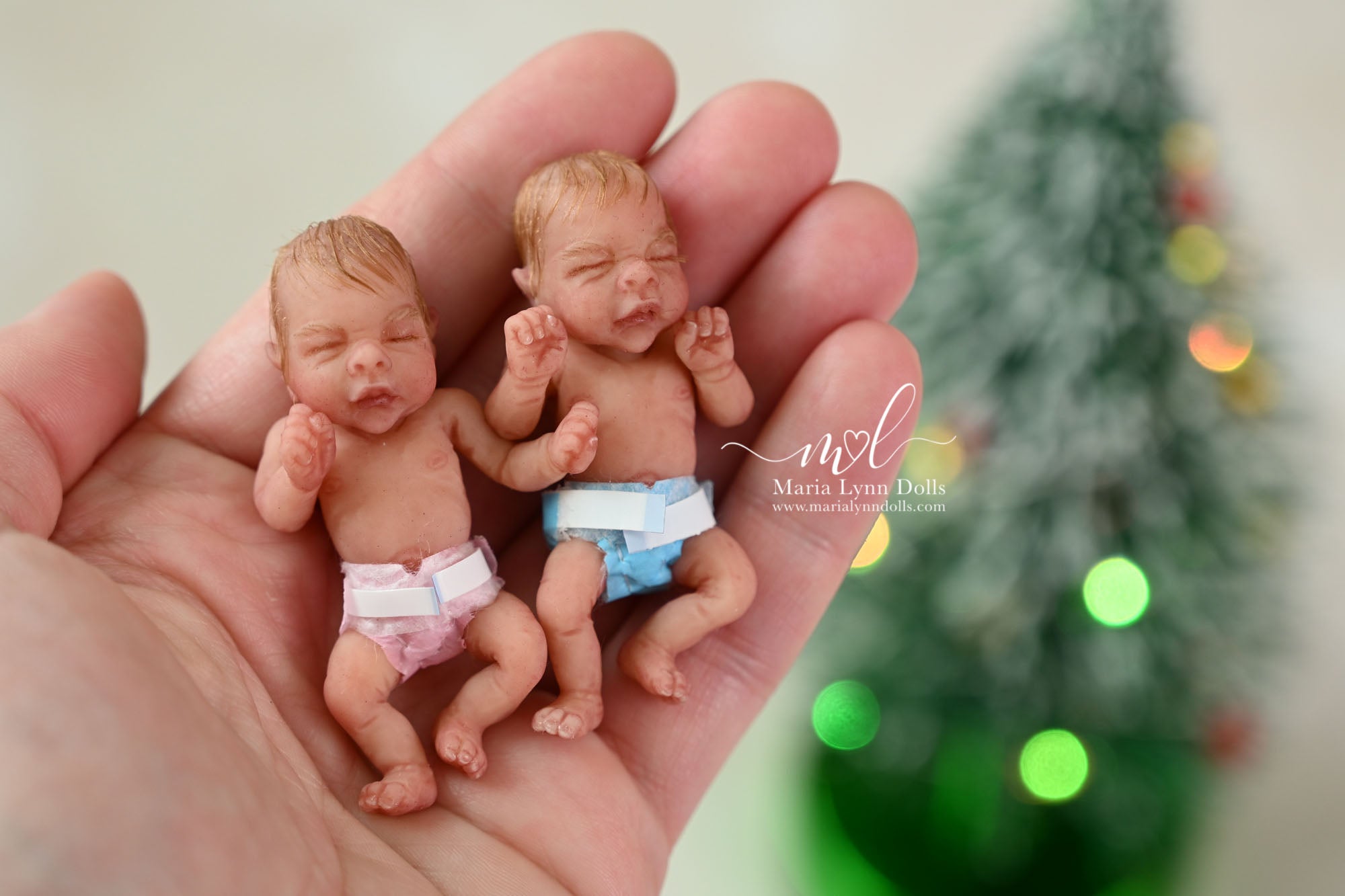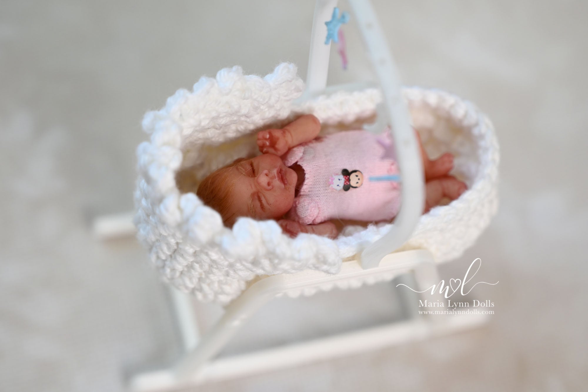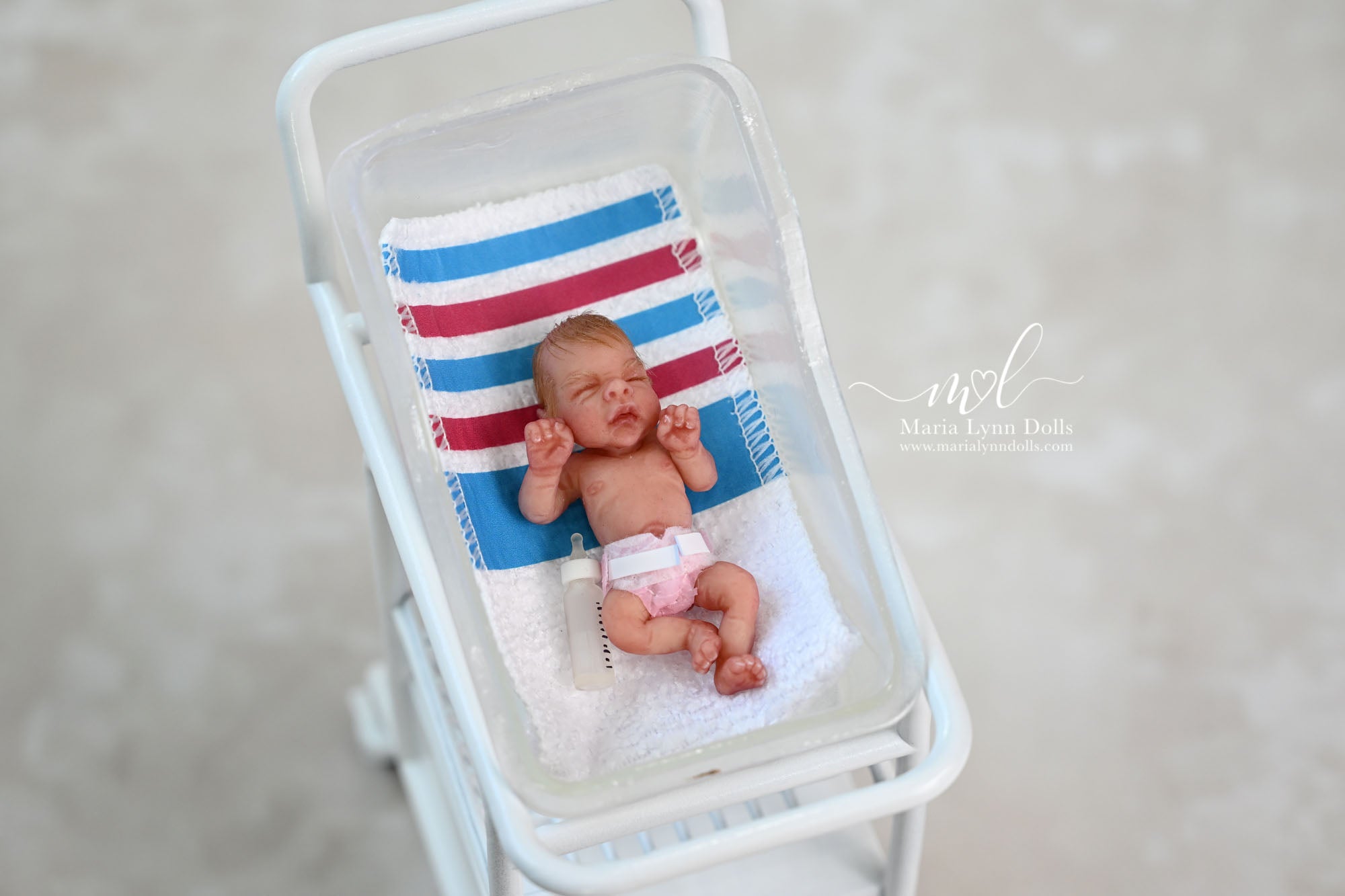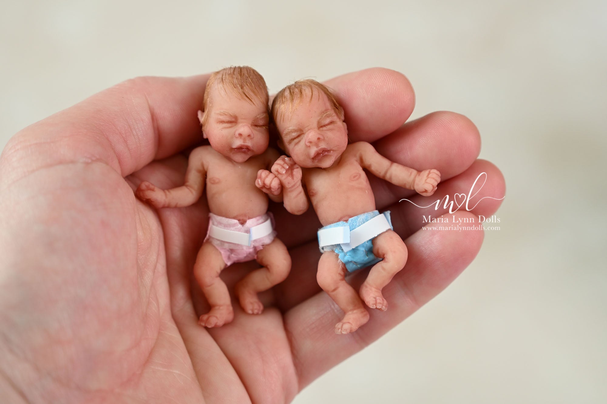 This teeny tiny Gretal (girl) sculpted by Shy Mrofka, has been painted by Maria Lynn. She has a tiny head of strawberry blond rooted hair and dainty rooted eyelashes. Gretal is about 2 inches long (barely 2.25" if stretched out straight) and is poured in a soft, squishable soft blend silicone. She has armatures in her arms and legs for extra ability to pose as well.