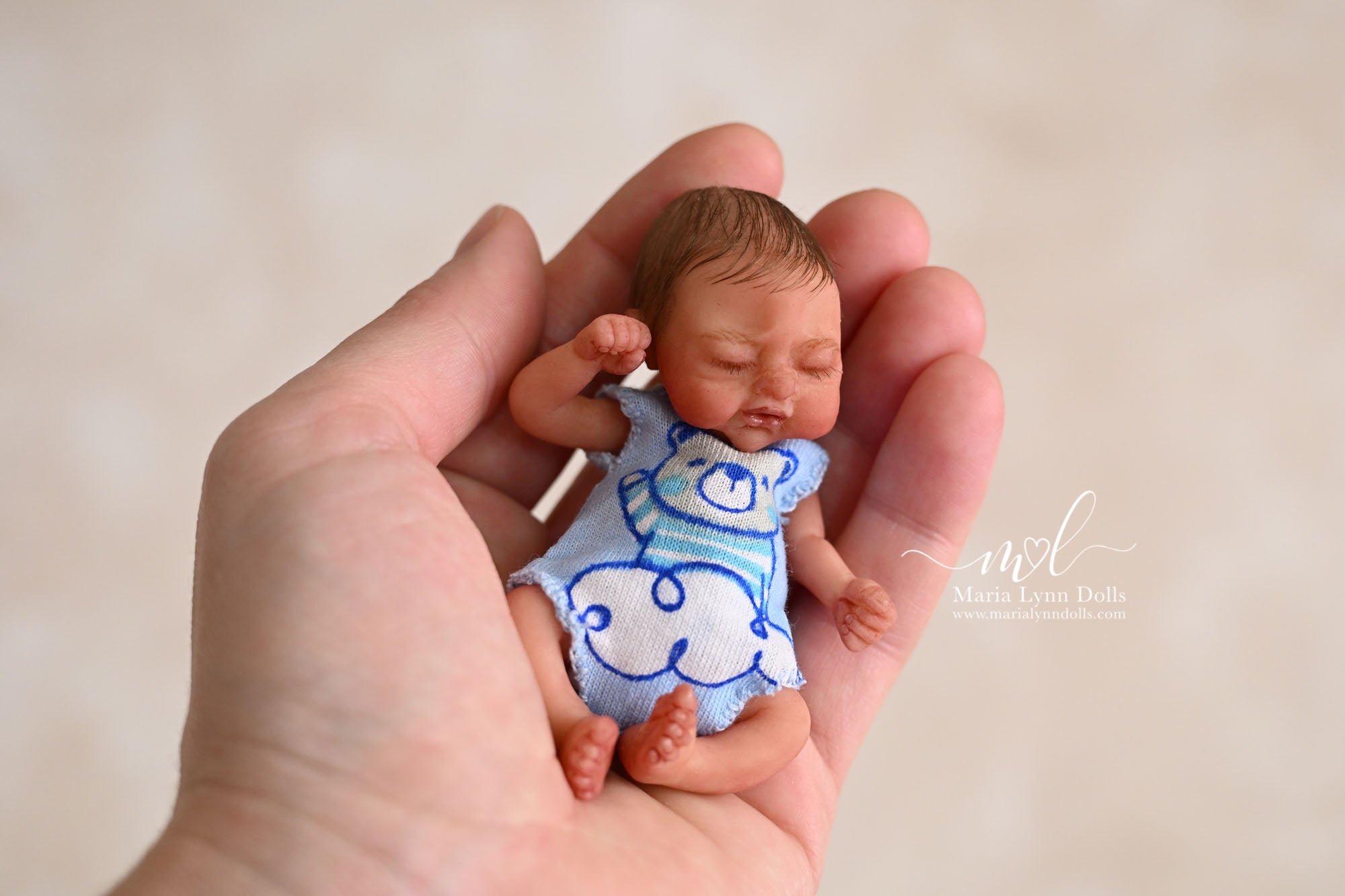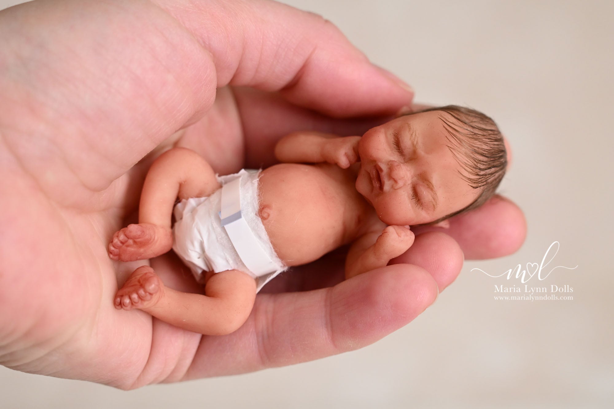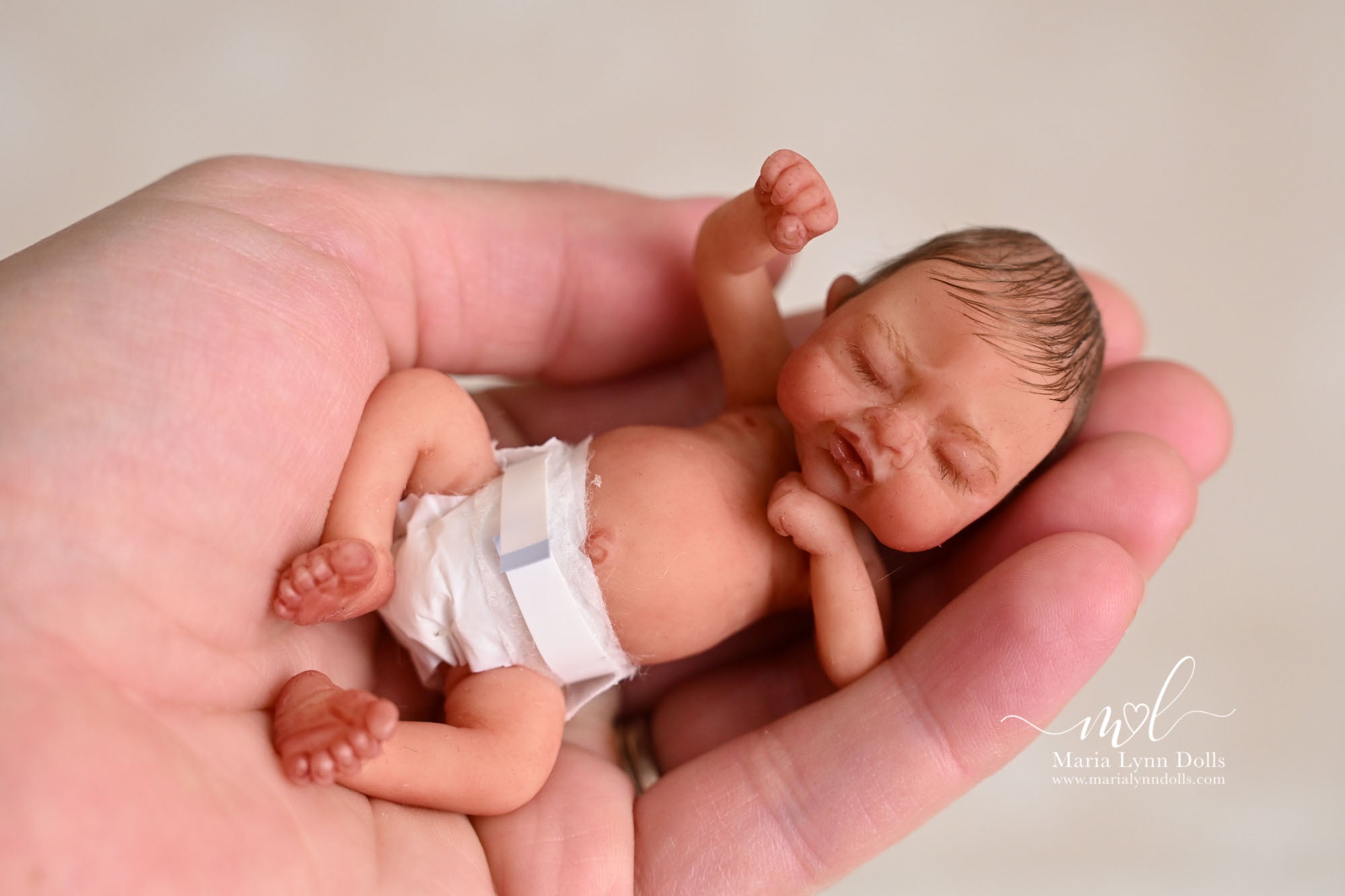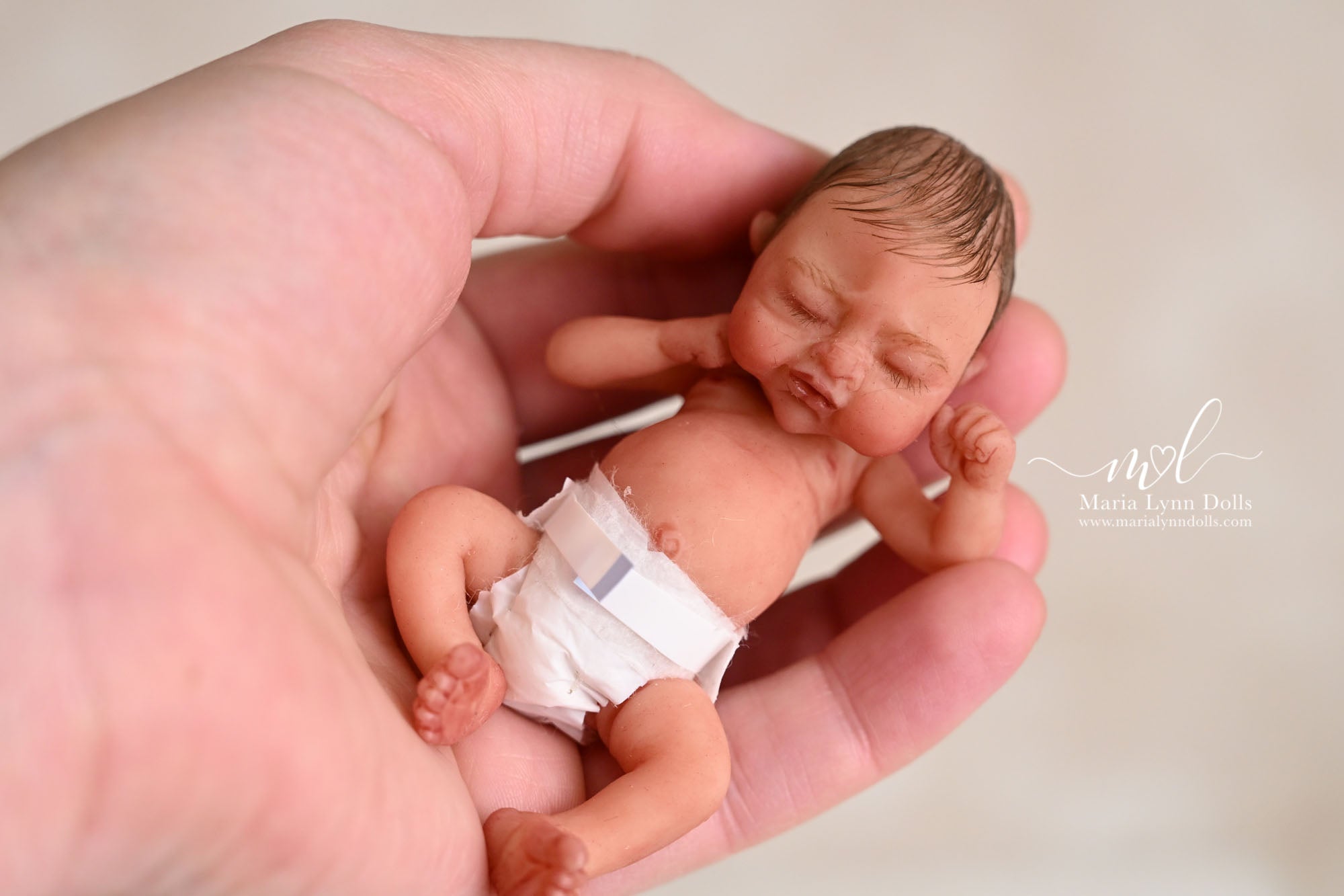 This sweet tiny baby Lil' Bean (boy) sculpted by Yulia Shaver, has been painted by Maria Lynn. He has a little head of dark brown rooted hair and dainty rooted eyelashes. Lil' Bean is about 4 inches long and is poured in a soft and squishy soft blend silicone. He has armatures in his arms and legs for extra ability to pose as well.