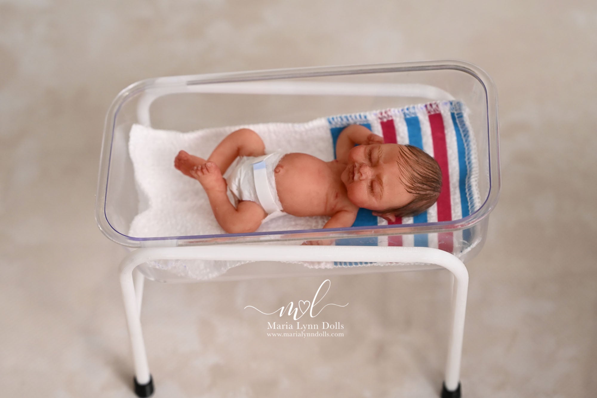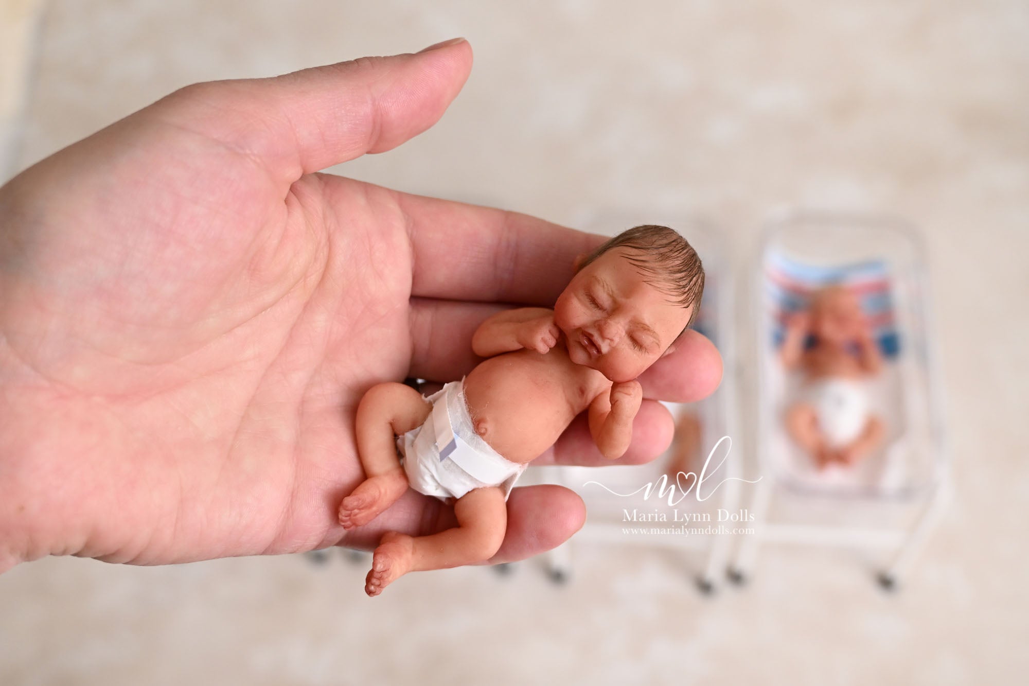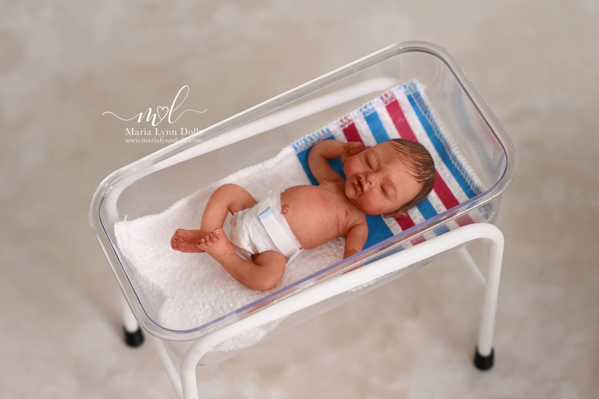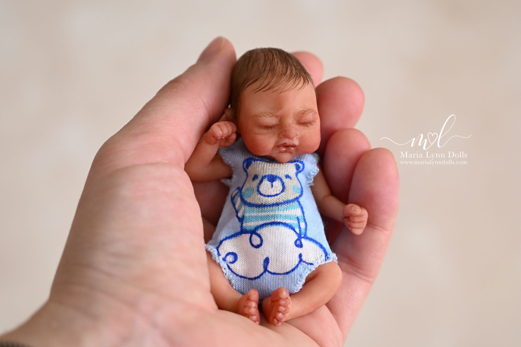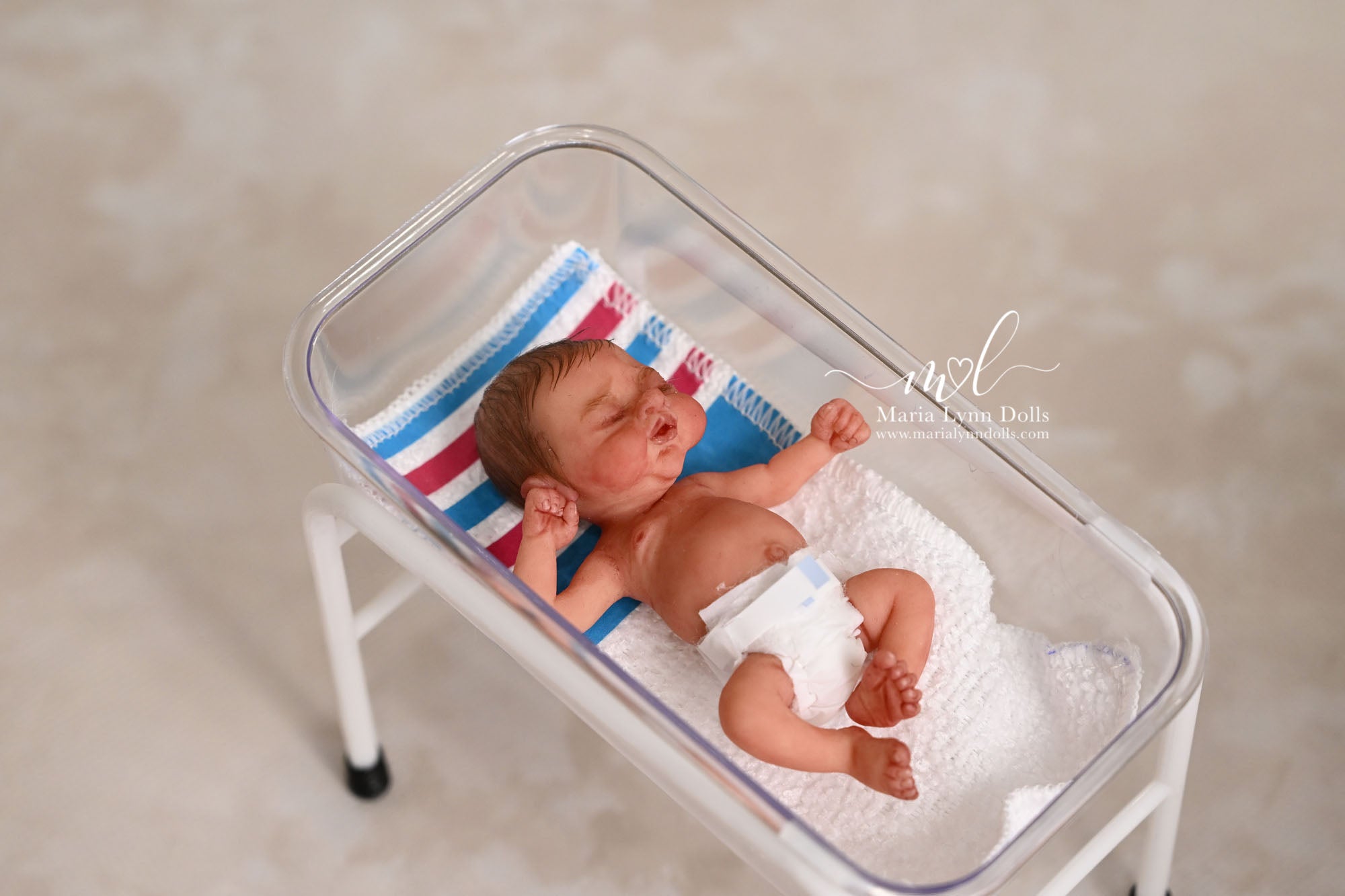 This sweet tiny baby Lil' Bean (boy) sculpted by Yulia Shaver, has been painted by Maria Lynn. He has a little head of dark brown rooted hair and dainty rooted eyelashes. Lil' Bean is about 4 inches long and is poured in a soft and squishy soft blend silicone. He has armatures in his arms and legs for extra ability to pose as well.