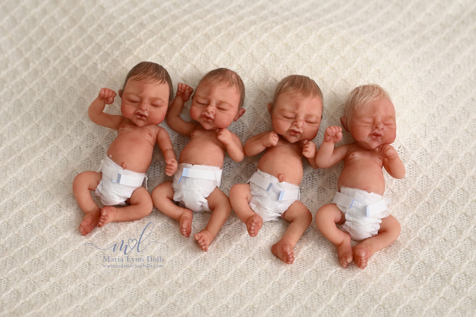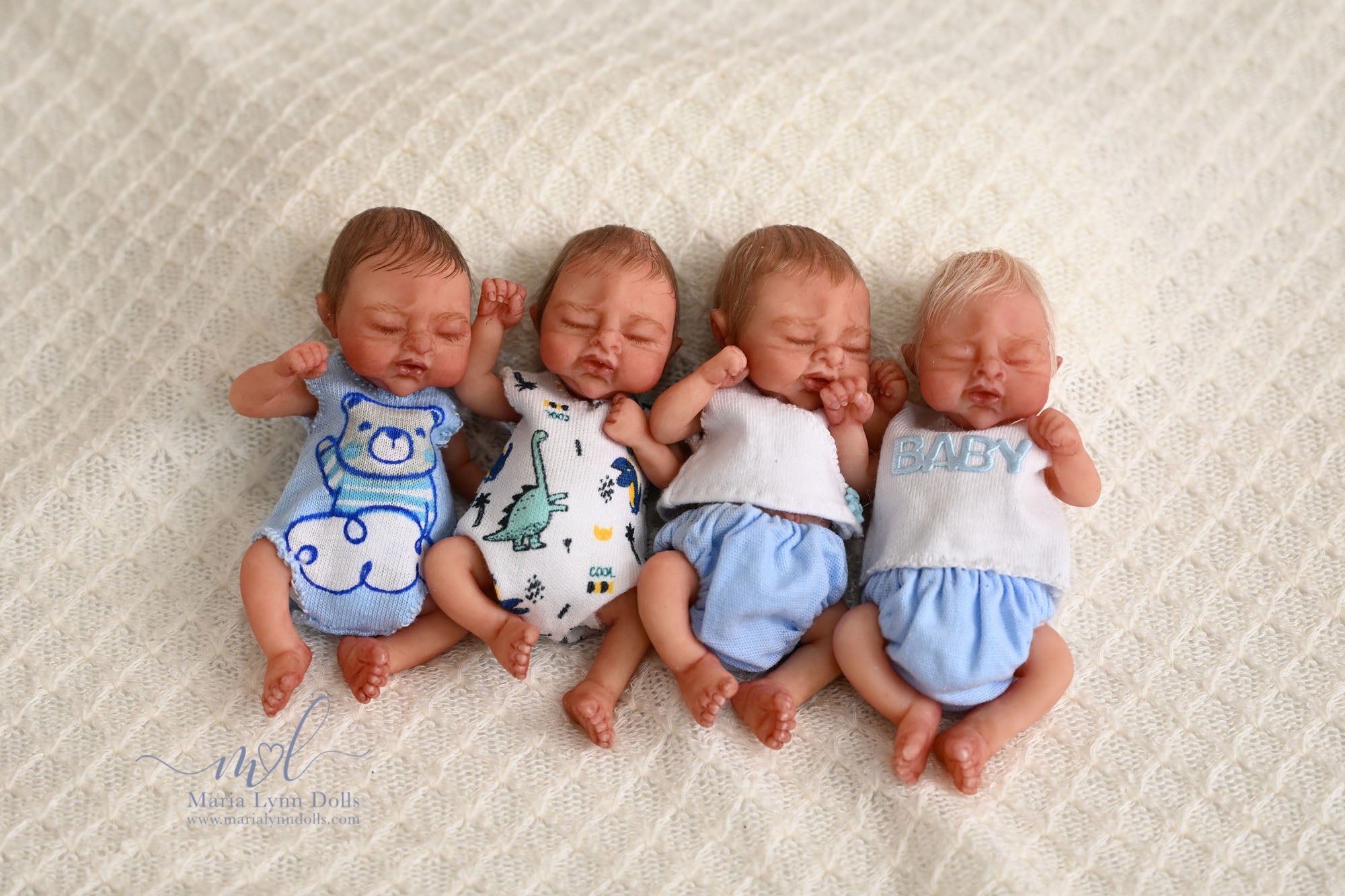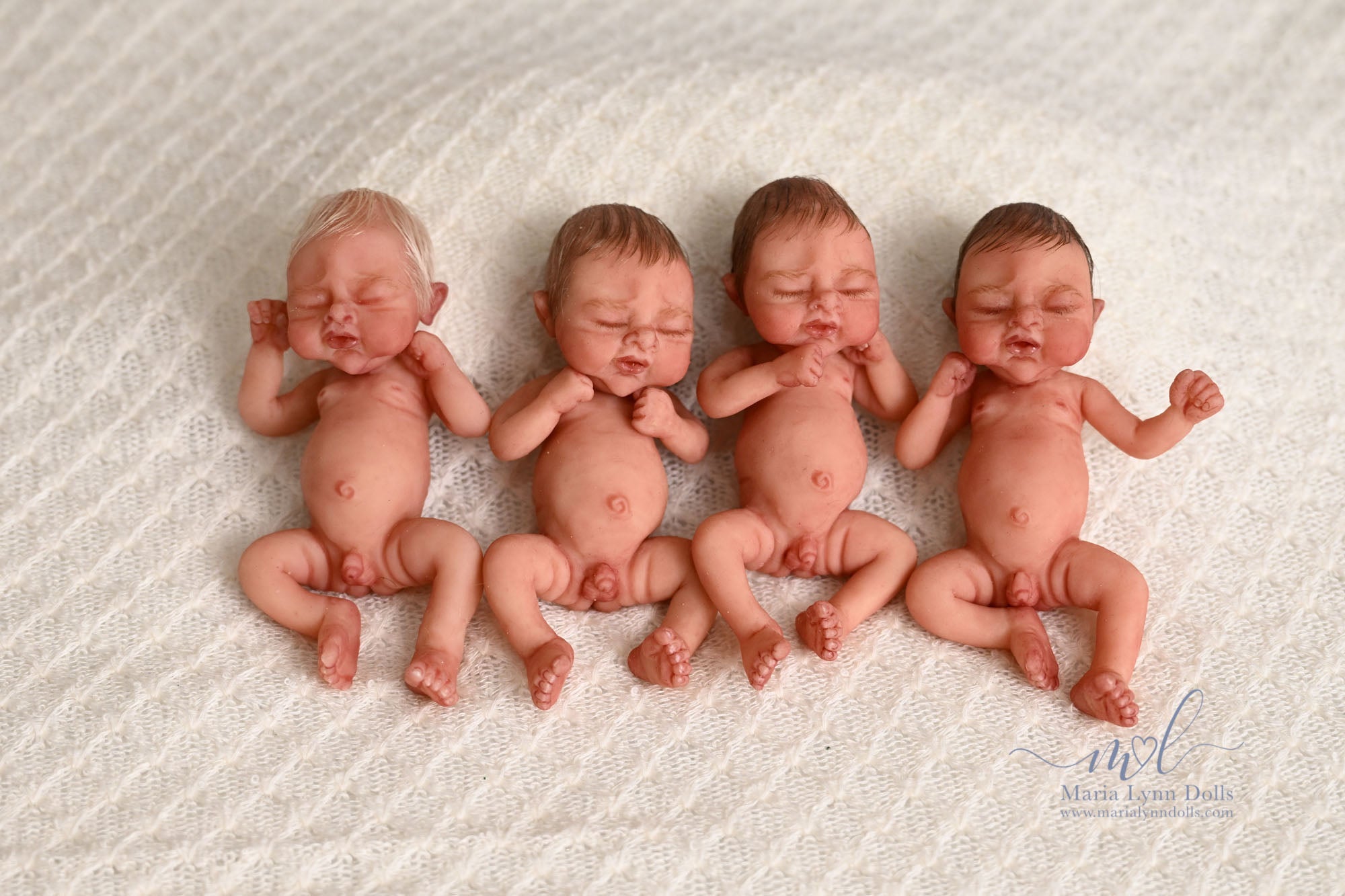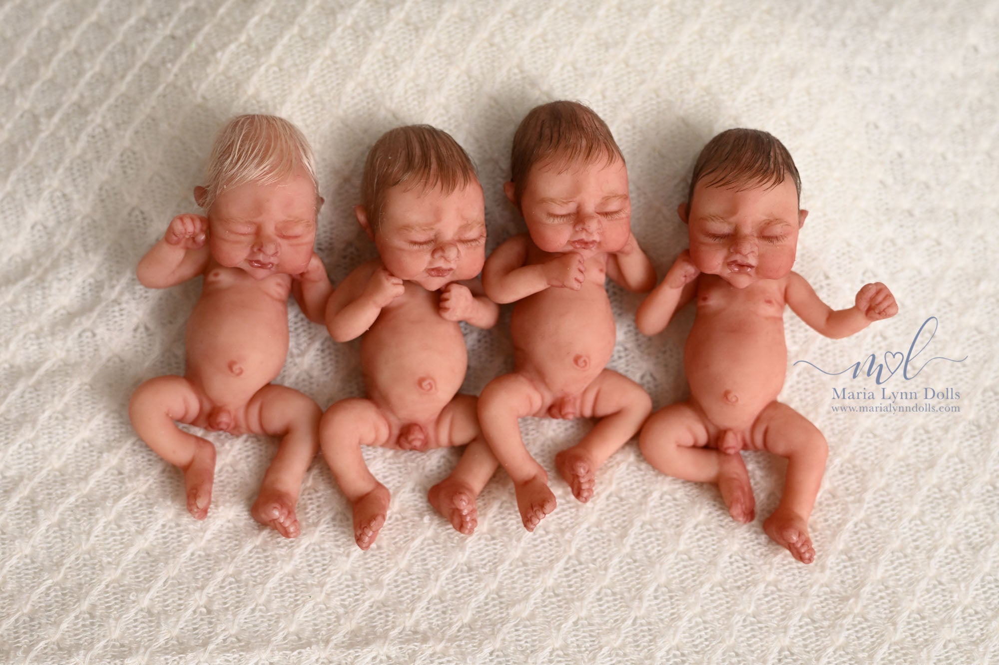 This sweet tiny baby Lil' Bean (boy) sculpted by Yulia Shaver, has been painted by Maria Lynn. He has a little head of dark brown rooted hair and dainty rooted eyelashes. Lil' Bean is about 4 inches long and is poured in a soft and squishy soft blend silicone. He has armatures in his arms and legs for extra ability to pose as well.