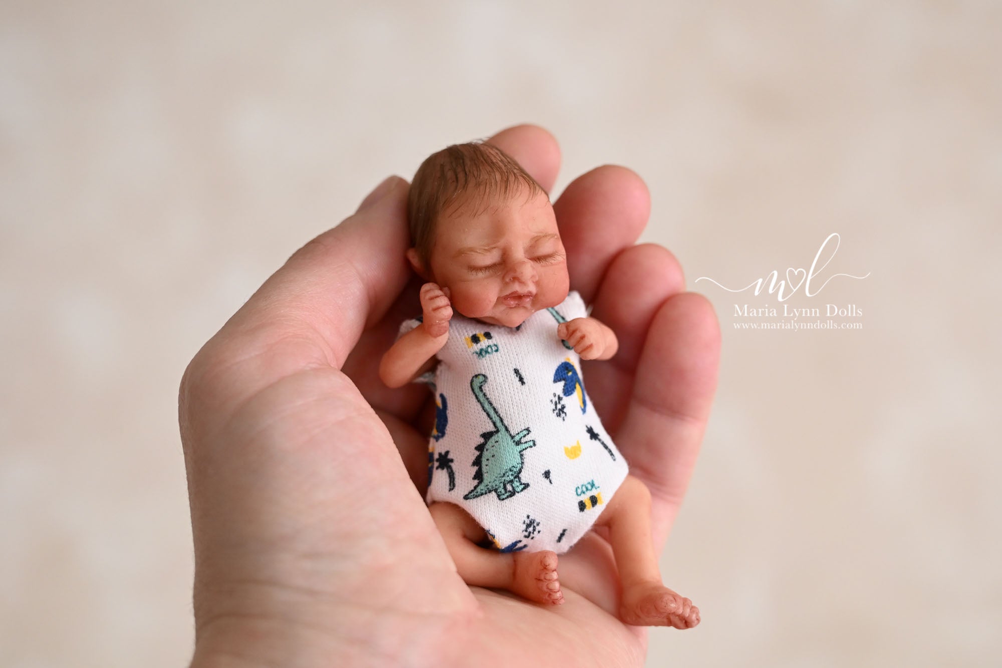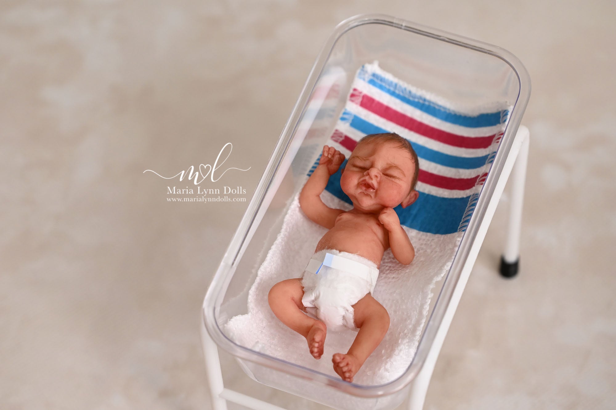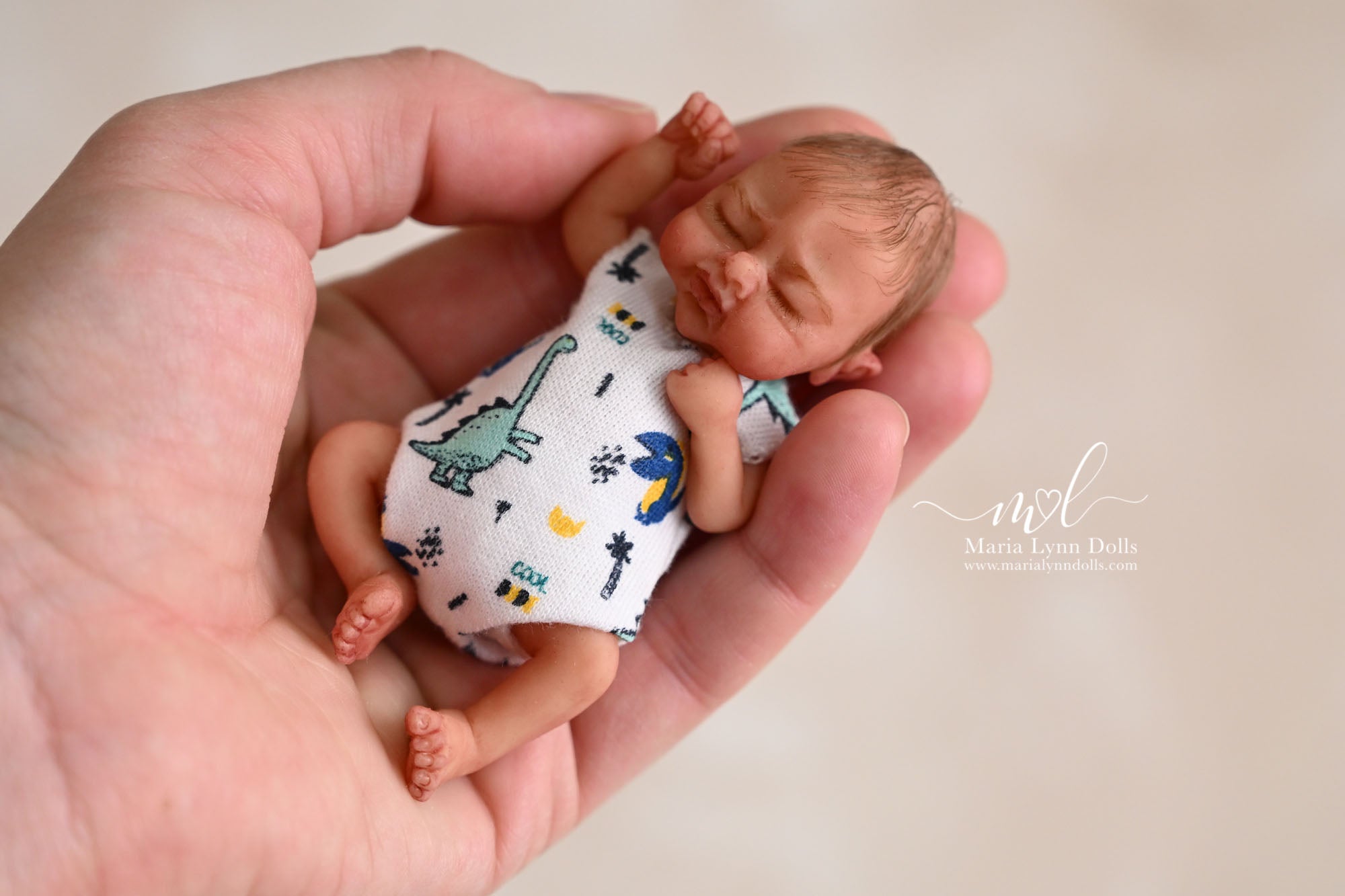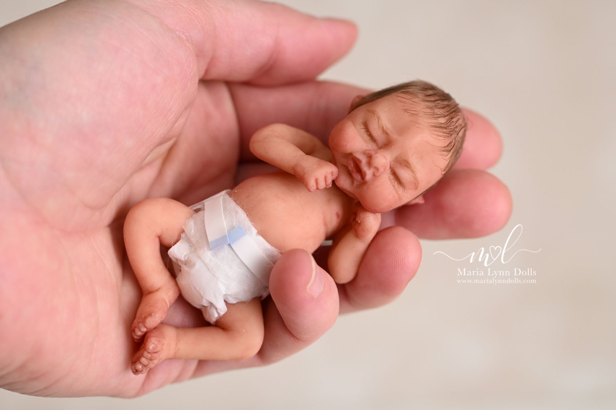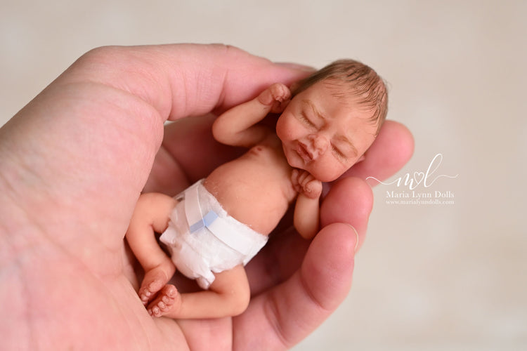 This sweet tiny baby Lil' Bean (boy) sculpted by Yulia Shaver, has been painted by Maria Lynn. He has a little head of medium brown rooted hair and dainty rooted eyelashes. Lil' Bean is about 4 inches long and is poured in a soft EcoFlex 20 silicone. He has armatures in his arms and legs for extra ability to pose as well.