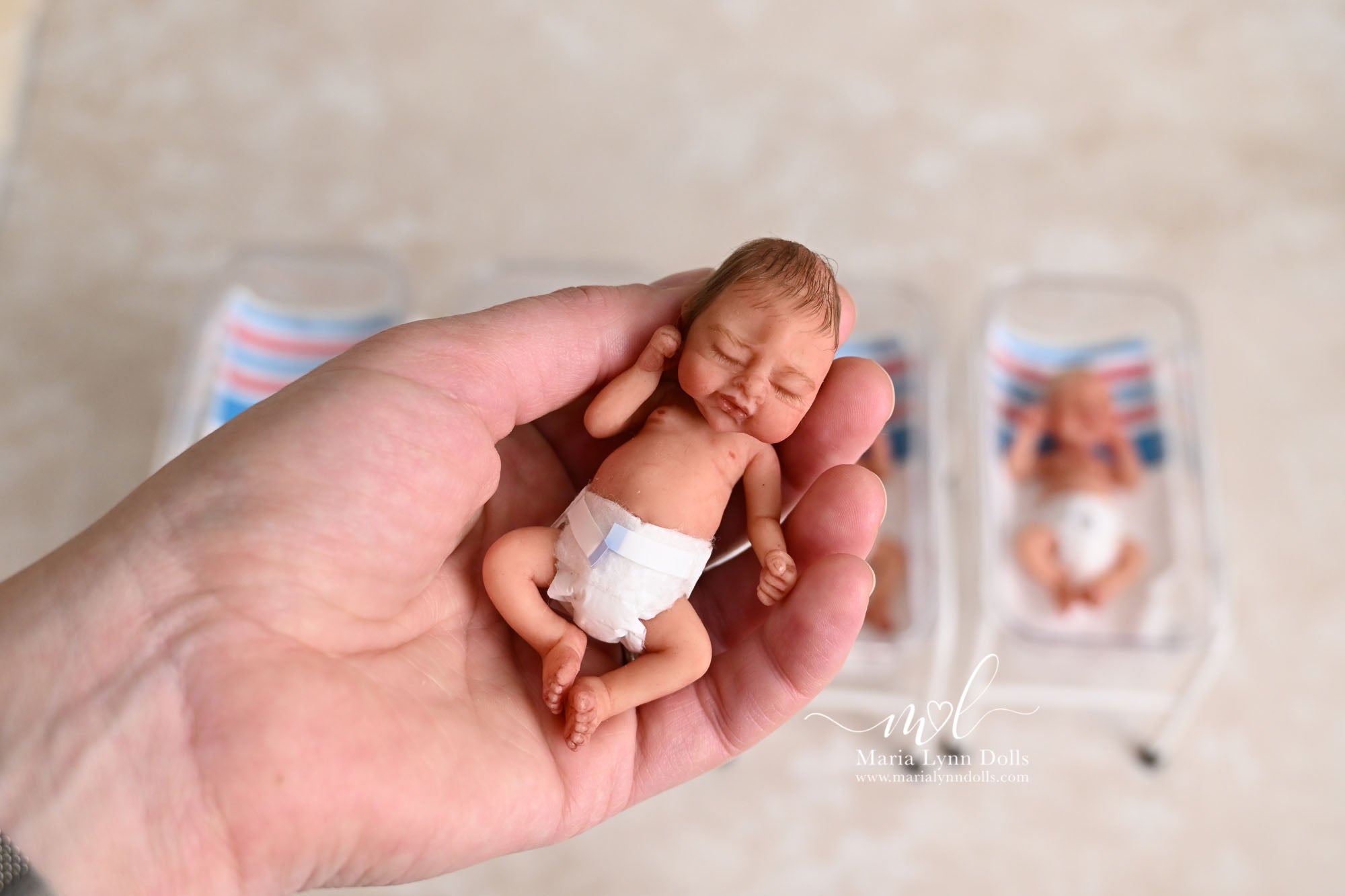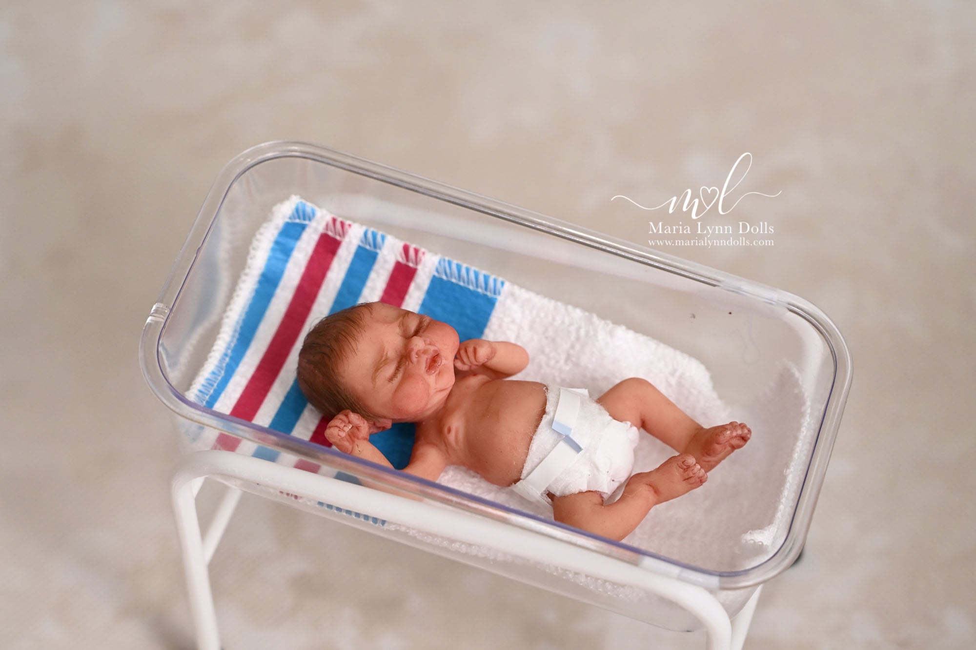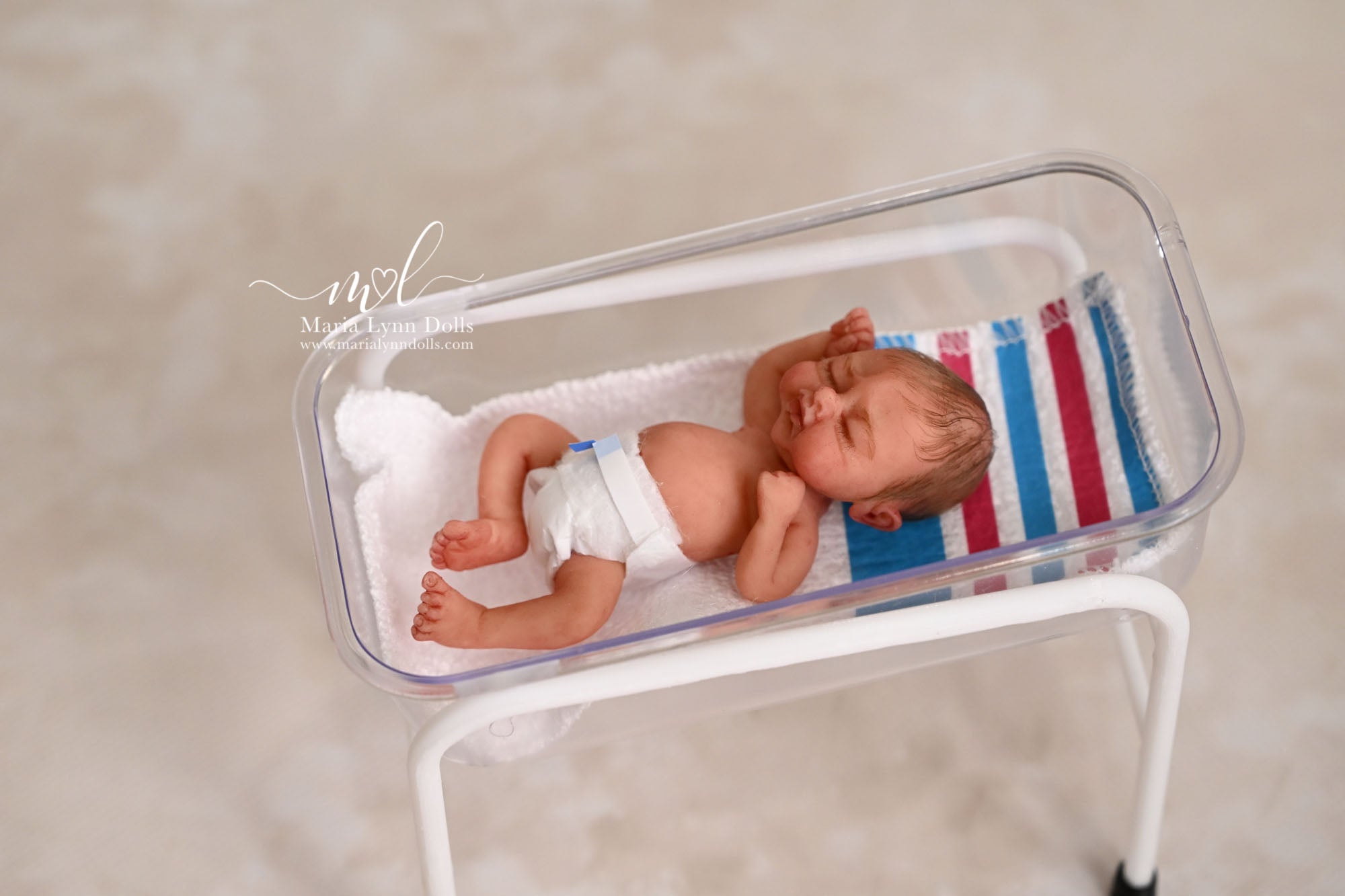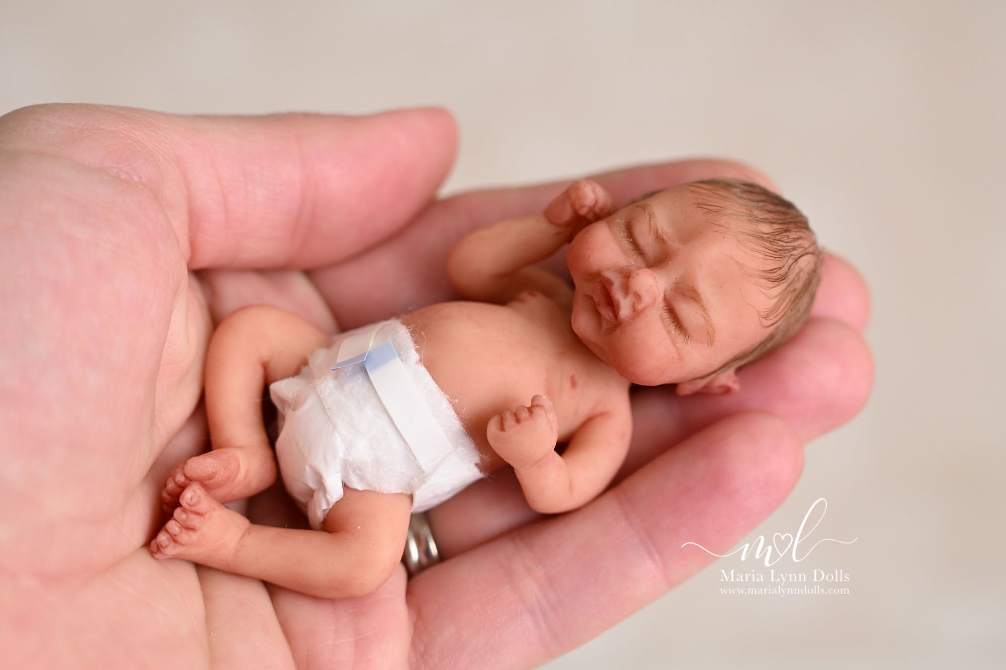This sweet tiny baby Lil' Bean (boy) sculpted by Yulia Shaver, has been painted by Maria Lynn. He has a little head of medium brown rooted hair and dainty rooted eyelashes. Lil' Bean is about 4 inches long and is poured in a soft EcoFlex 20 silicone. He has armatures in his arms and legs for extra ability to pose as well.