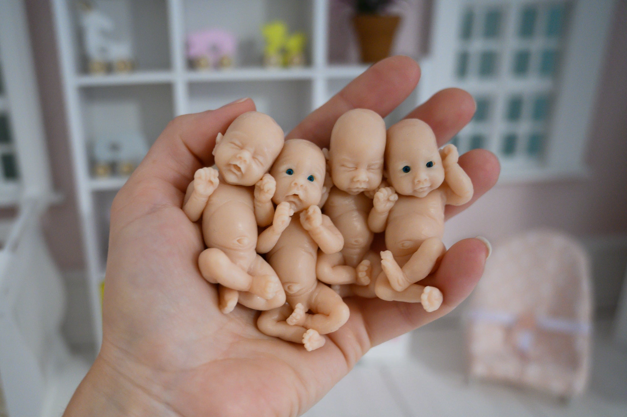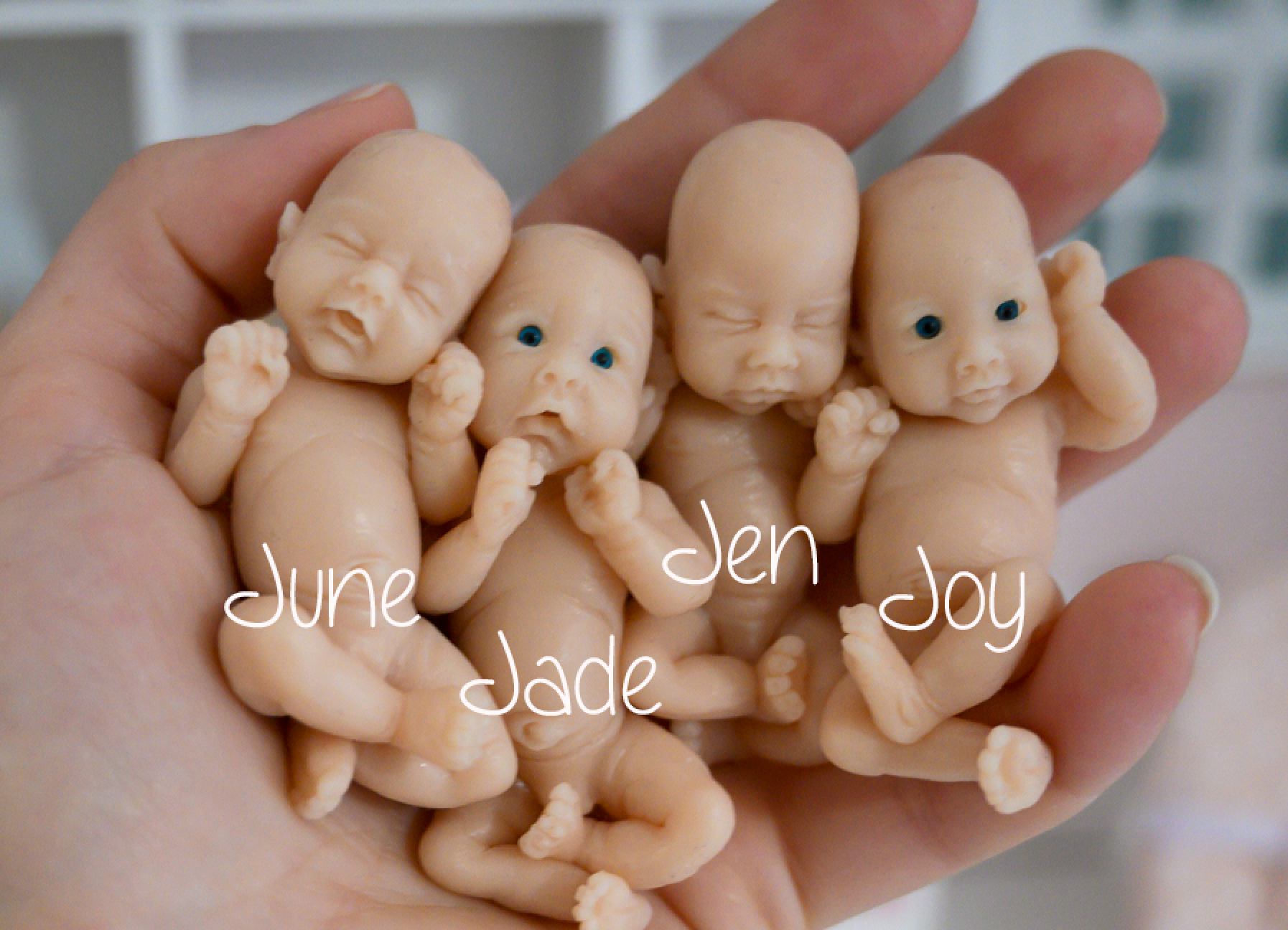 Sweet little girl quadruplets, June, Jade, Jen, and Joy, are so adorable! These little babes are teeny-tiny at just about 3 inches in length when laid out strait, but are SO detailed. Their tiny fingers and toes include each crease and wrinkle, their itty-bitty ears are adorable, and their little tummy are so soft to squish! Two of the babies (Jade and Joy) are awake and come with teeny tiny eyes (included). June and Jen are both sleepers.
