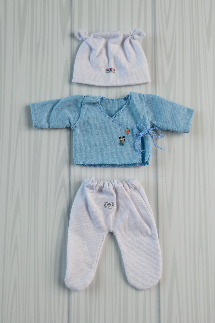 This adorable three piece outfit comes with a blue crossover and a precious white hat and matching bottoms. It's sized for 5 inch dolls.
