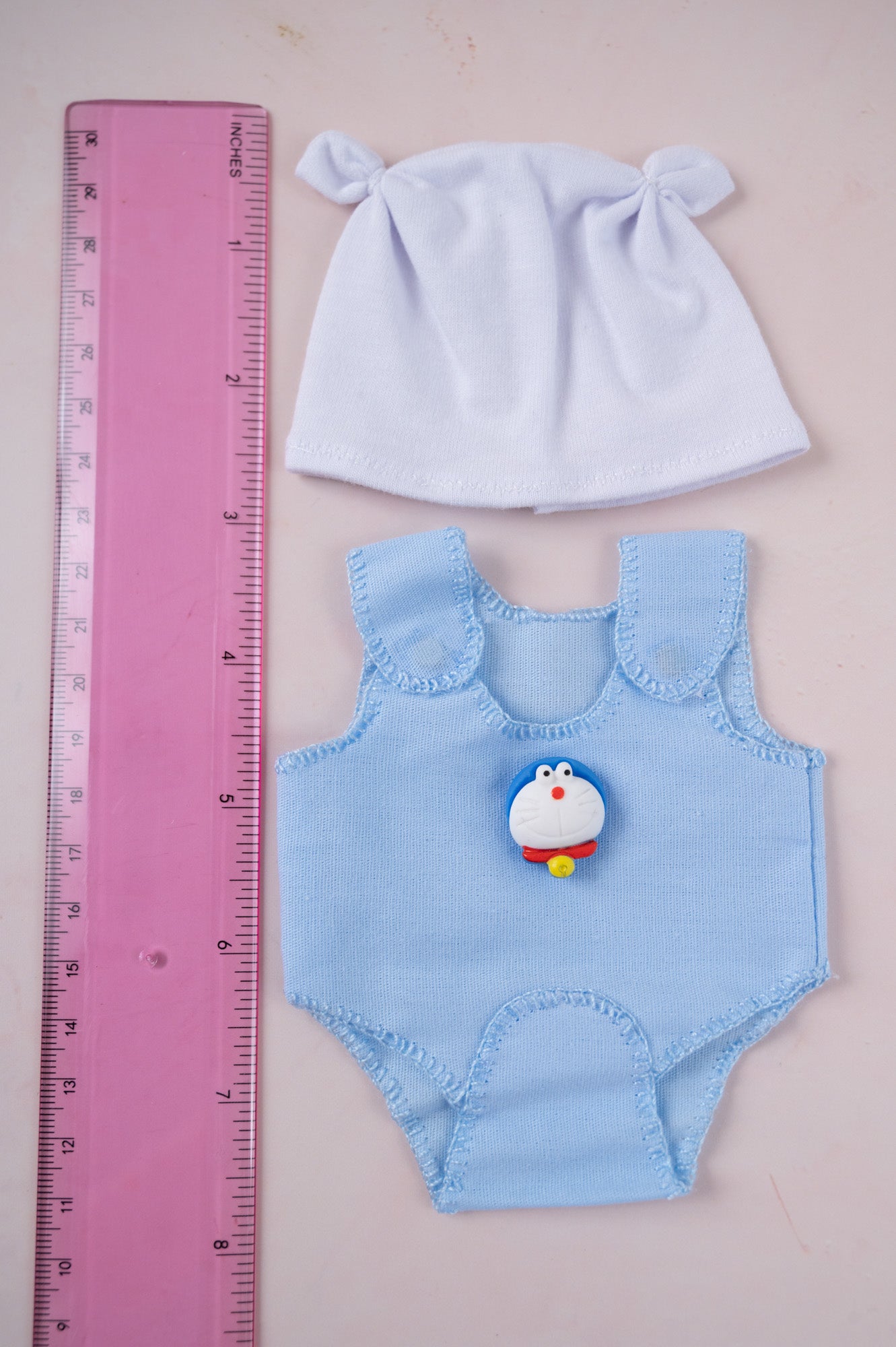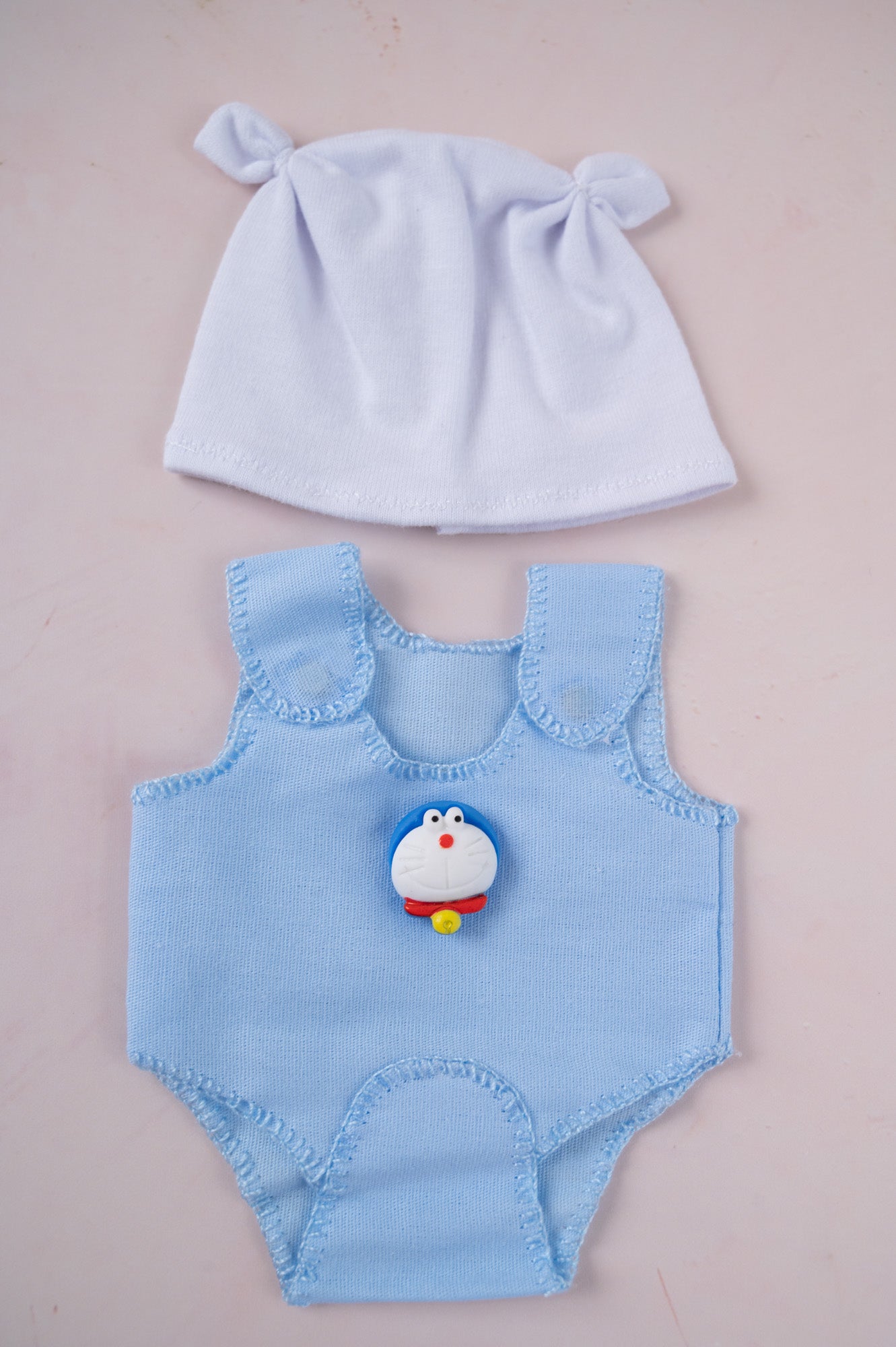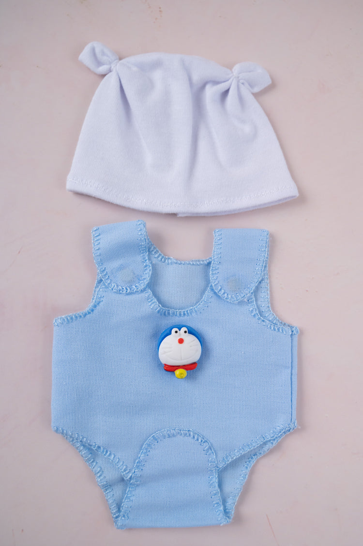 This darling blue onesie has a cute kitty button. It comes with a white hat. It's sized for 8 inch dolls.