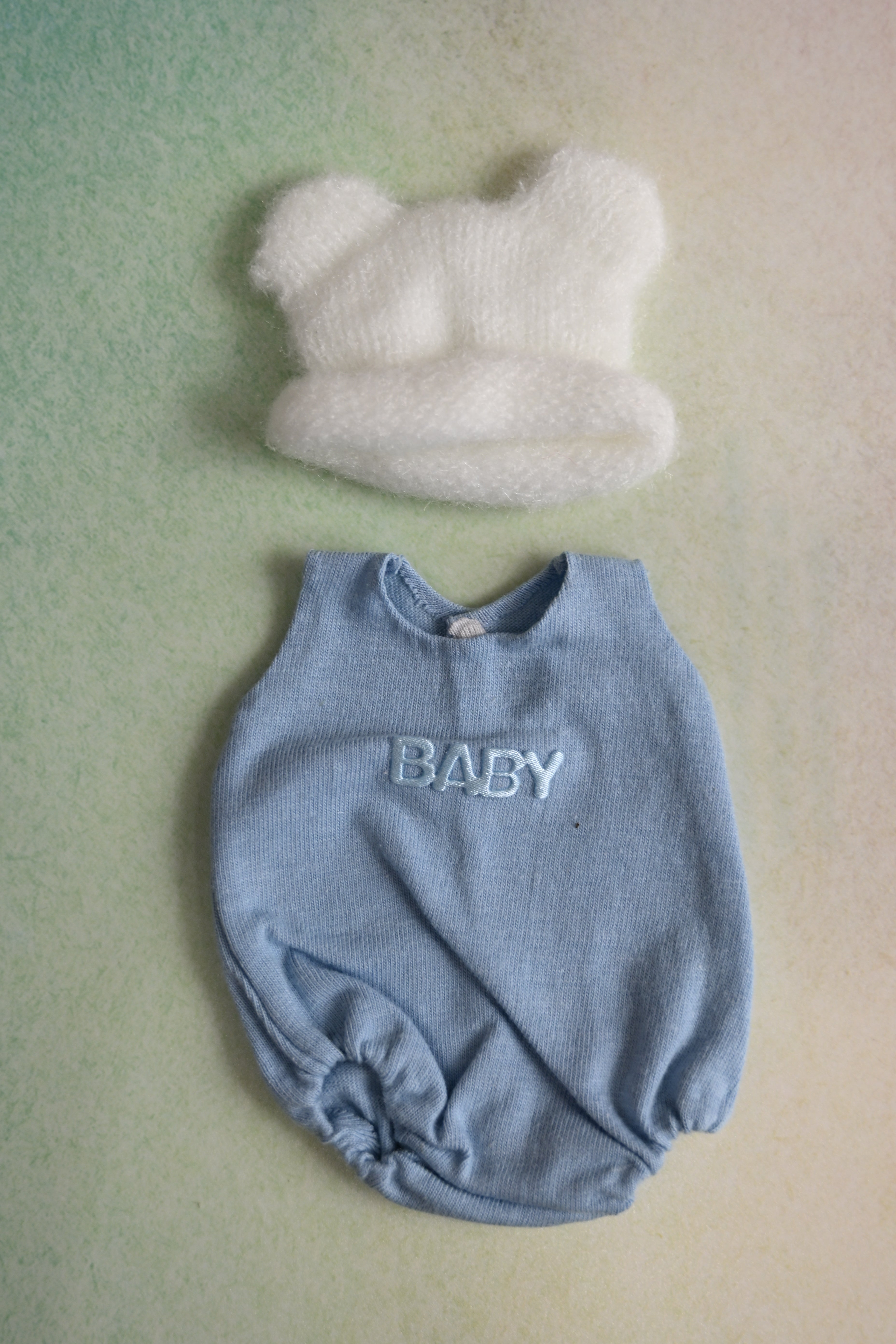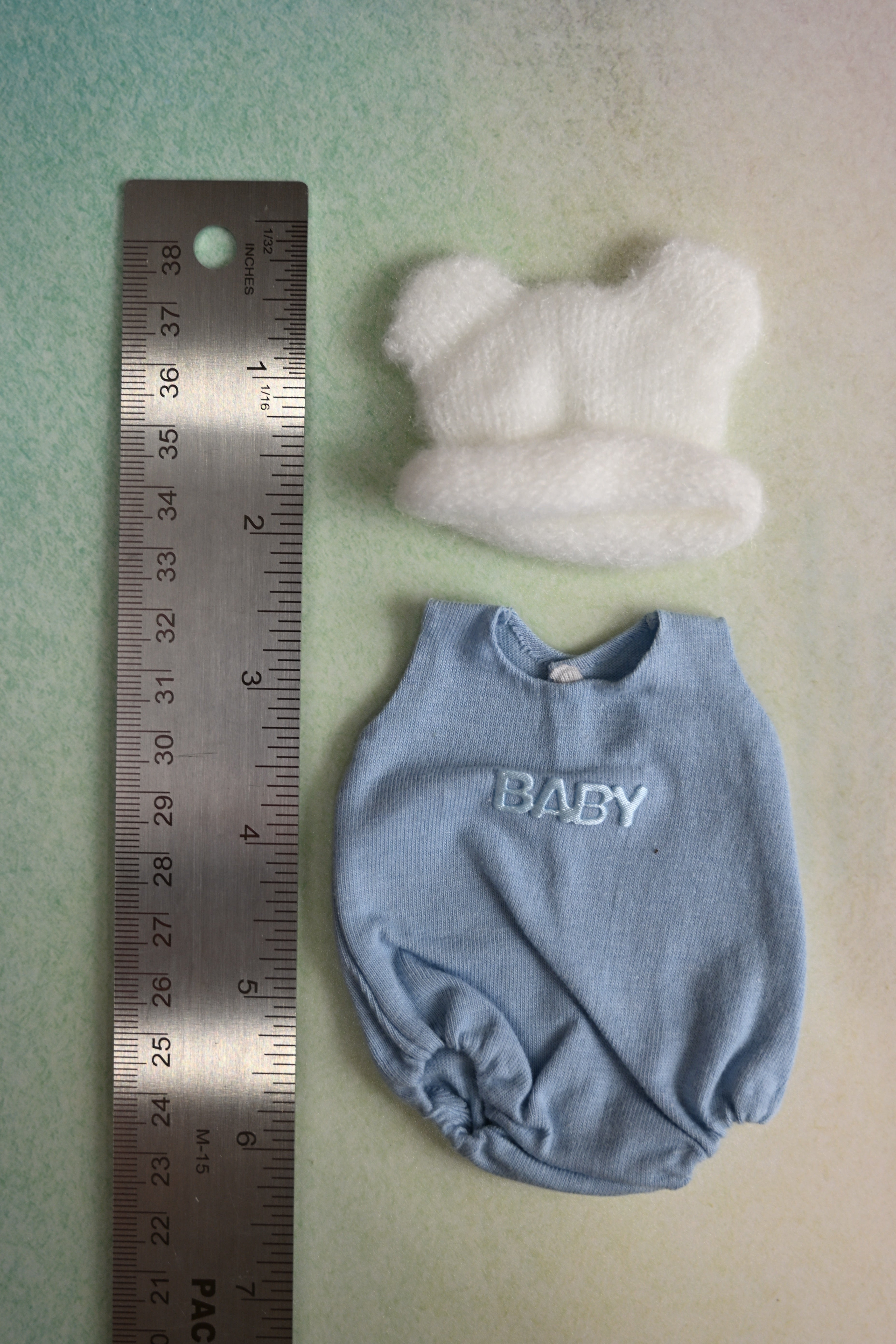 This sweet set includes a blue romper with baby embroidered on it and a cozy white fuzzy bear hat. This outfit is made for 7" dolls.