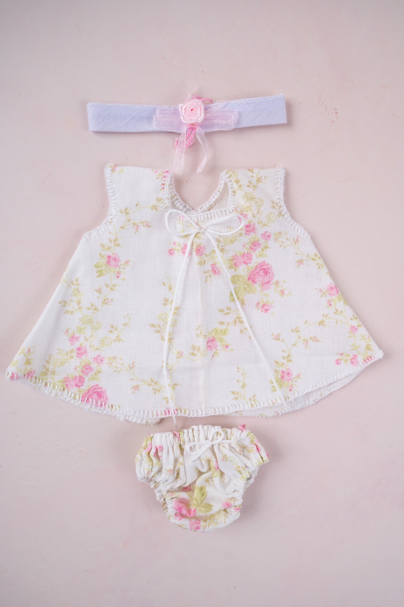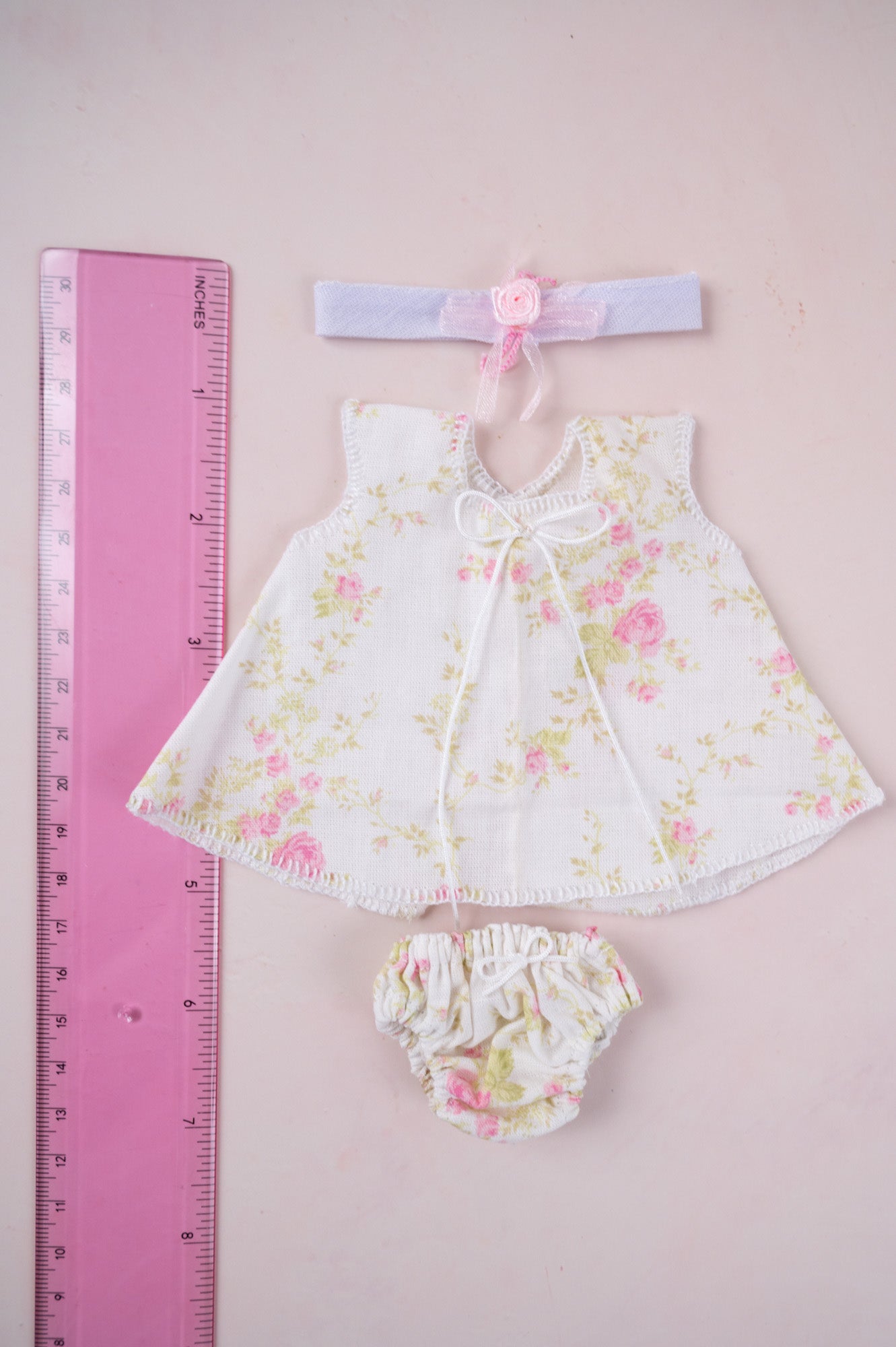 This adorable cream floral dress set comes with a  matching diaper cover and headband with a rose. It's sized for 8 inch dolls.