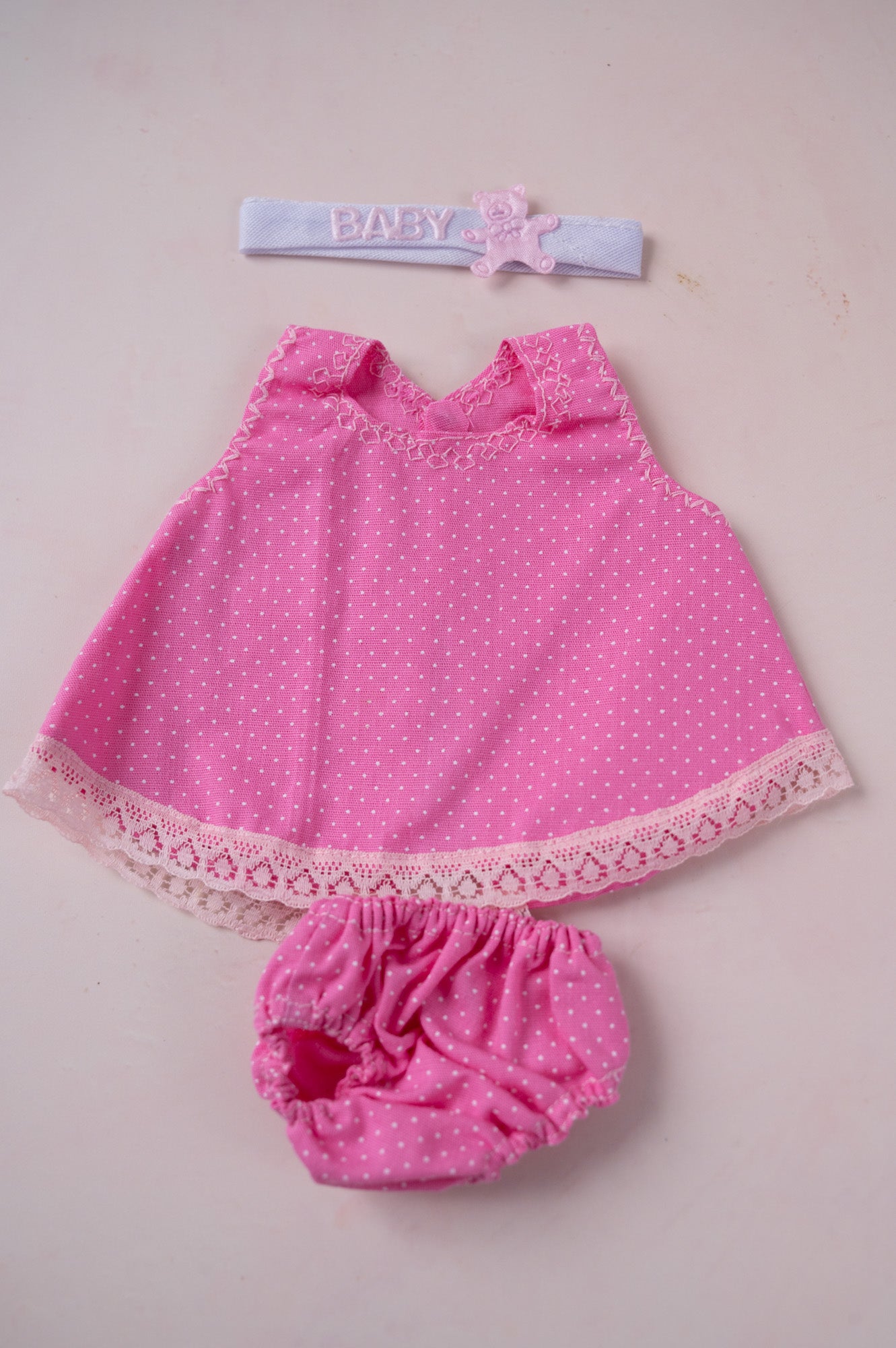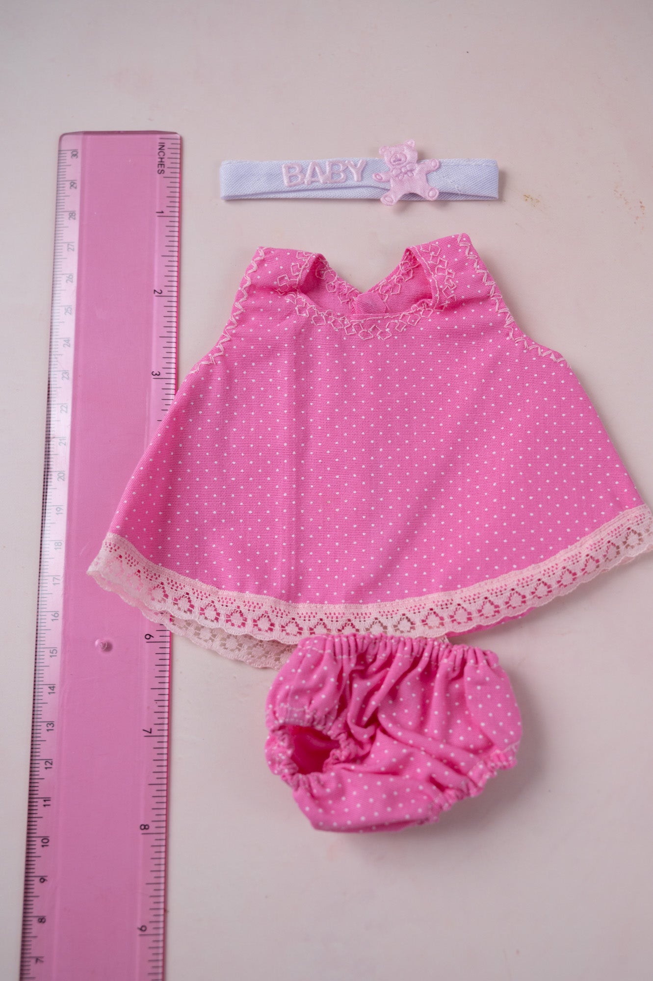 This cute dark pink polka dot dress set comes with a matching diaper cover and adorable embroidered baby and teddy headband. It's sized for 9 inch dolls.