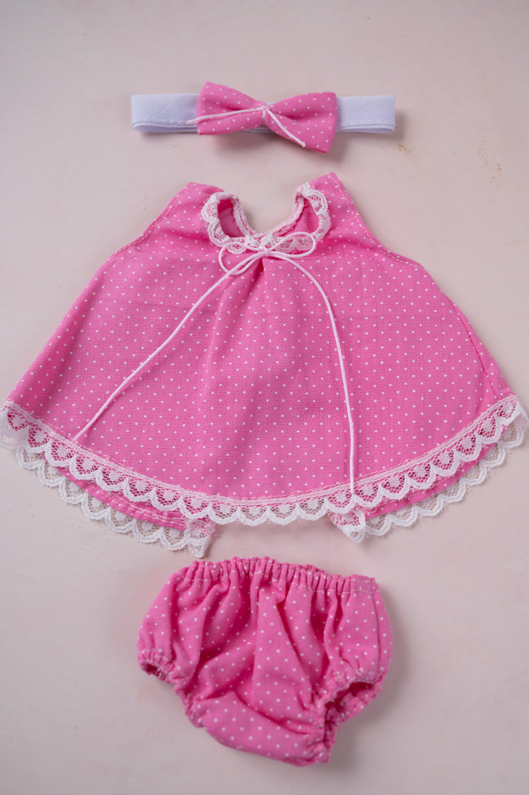 This beautiful dark pink polka dot dress set comes with a matching diaper cover and adorable bow headband. It's sized for 9 inch dolls.