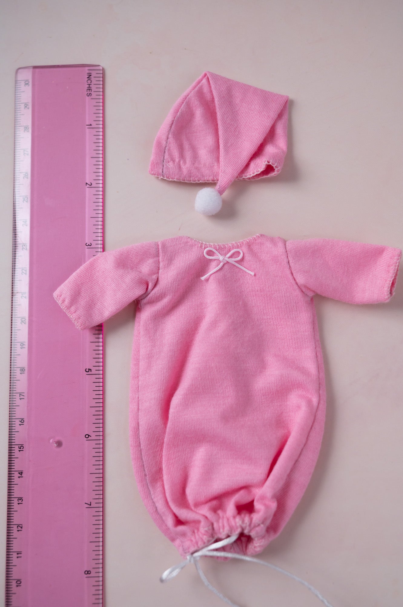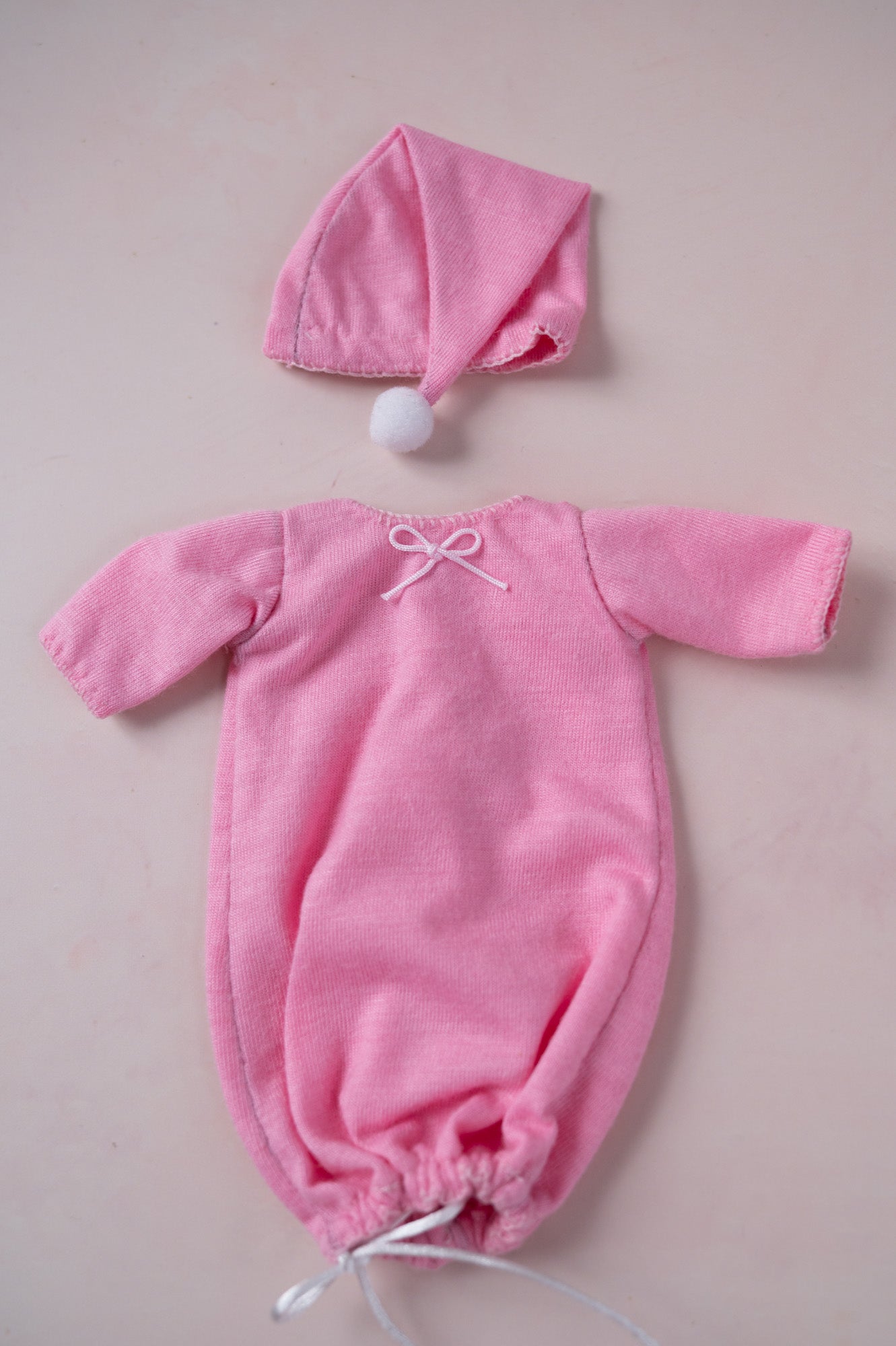 This adorable dark pink sleeper with cute bows includes sweet matching hat with a pom pom. This outfit is sized for 5 inch dolls.