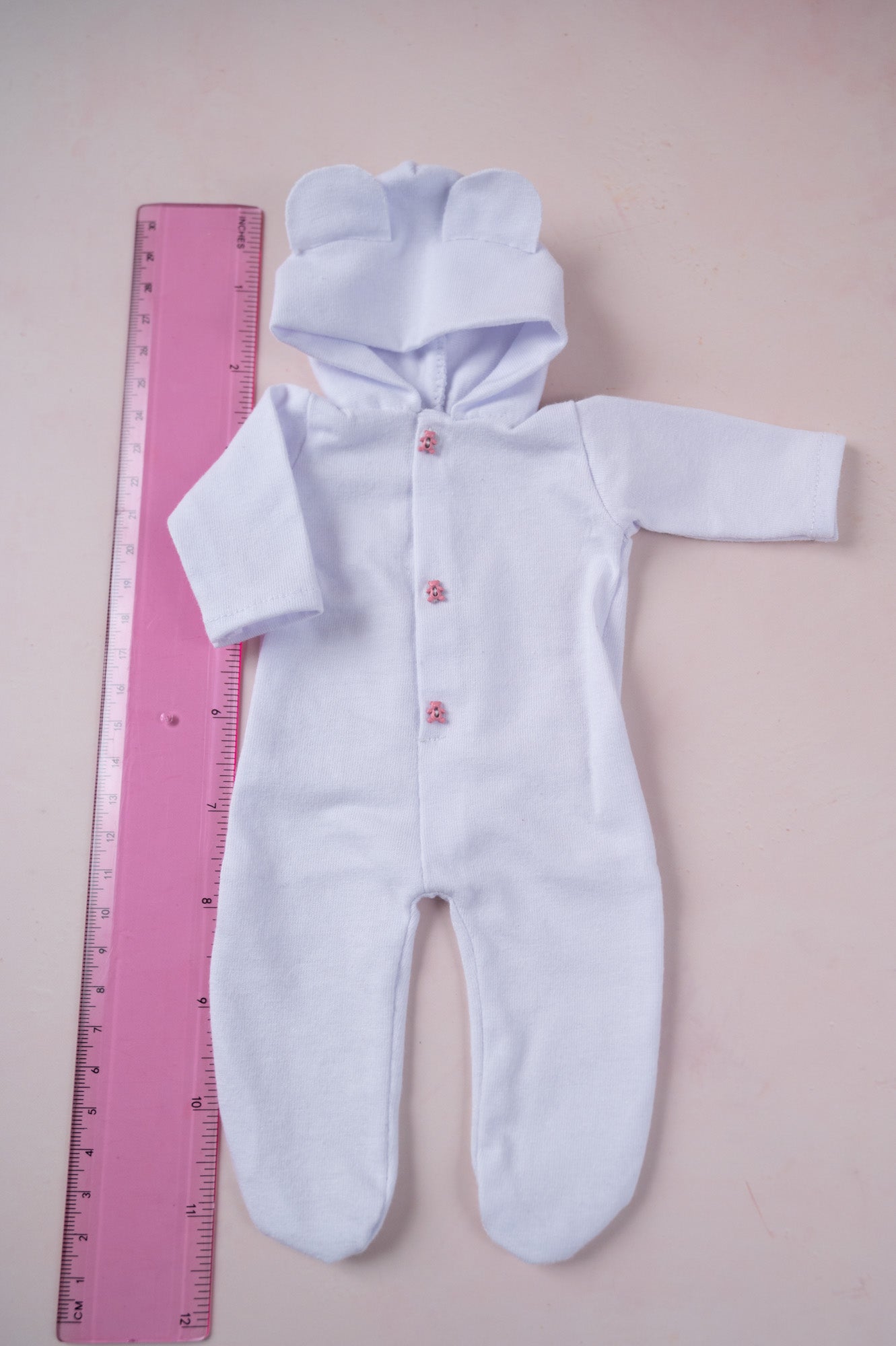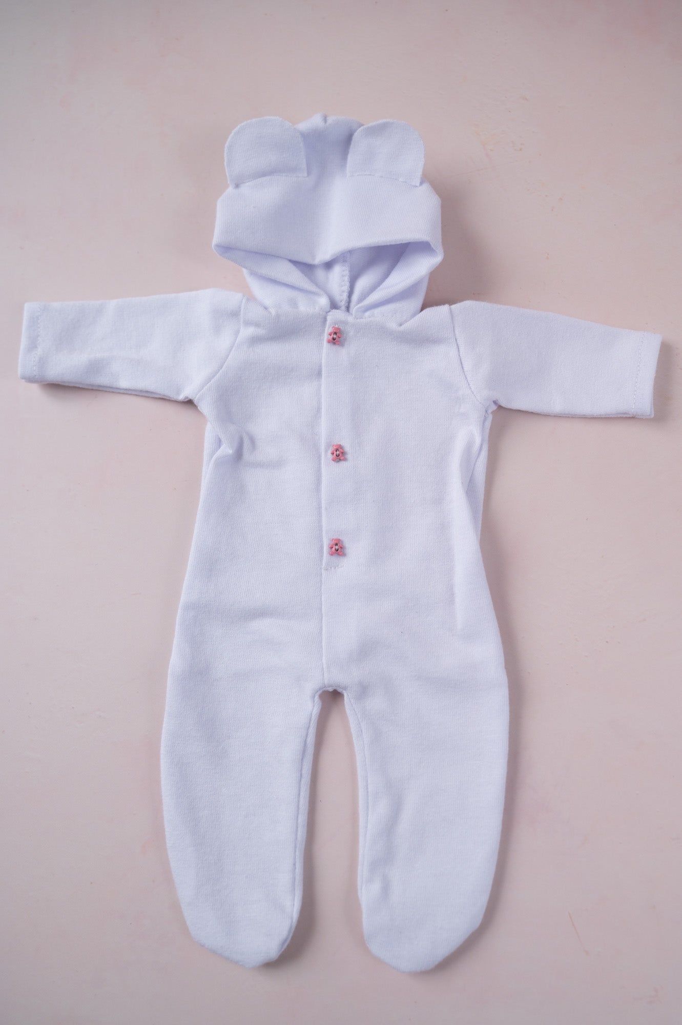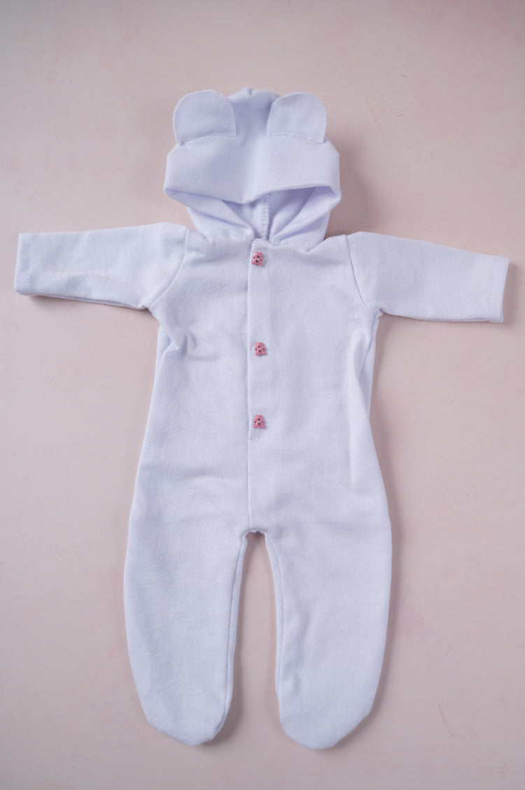 This cozy lavender coverall with pink bear buttons has an adorable bear hoodie attached. It's sized for 9 inch dolls.