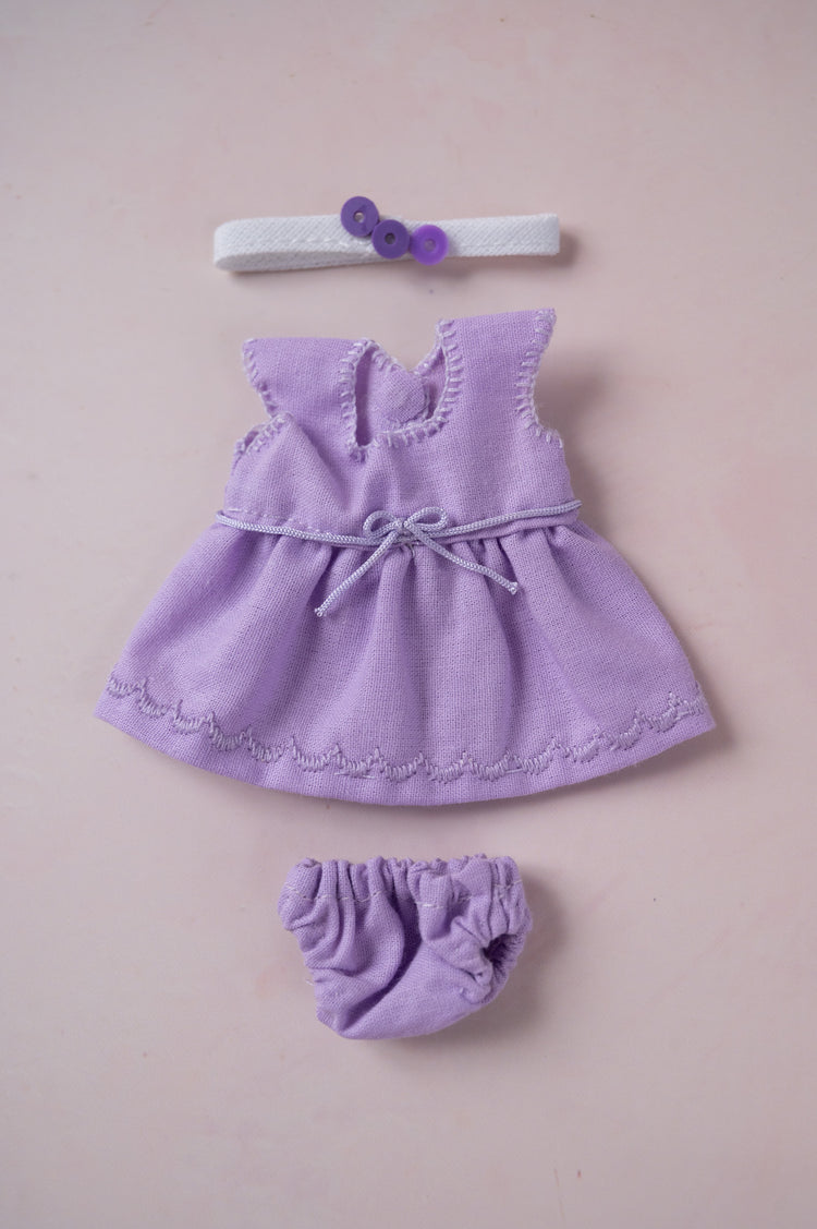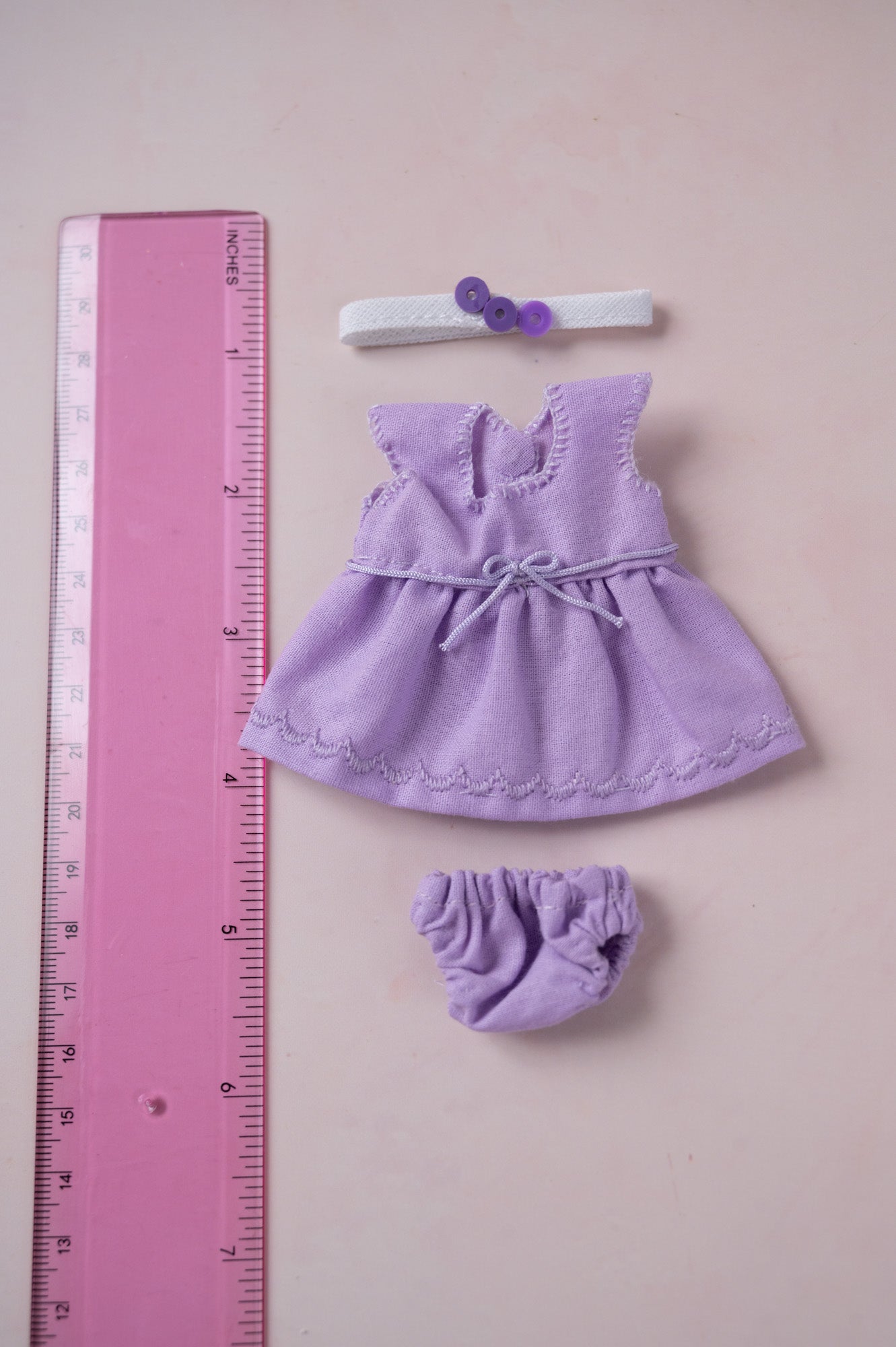 This sweet lavender dress includes a matching diaper cover and precious headband with purple buttons. It's sized for 5 inch dolls.