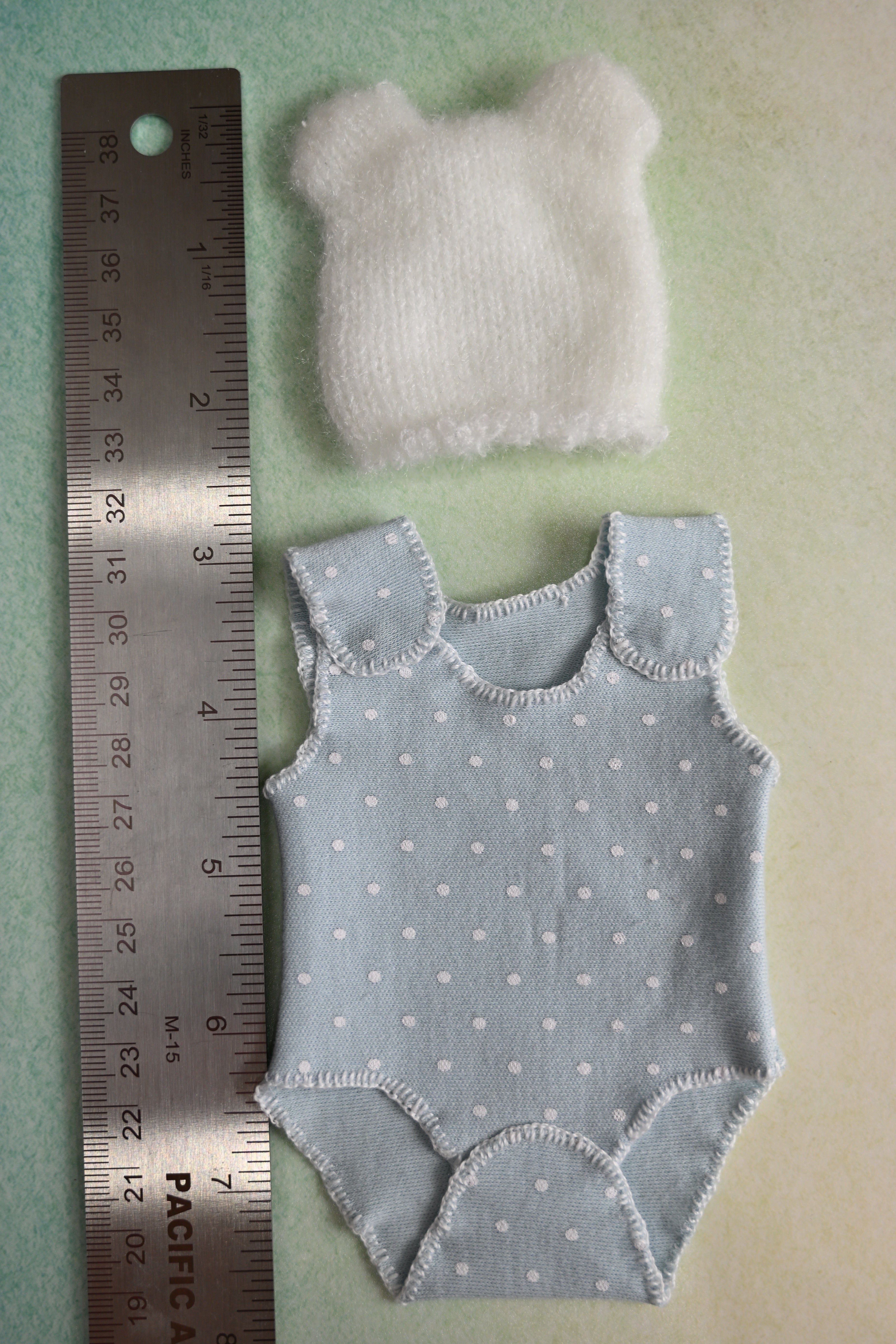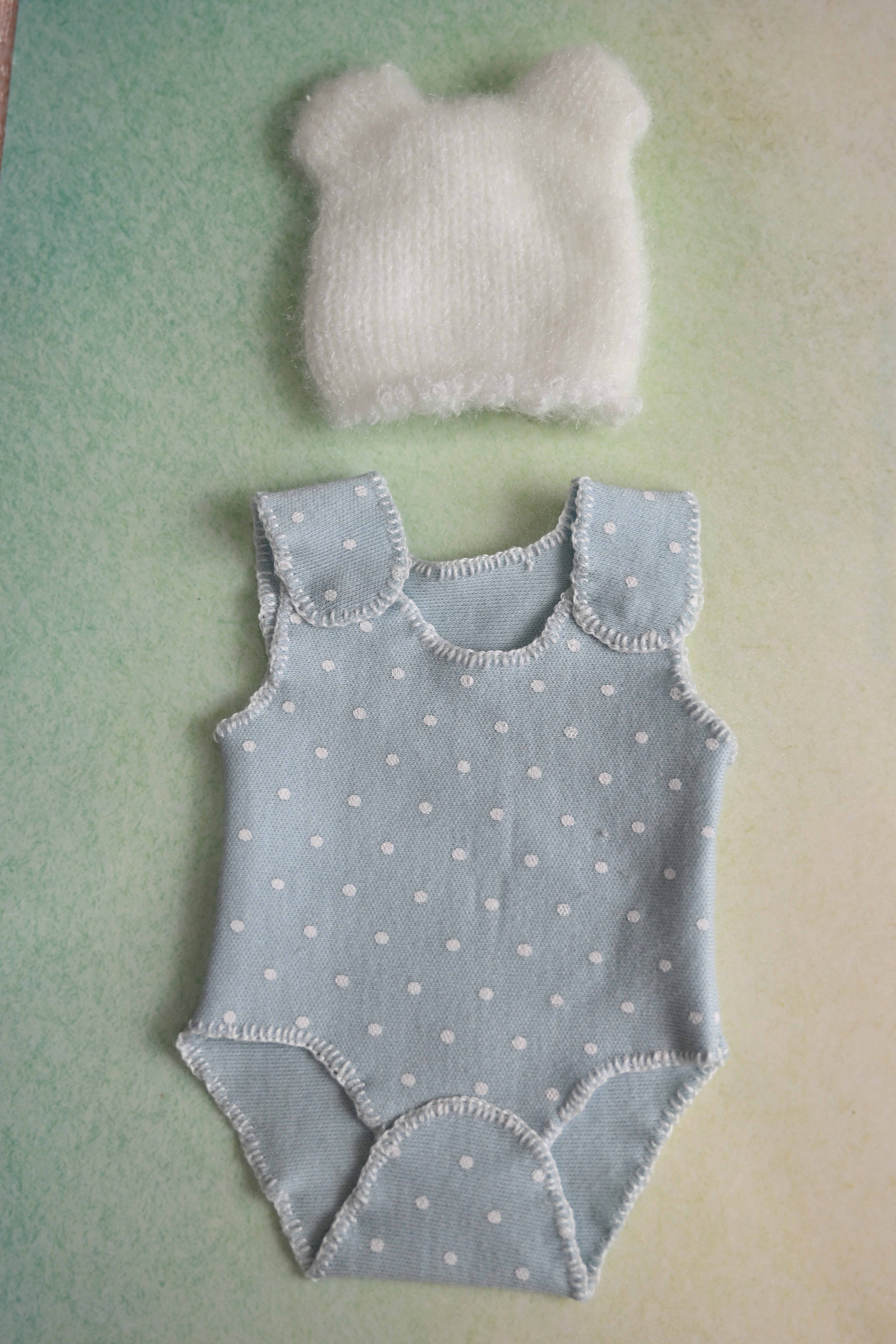 This dainty set comes with a light blue polka dot romper and a sweet fuzzy white bear hat. This outfit is made for 7" dolls.