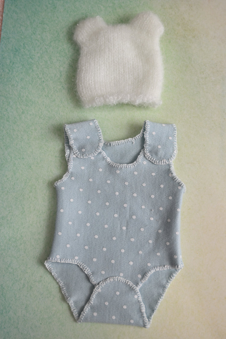 Light Blue Polka Dot Romper Set With Bear Hat for 7" Dolls - Winter 2025 Collection