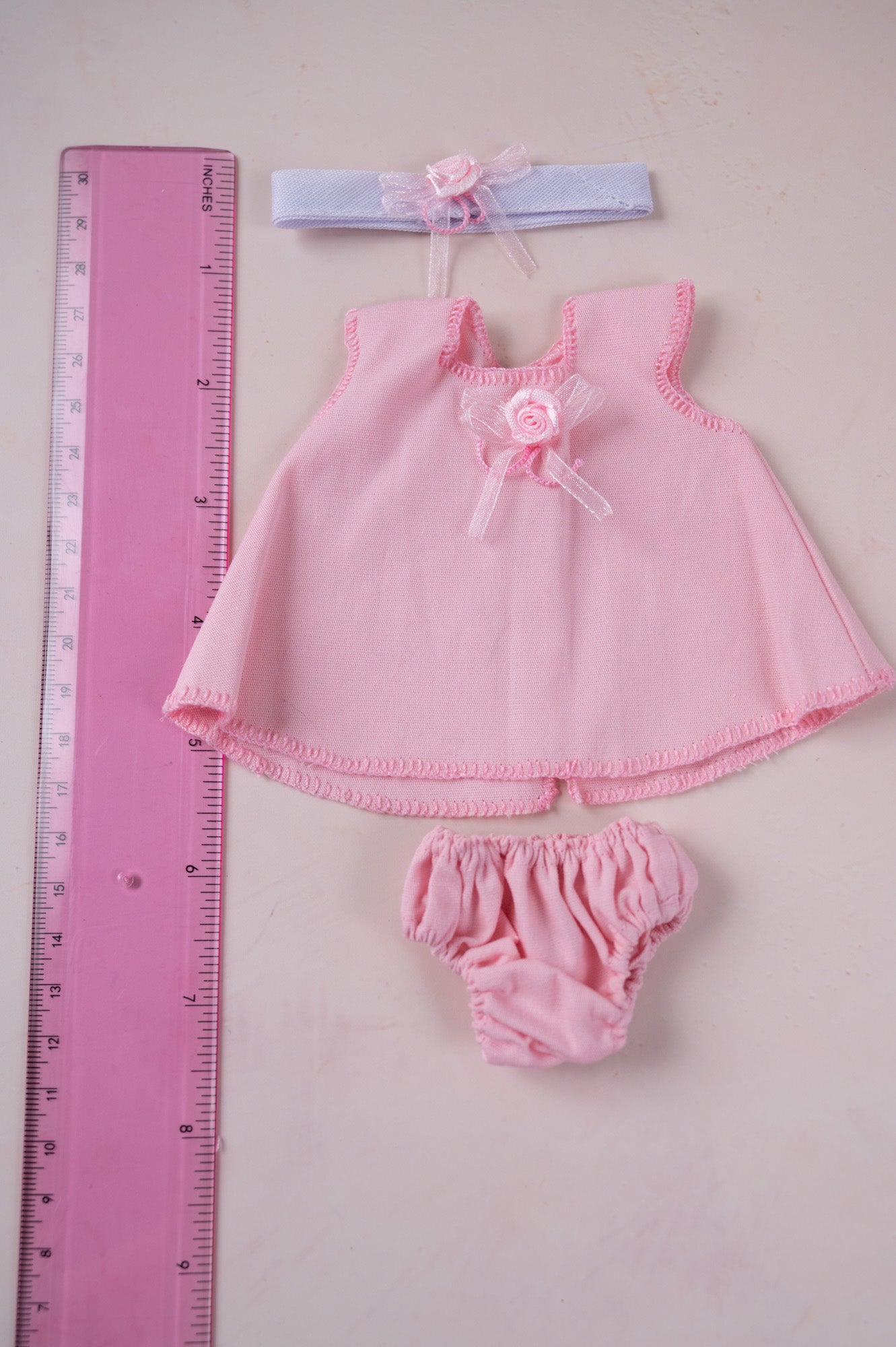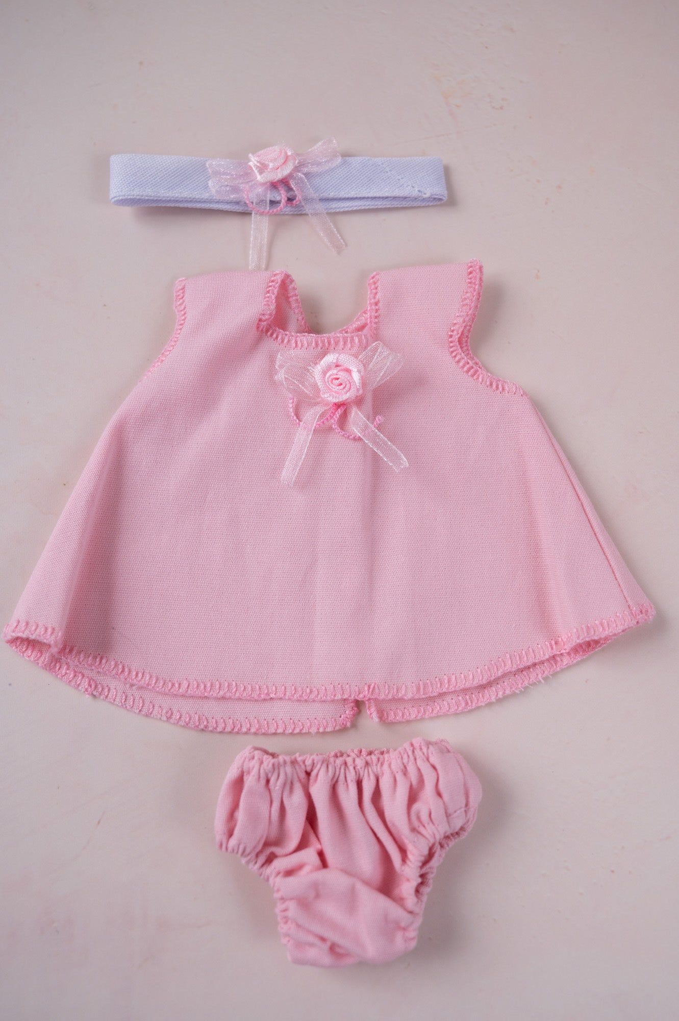 This darling light pink dress set comes with a cute matching headband and diaper cover. It's sized for 8 inch dolls.