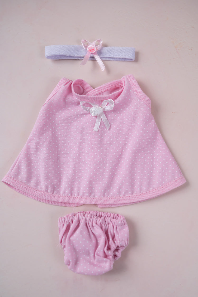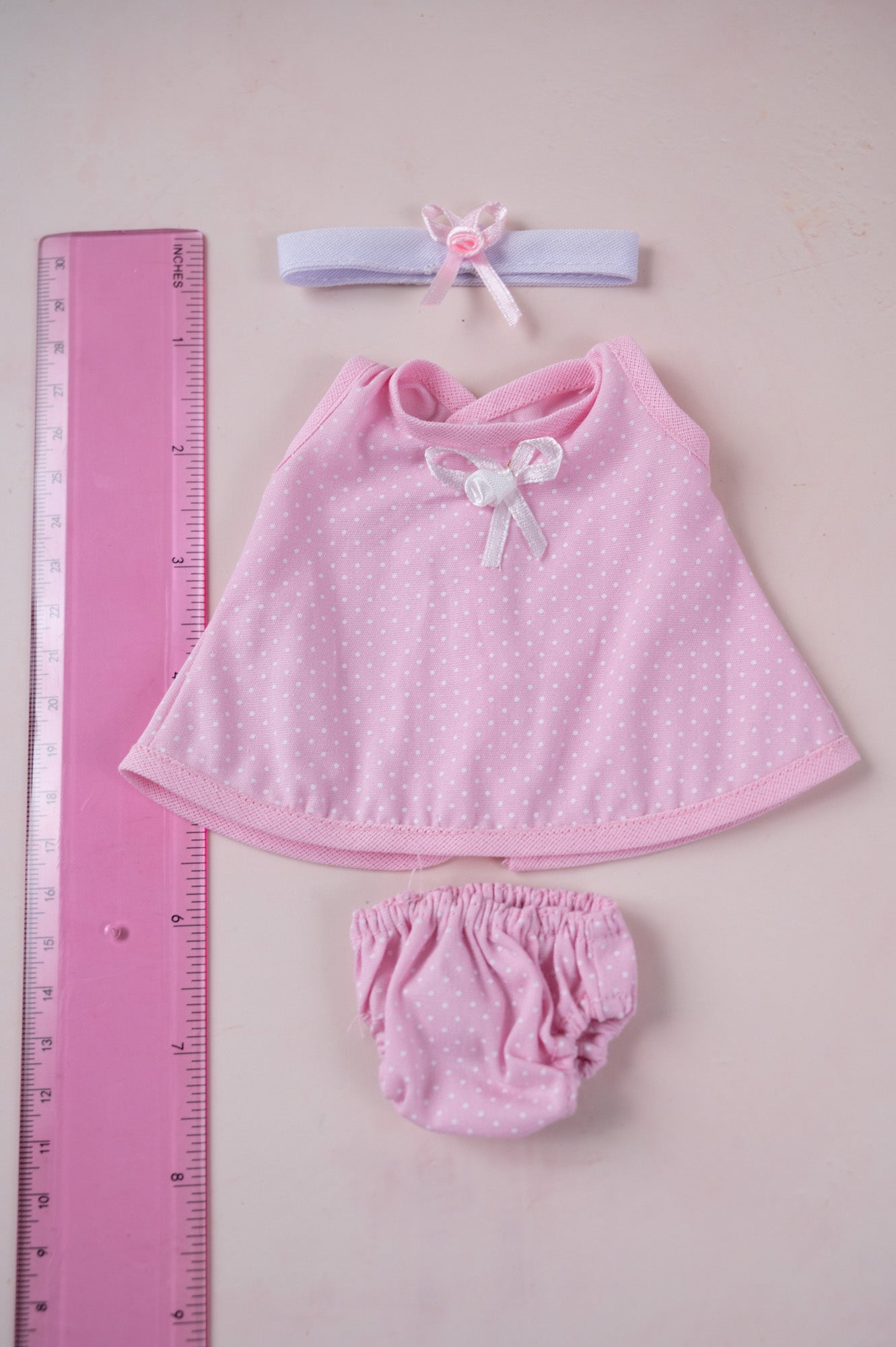 This lovely light pink polka dot dress set comes with a precious matching headband and diaper cover. It's sized for 8 inch dolls.