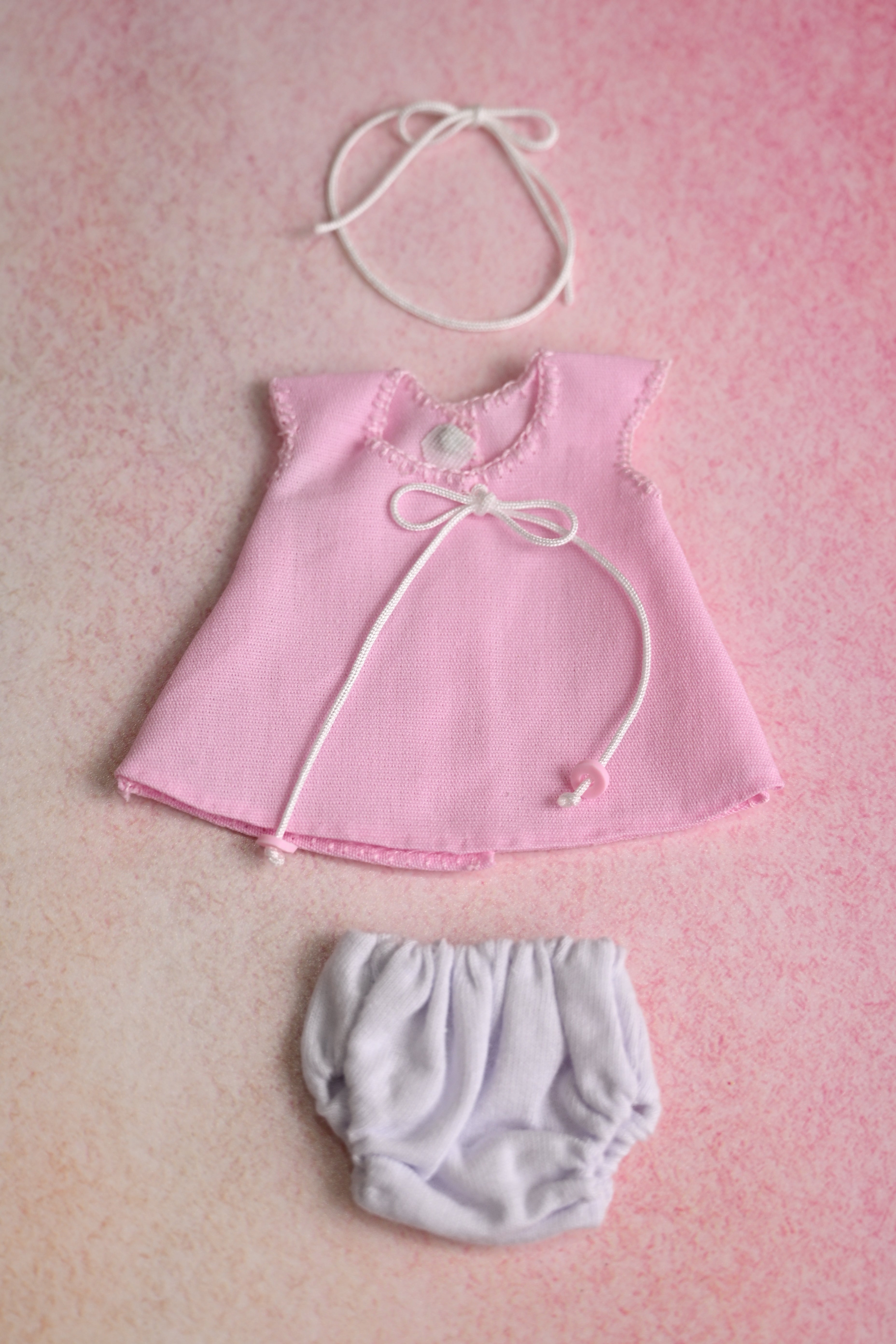 This sweet dress set includes a pink sleeveless dress adorned with a cute bow, a matching headband, and an adorable white diaper cover. This outfit is sized for 5 inch dolls.