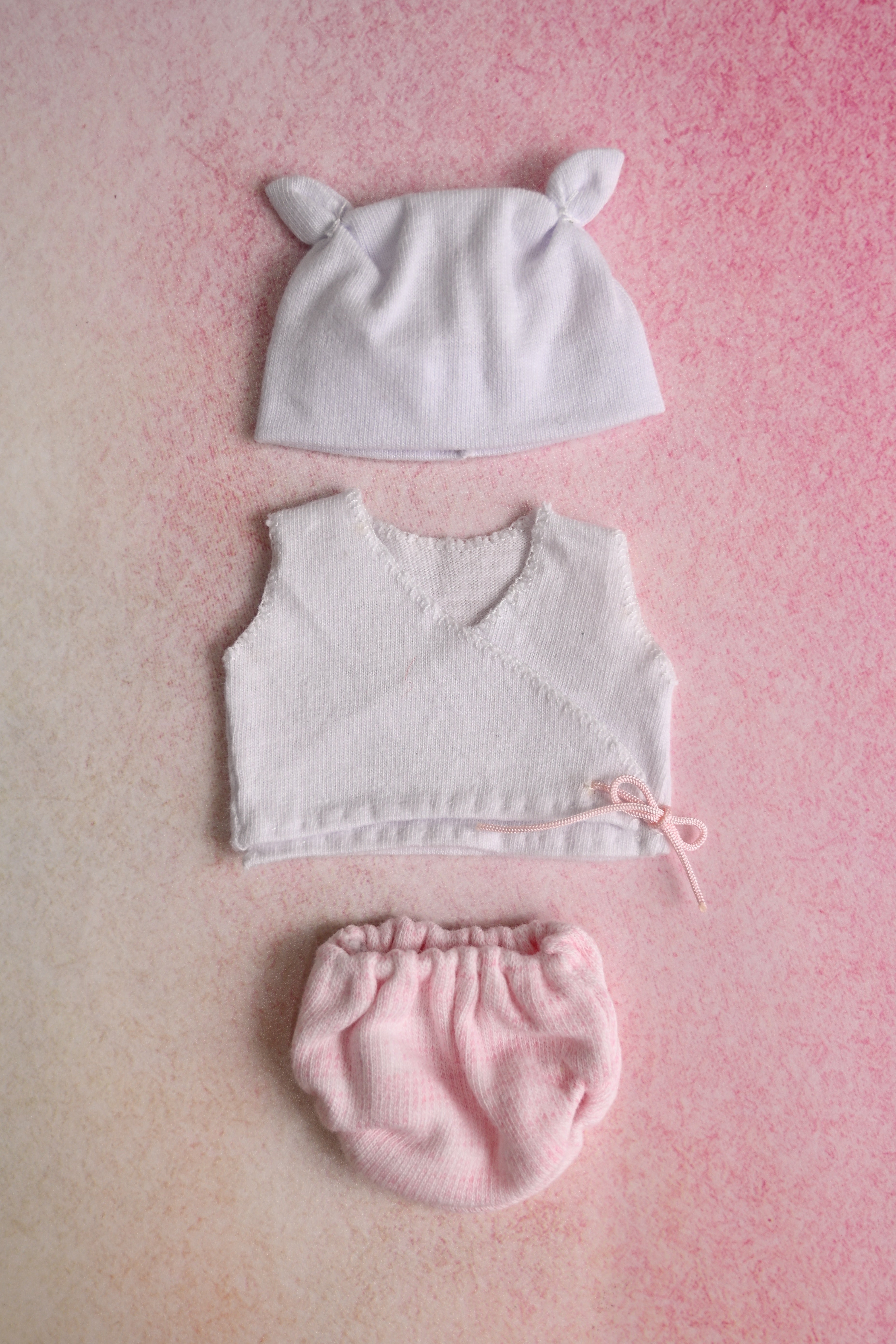 This sweet set comes with an adorable sleeveless white crossover shirt, matching hat, and cute pink diaper cover. This outfit is sized for 5 inch dolls.