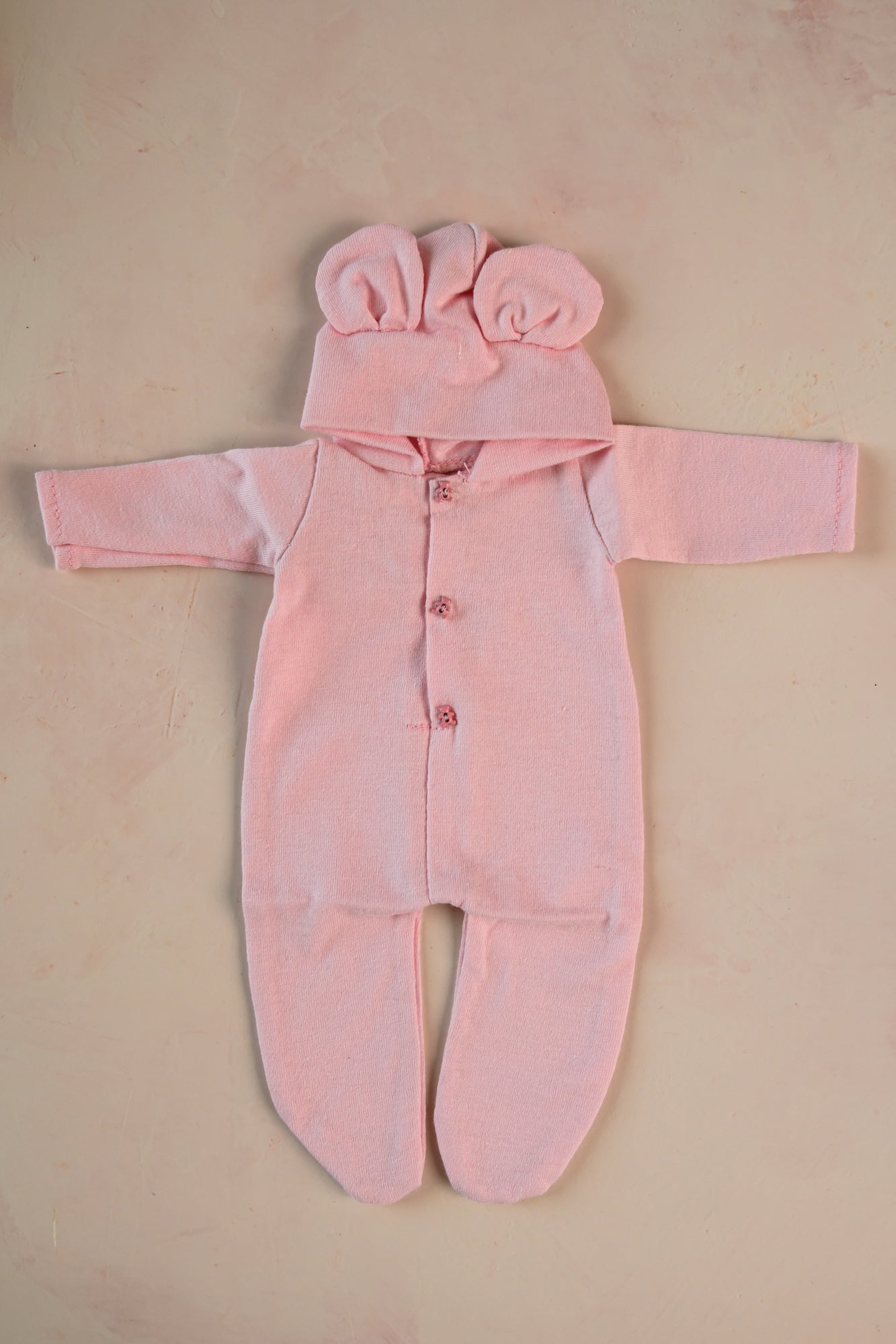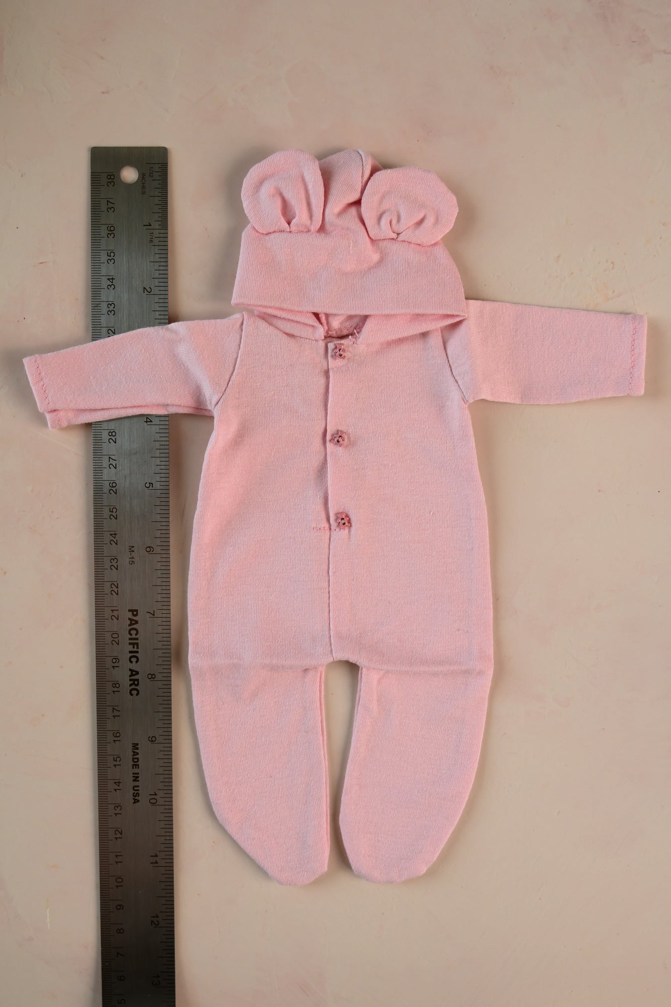 This precious pink coverall with pink bear buttons has a cozy bear hoodie attached. It's sized for 9 inch dolls.