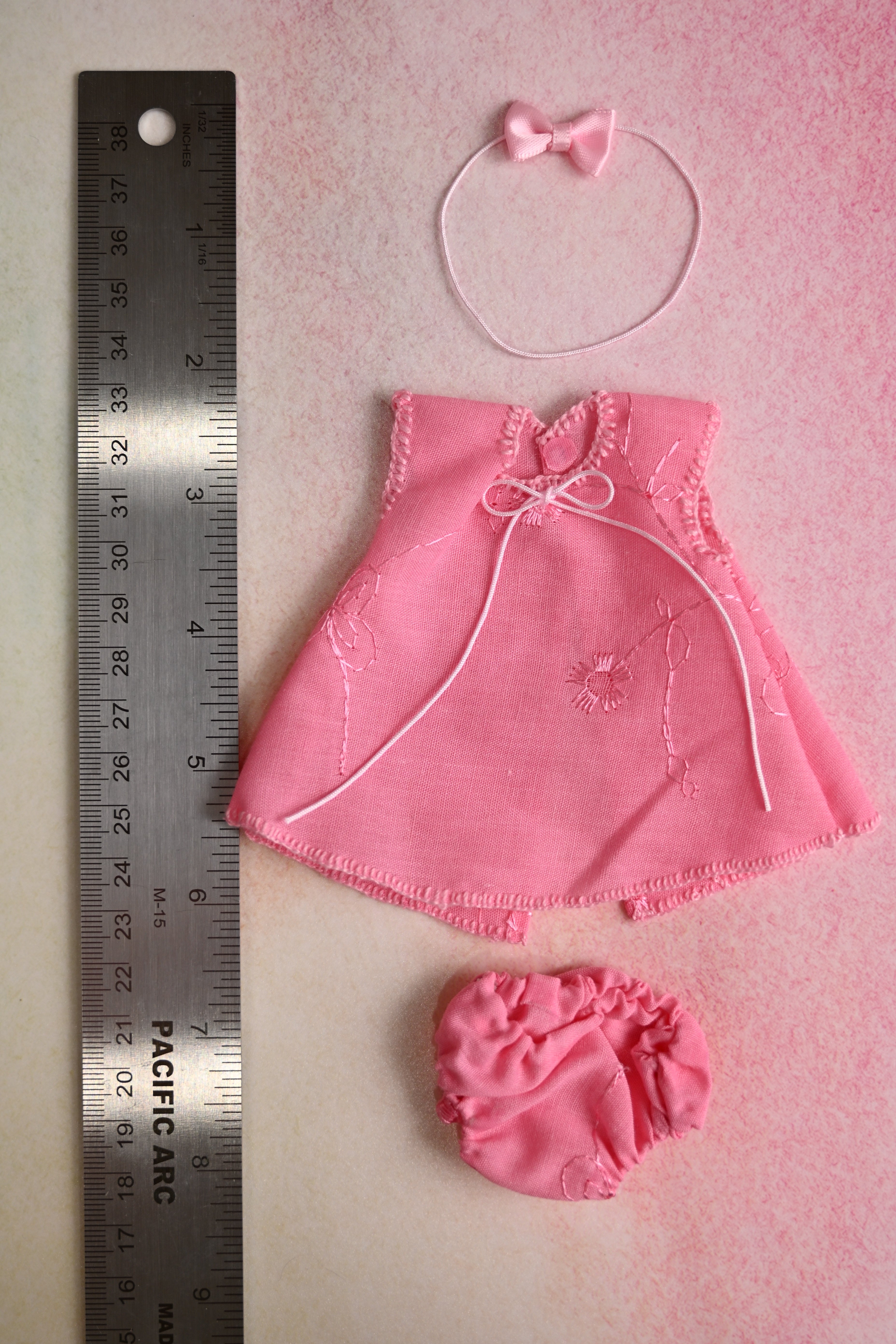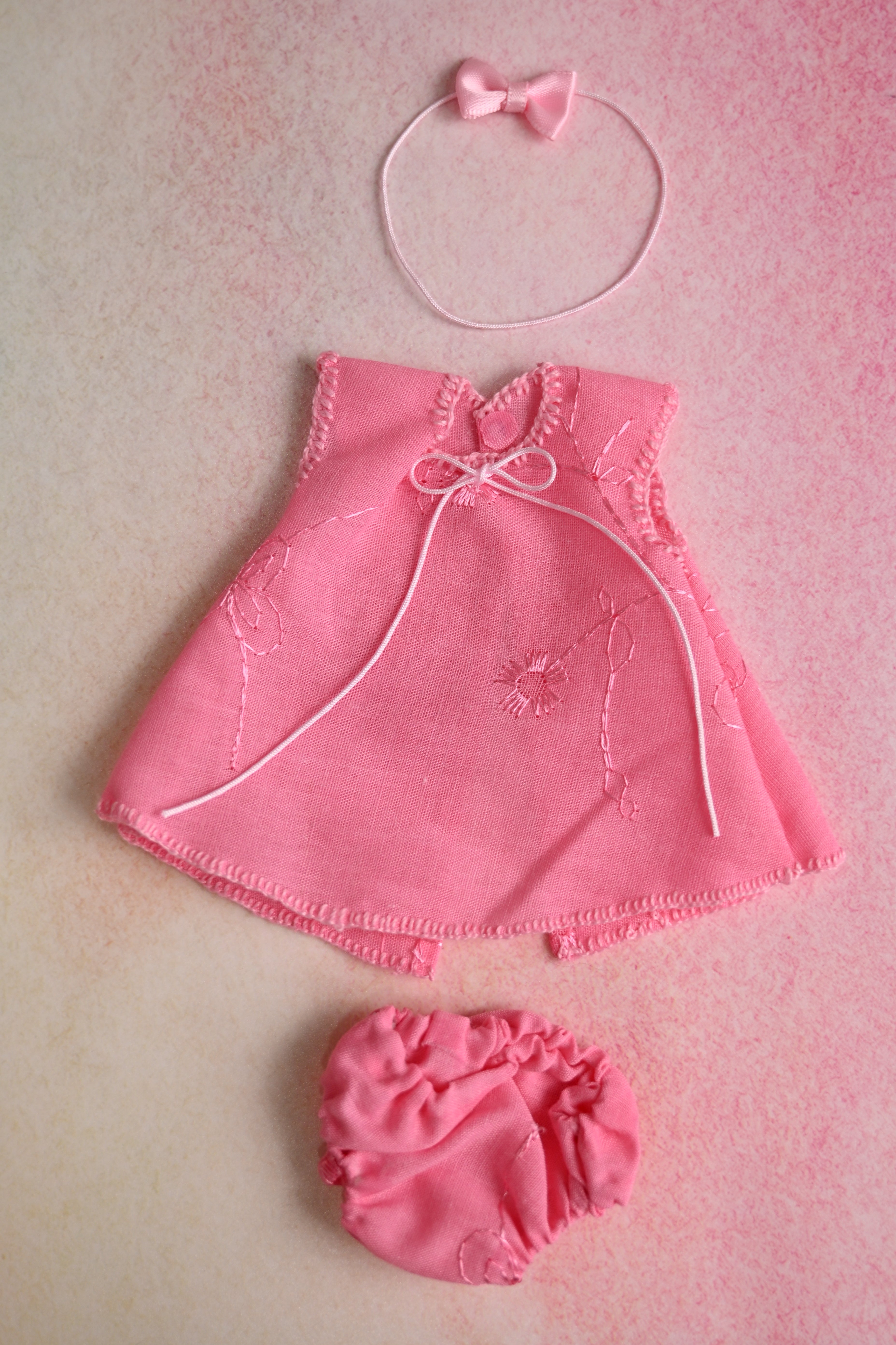 This adorable set includes a pink dress with embroidery details, a matching diaper cover, and a sweet little bow headband.. This outfit is made for 7" dolls.