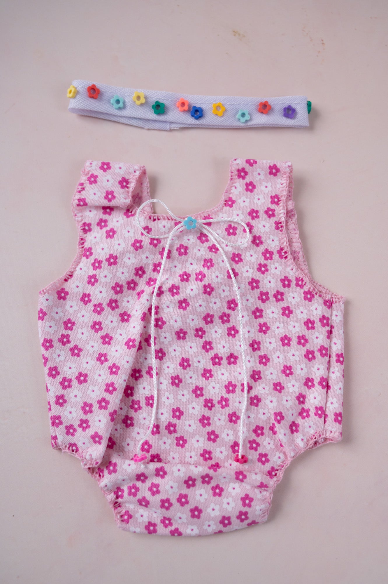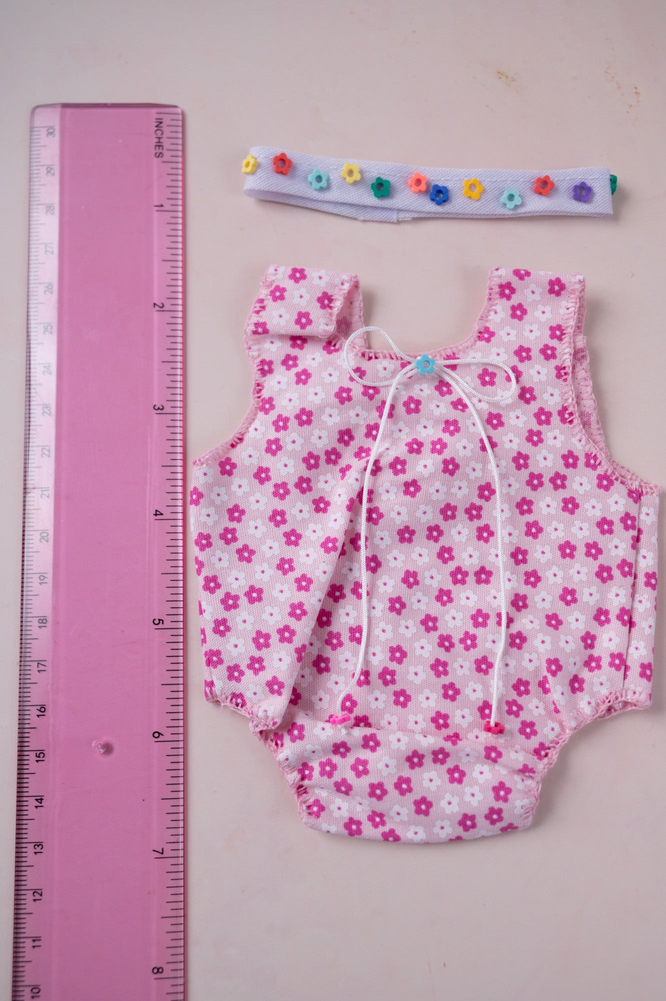 This adorable pink floral onesie with a pink bow and blue button comes with a matching diaper cover and headband with multicolored flower buttons. It's sized for 9 inch dolls.