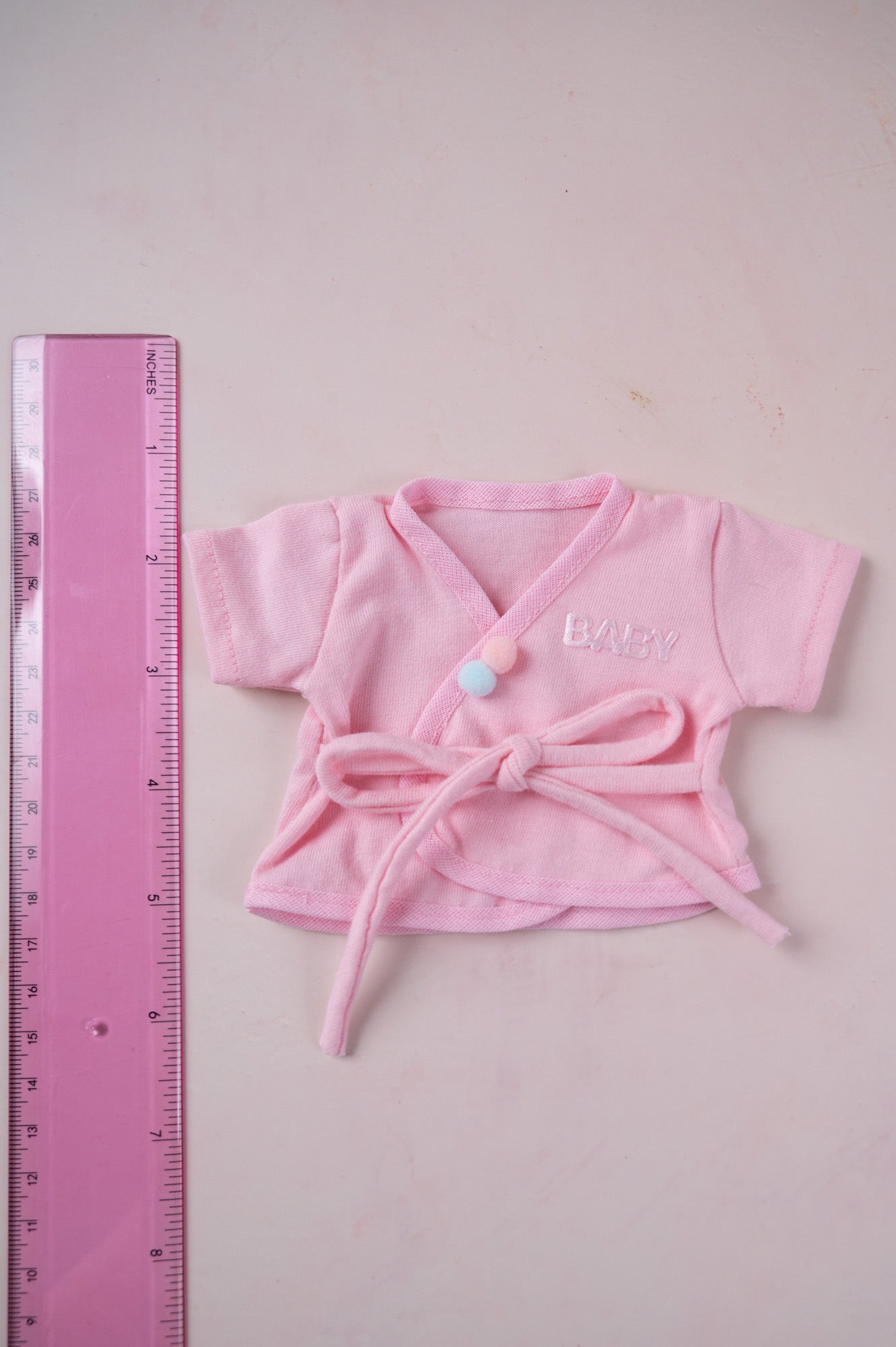This sweet pink robe with baby embroidered on it has two perfectly cute pom poms along the outer flap. It's sized for 9 inch dolls.