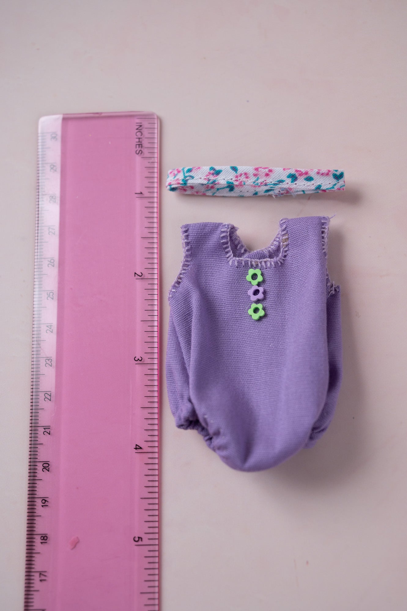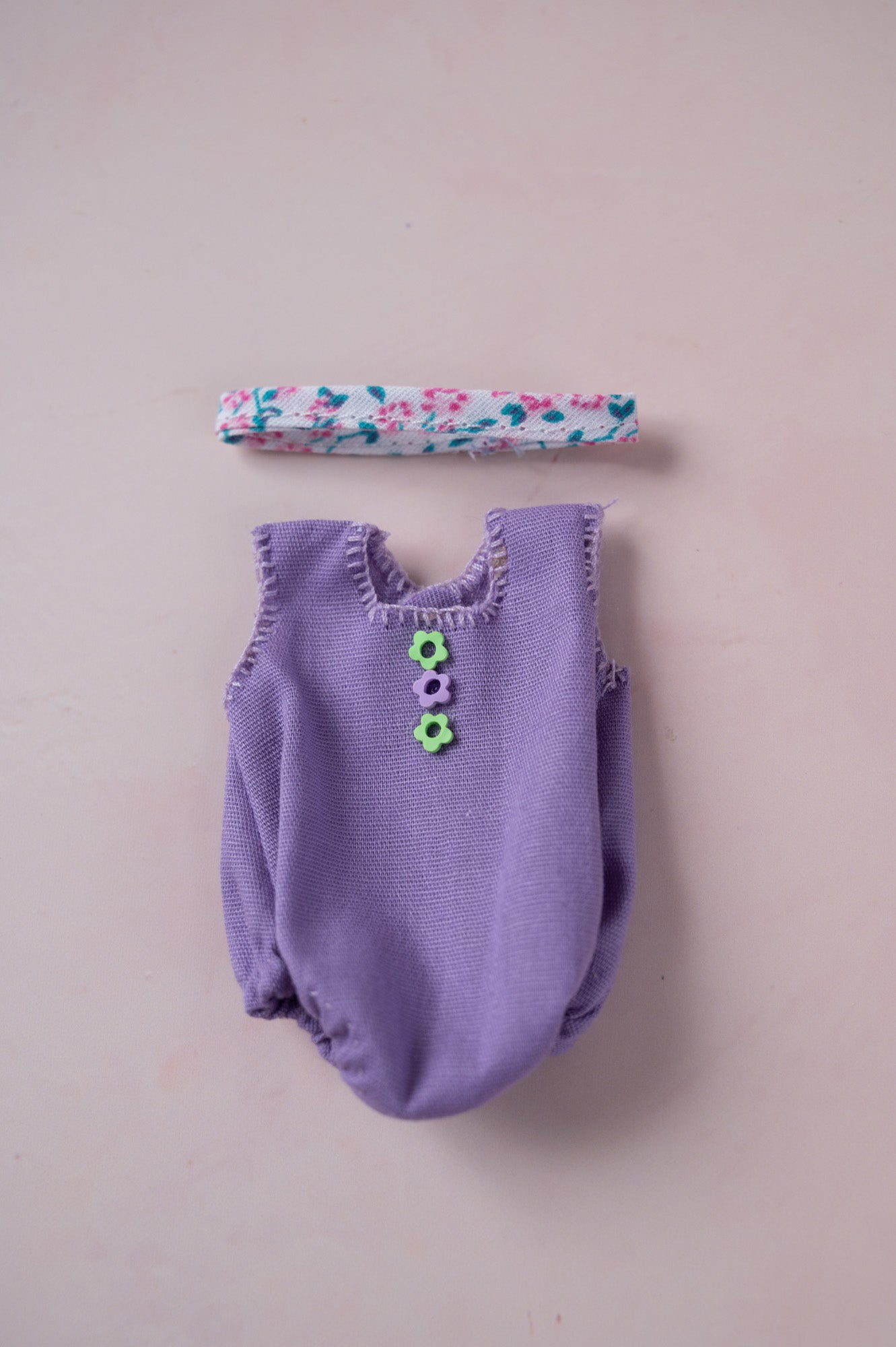 This dainty purple romper with green and purple flower buttons comes with a cute floral headband. It's sized for 5 inch dolls.
