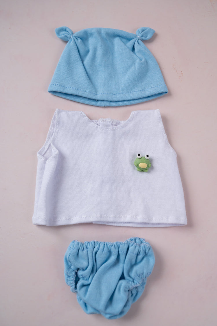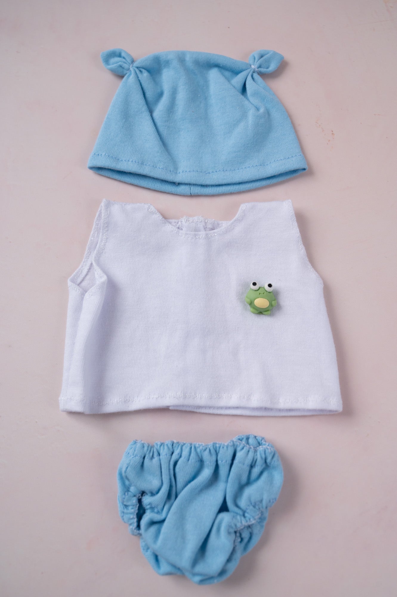 This cute set includes a white shirt with a frog button, a blue diaper cover, and an adorable matching hat. It's sized for 9 inch dolls.