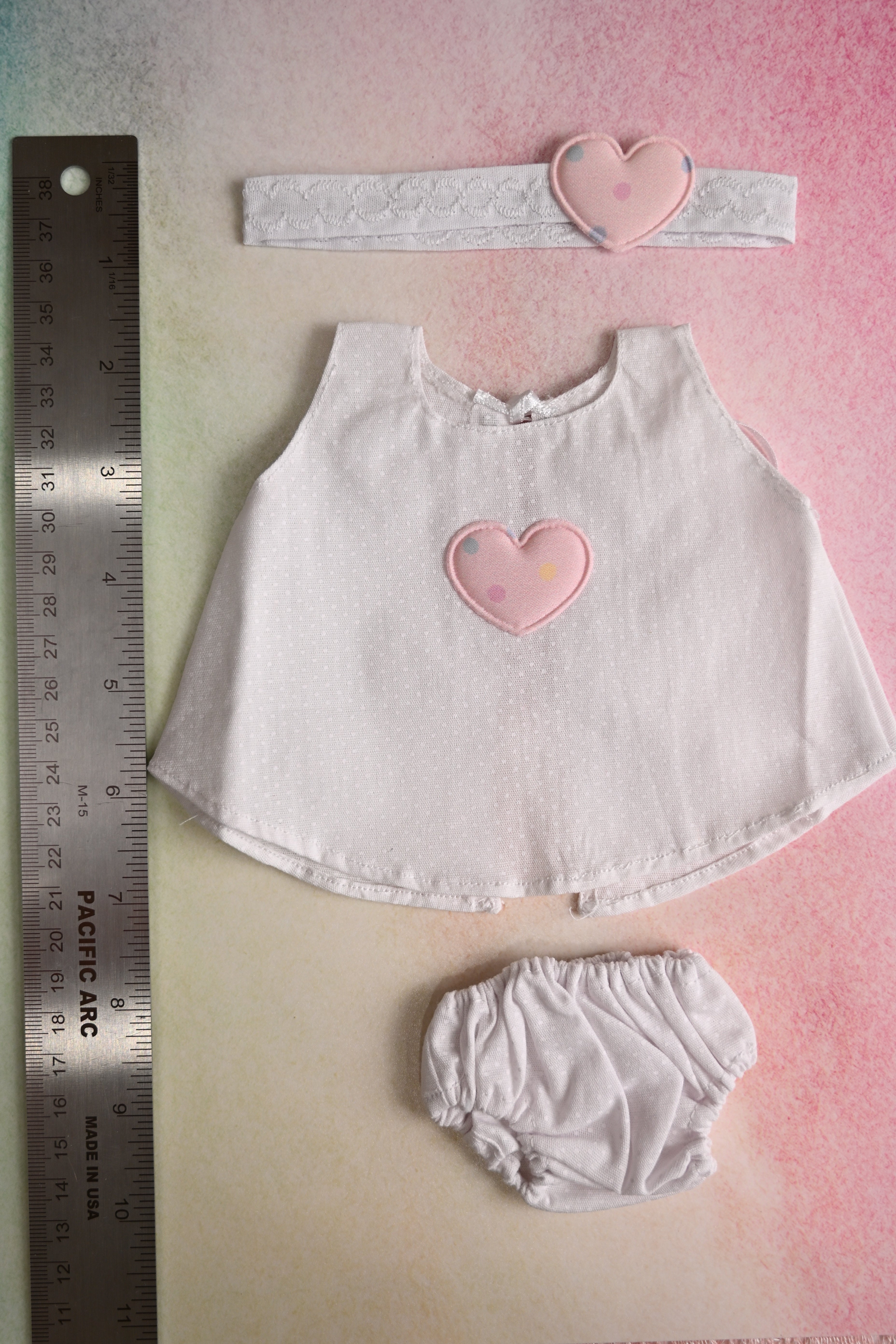 This sweet set includes a white dress with a pink heart, a matching diaper cover, and an adorable heart headband. This outfit is sized for 12-13" dolls.