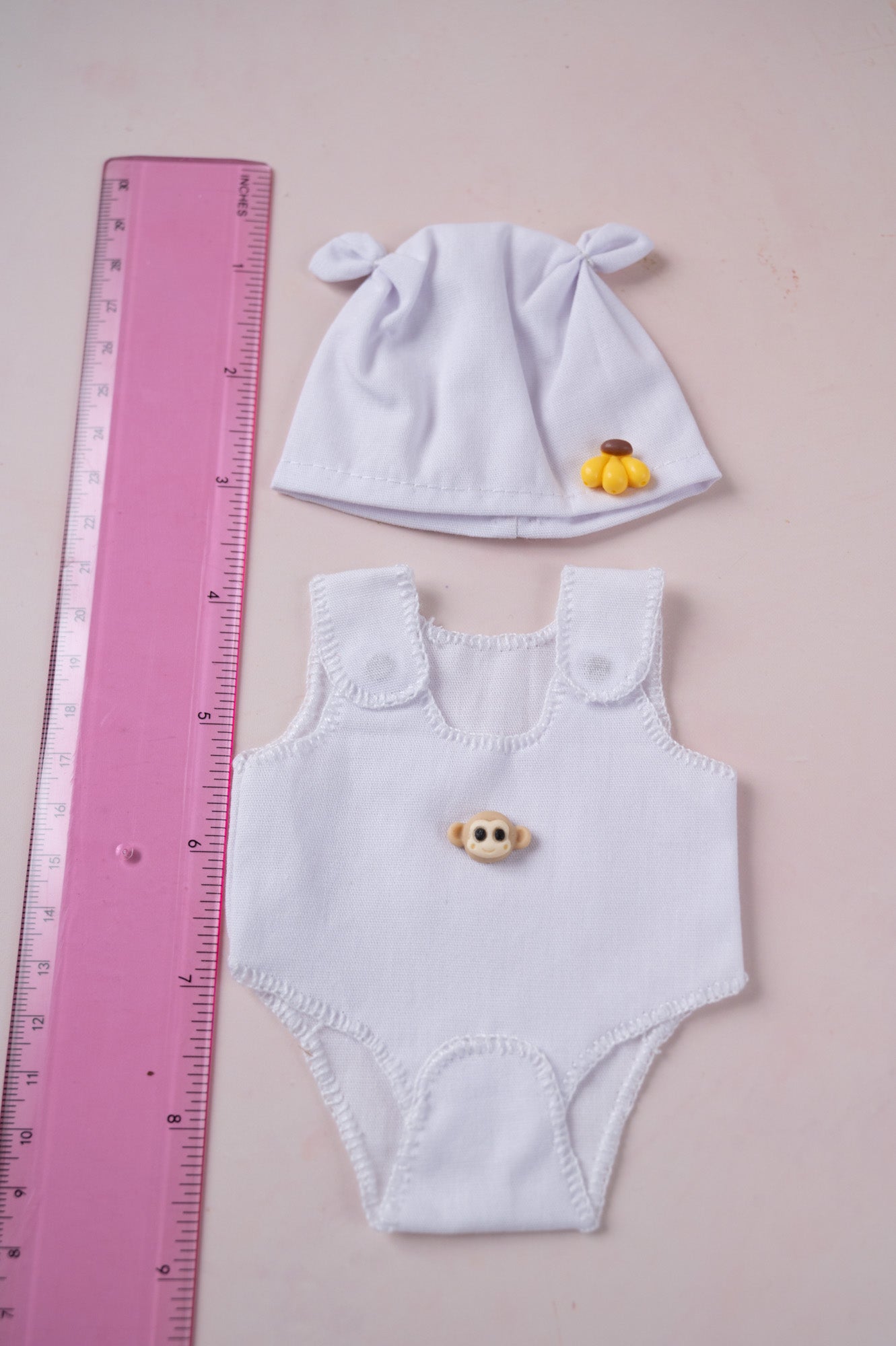 This adorable white onesie with a monkey button comes with a cute matching hat with a banana button. It's sized for 9 inch dolls.