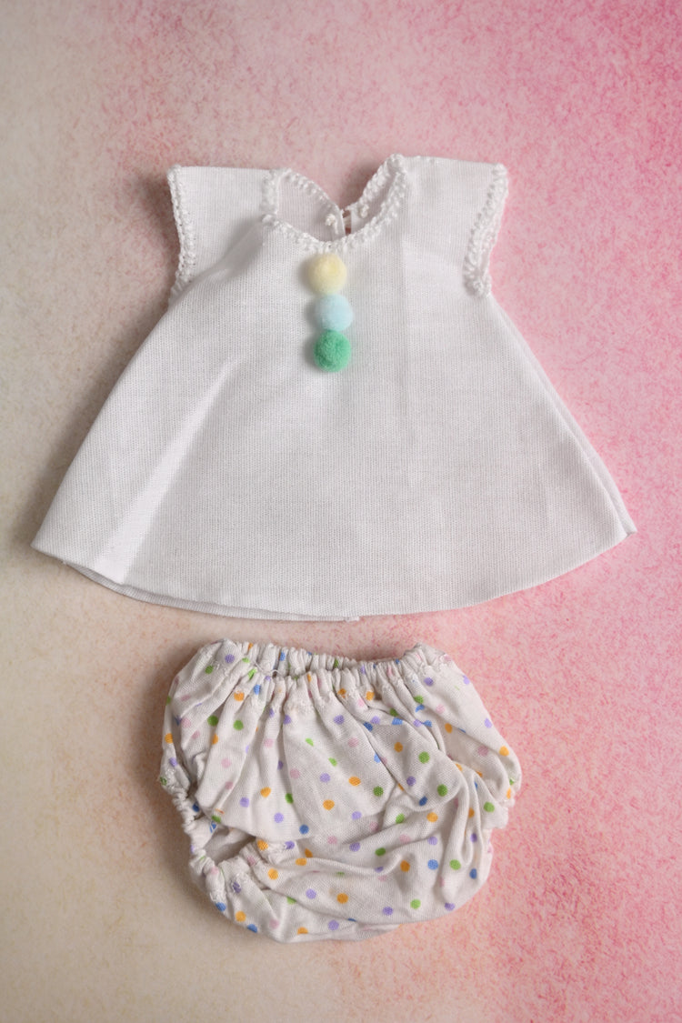 This fun set includes a white sleeveless dress adorned with pom poms and a colorful polka dot diaper cover. This outfit is sized for 7" dolls.