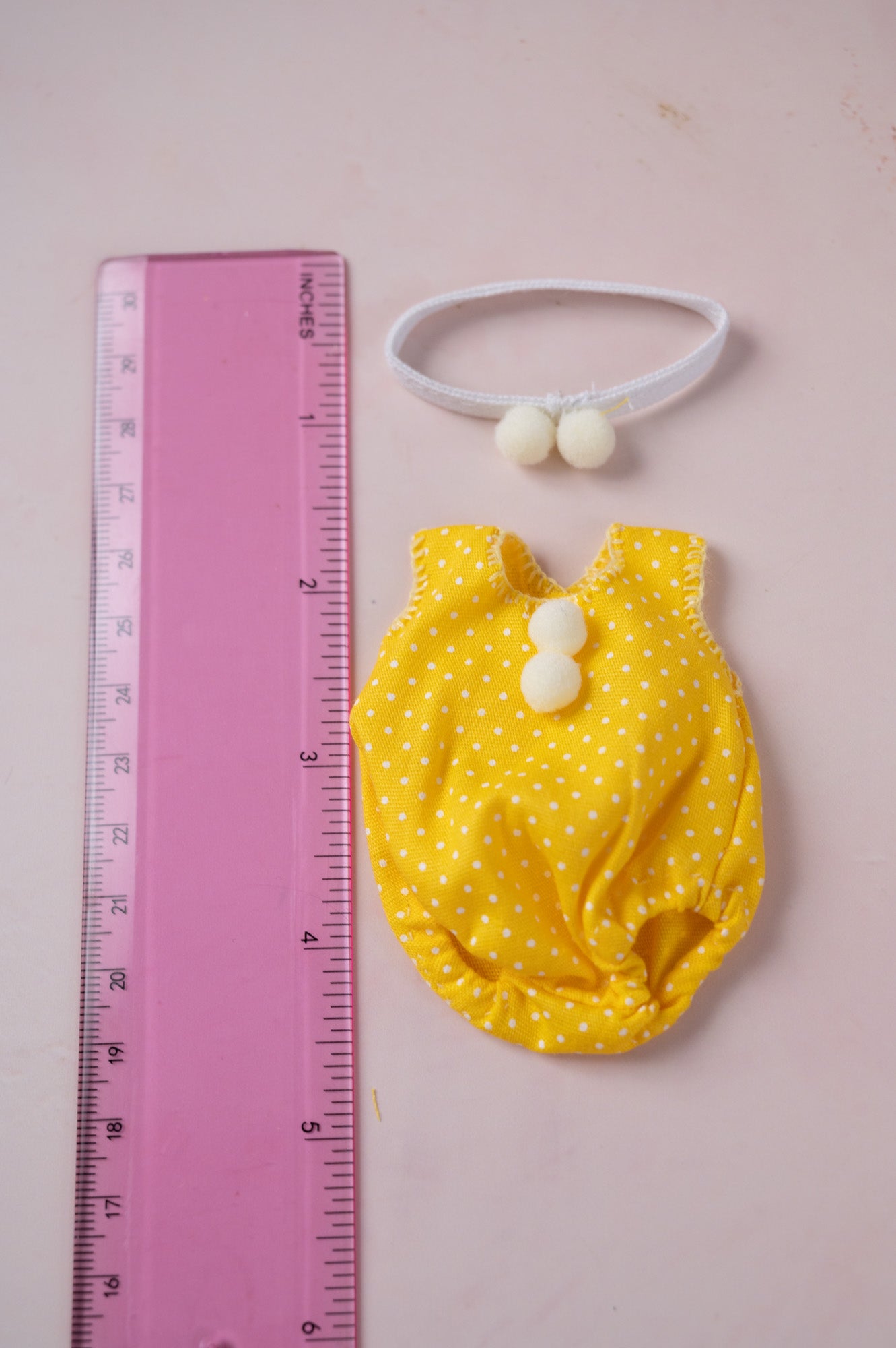 This fun yellow romper with pom poms comes with an adorable matching headband. It's sized for 5 inch dolls.