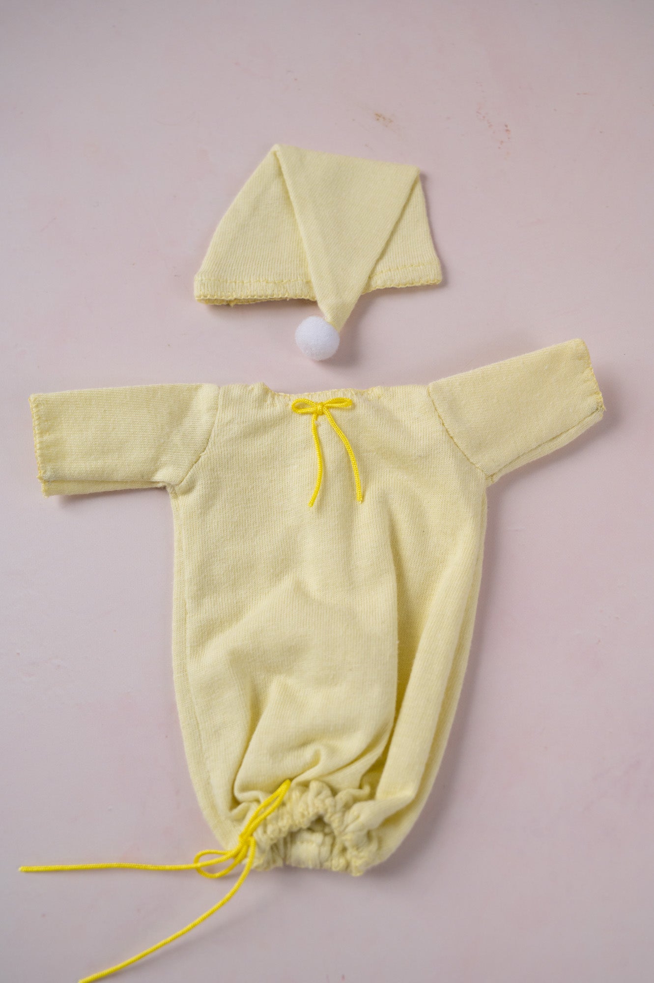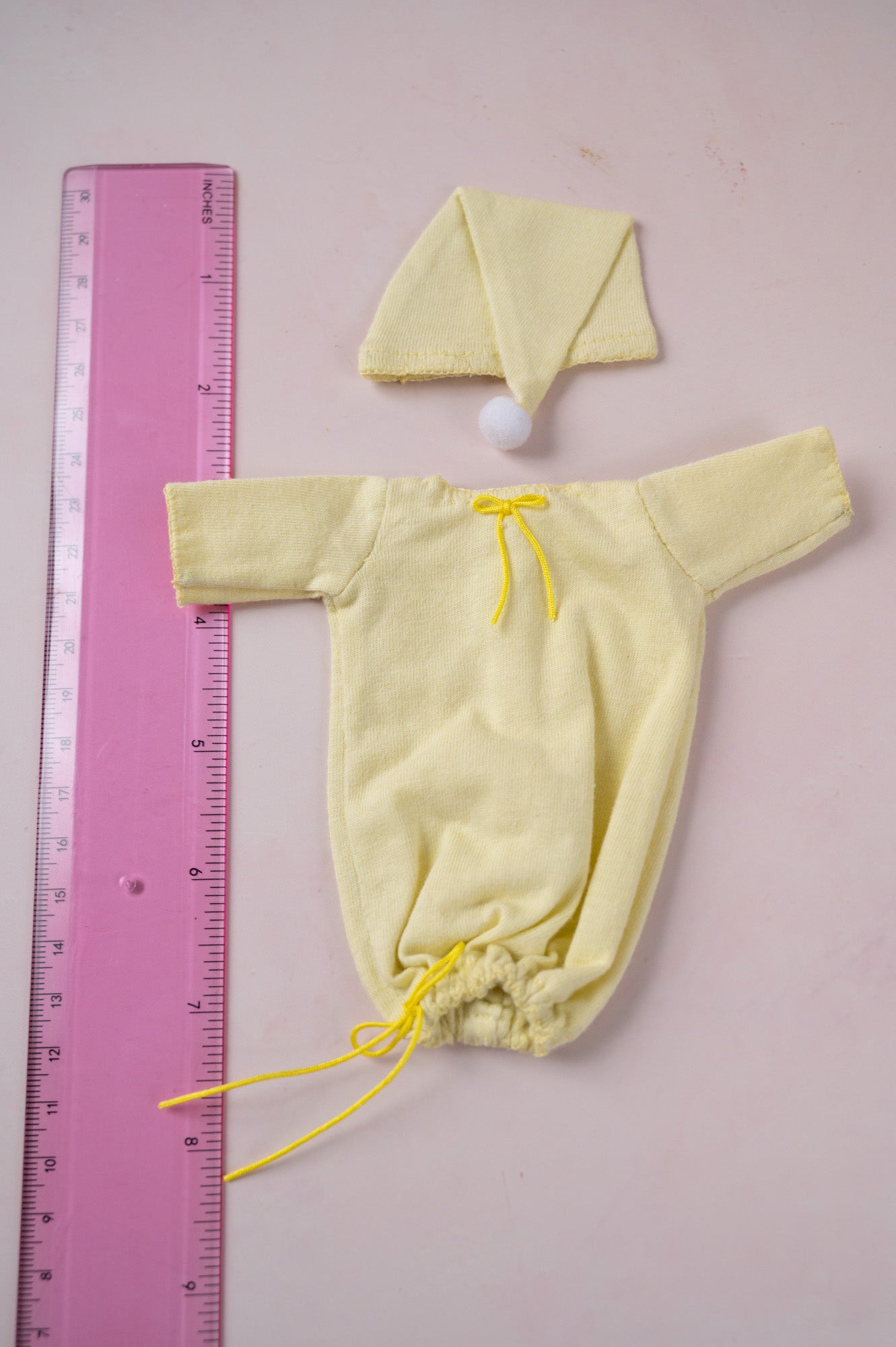 This adorable yellow sleeper with tiny bows includes a precious matching hat with a pom pom. It's sized for 5 inch dolls.