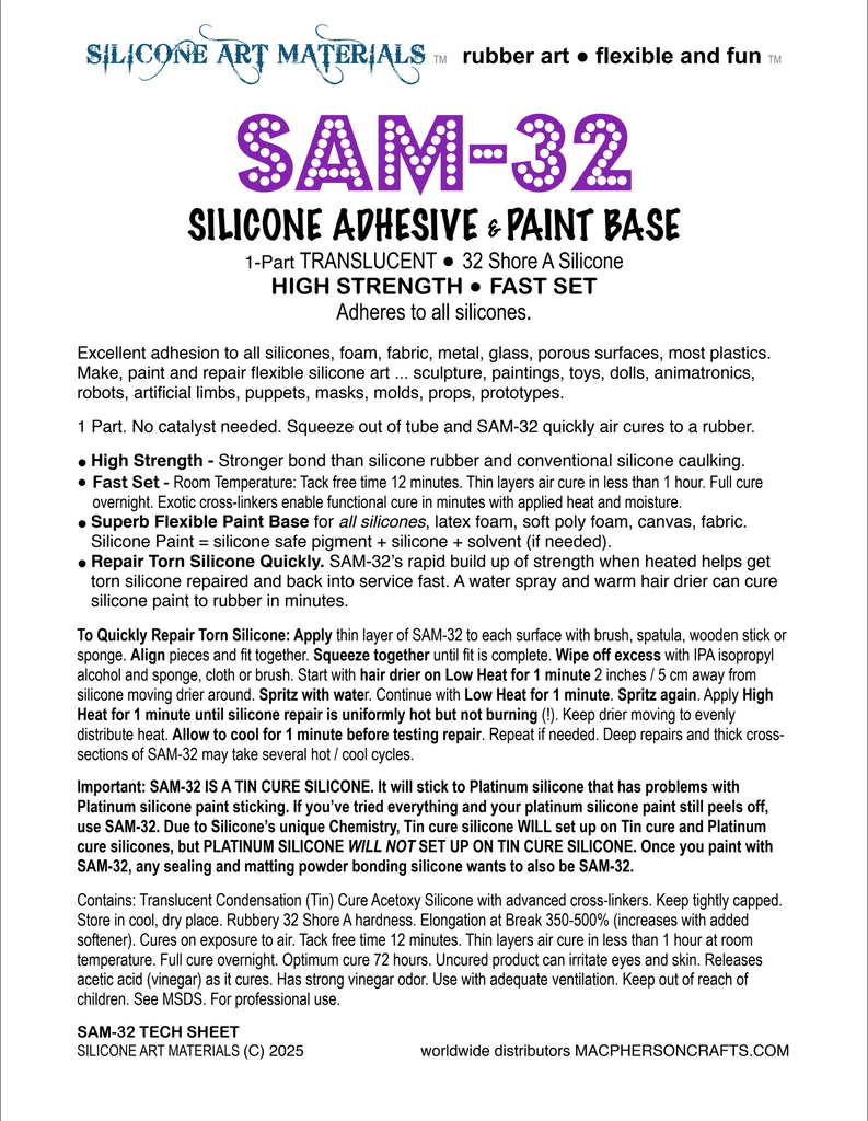 This is a 3 ounce tube of silicone adhesive and paint base created by Silicone Art Materials. SAM-32 cures quickly to all silicone types when it meets the air, making it great for repairs.