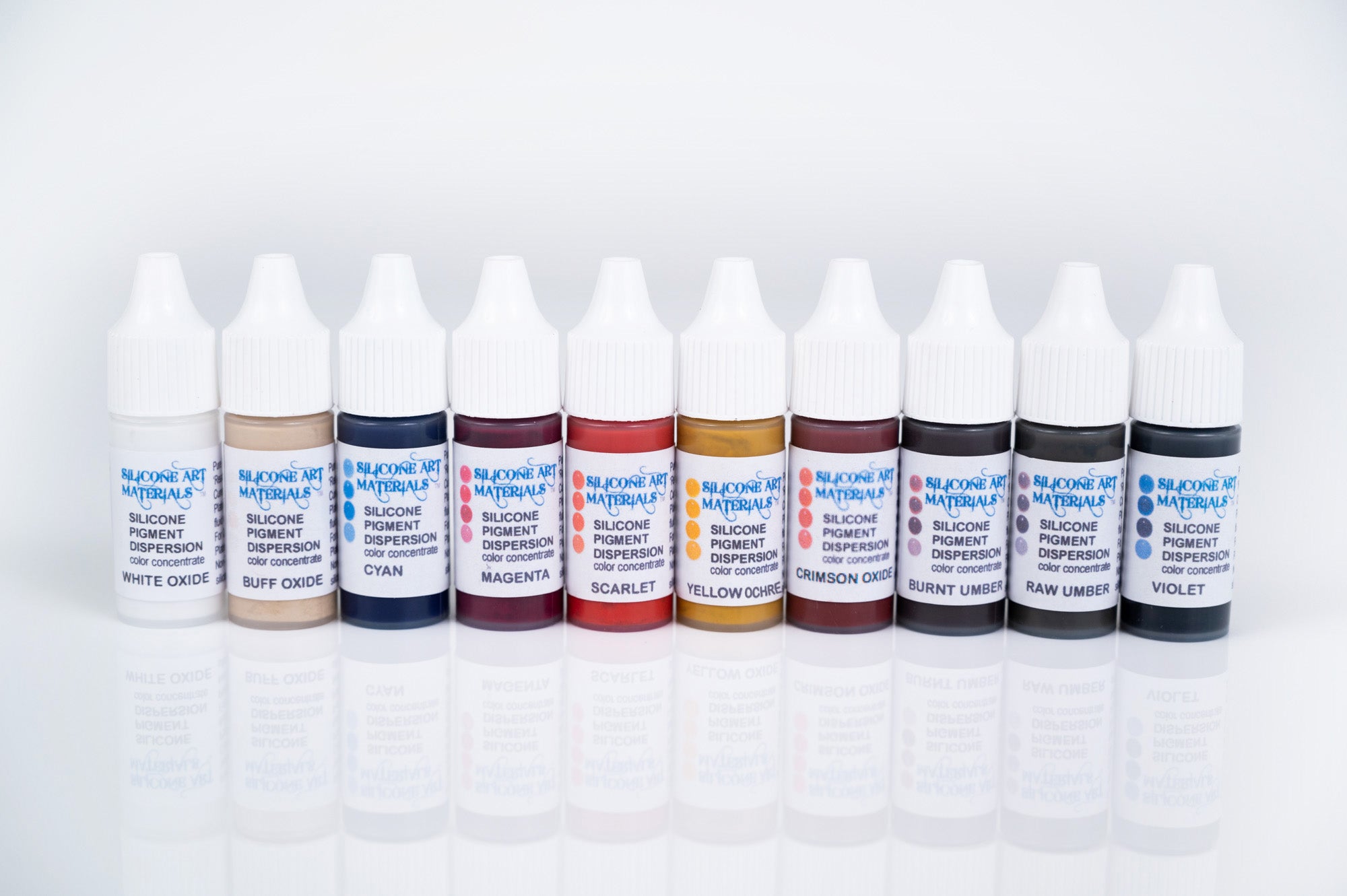 This is a set of 10 bottles of Silicone Art Materials (SAM) liquid silicone color concentrates, in a collection of my favorite colors to use for painting babies! SAM pigments are used to create and mix colors for painting silicone. Each bottle is 1/4 ounce and is intended to be blended with a silicone paint base.