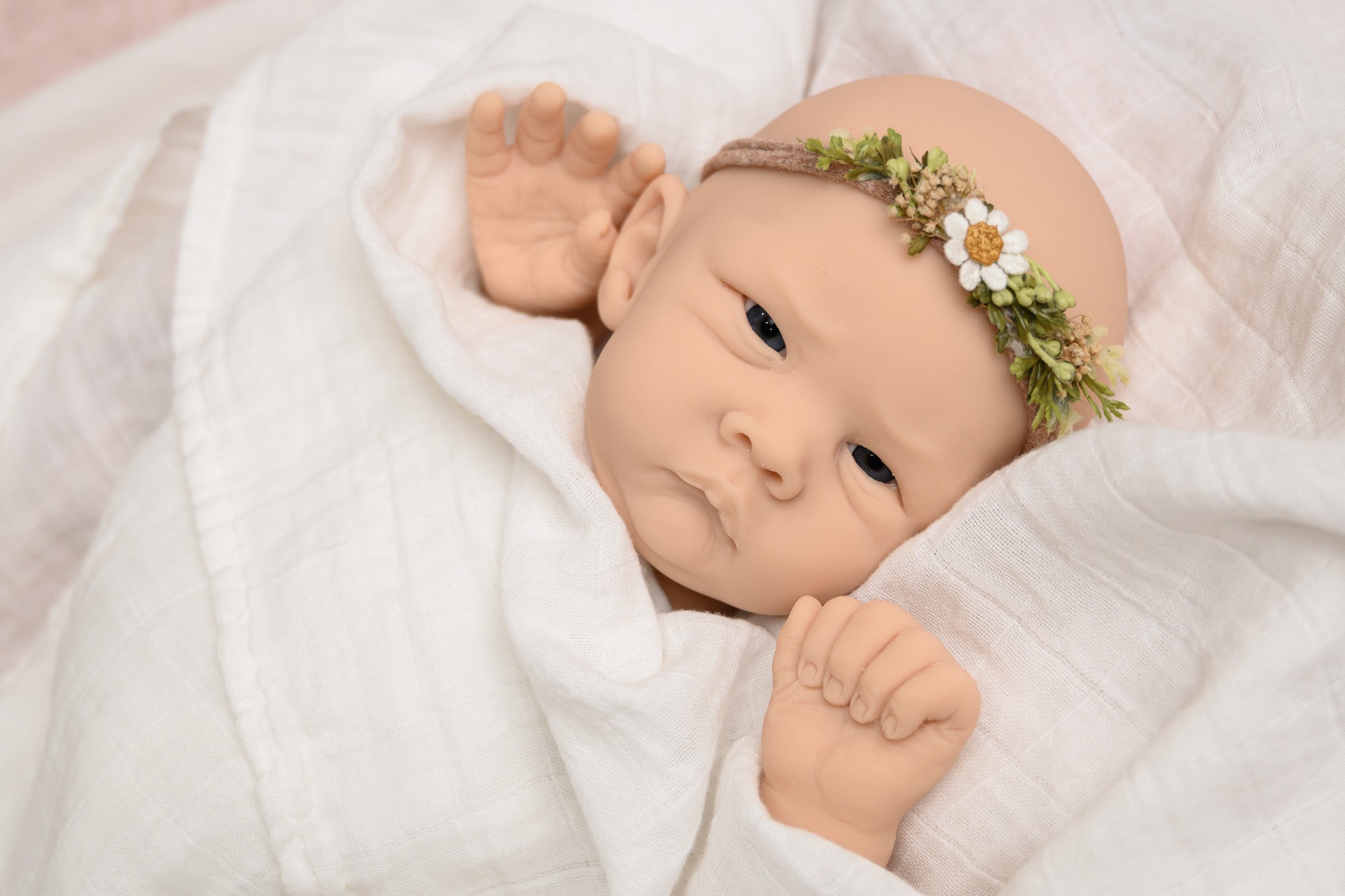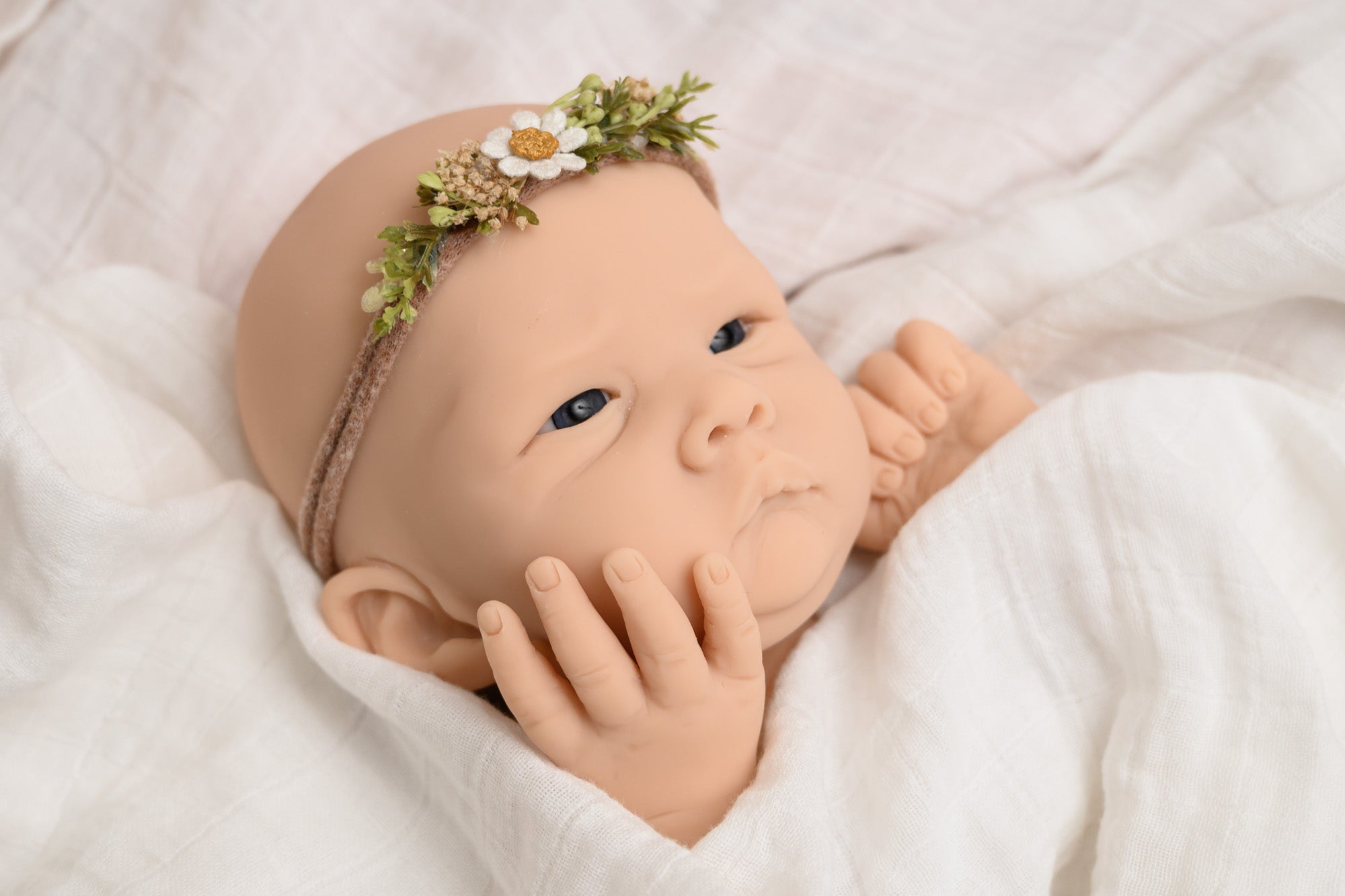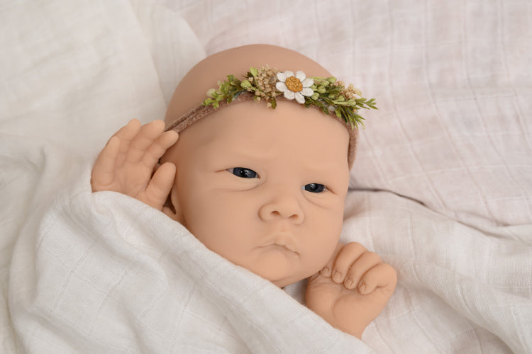Baby Jia, sculpted by Bonnie Sieben, is an 18-20 inch cuddle silicone baby with a precious wide-eyed expression and optional hands. Jia's sweet little cheeks are very squishable, as he/she is cast in EcoFlex 20 silicone. Jia's mouth was sculpted open and can take a preemie pacifier.