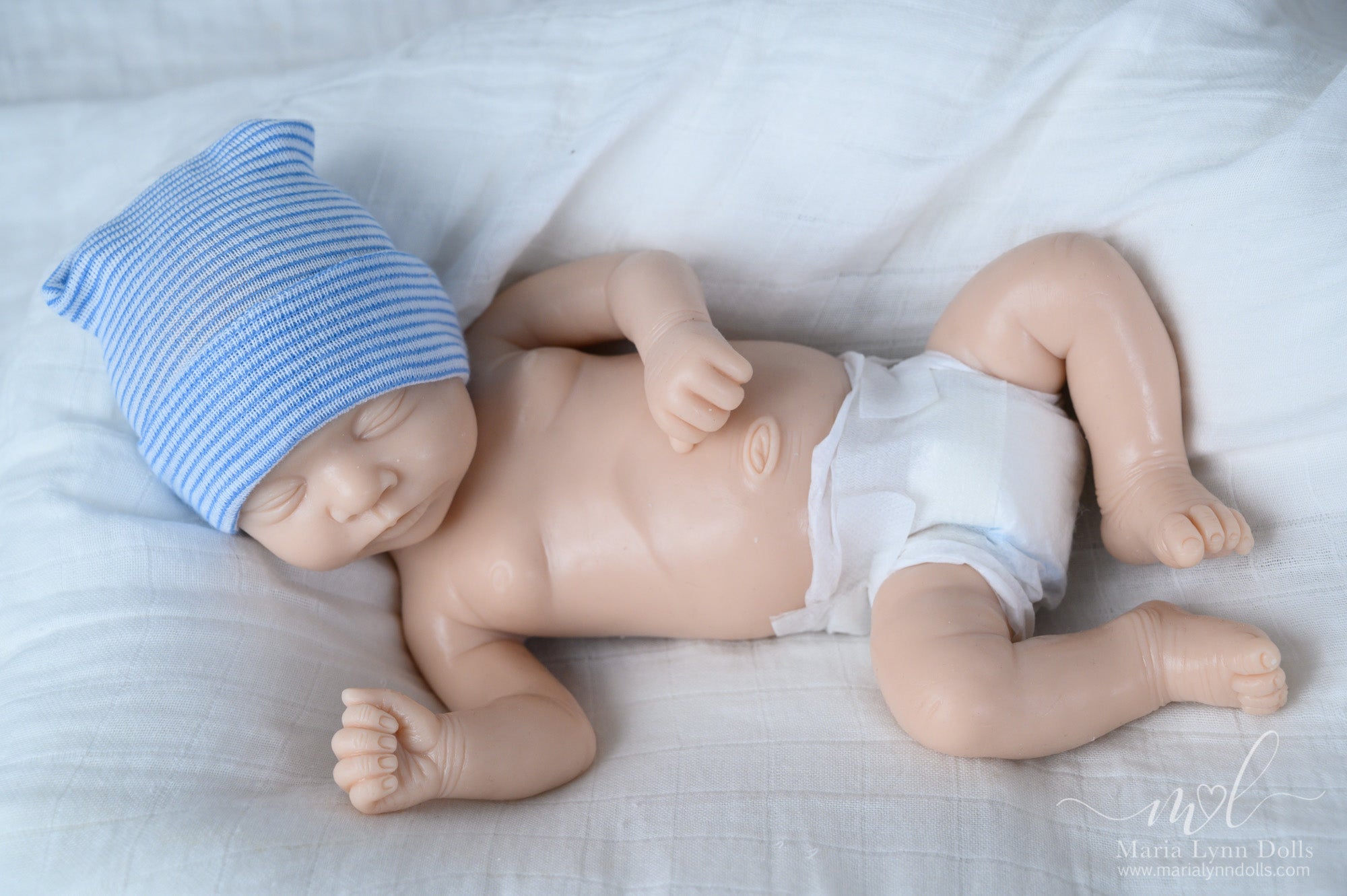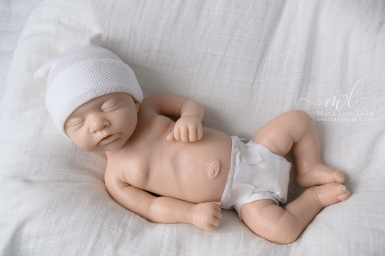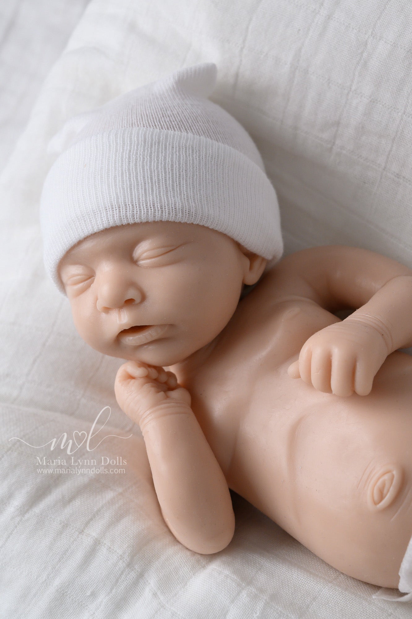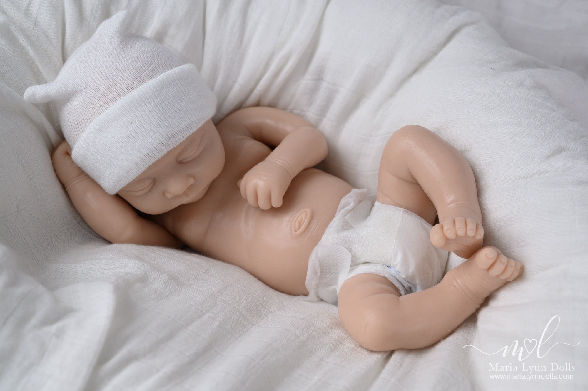 Adorable preemie baby Kian is ready to ship in Soft Blend silicone. His mouth comes opened with a tongue sculpted inside so he can take a preemie pacifier. Baby Kian is poured in the best quality platinum silicone and feels so real in your arms! This kit has posing armatures in his arms and legs so he can pose his arms and legs, adding to the realism!