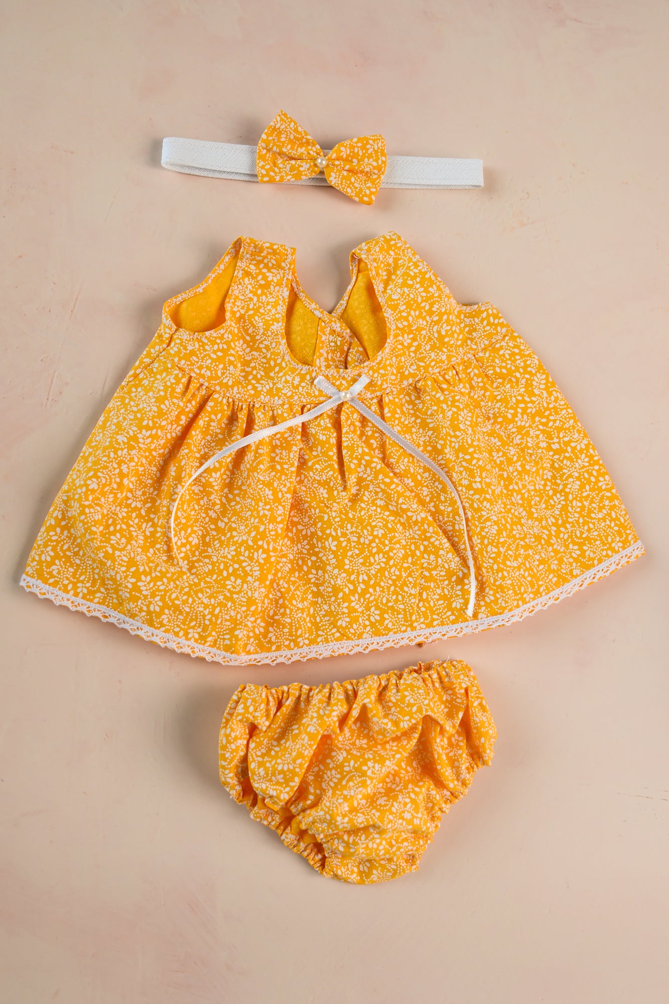 This fun yellow dress set with a foliage pattern comes with an adorable matching bow headband and diaper cover. It's sized for 12 to 13 inch dolls.